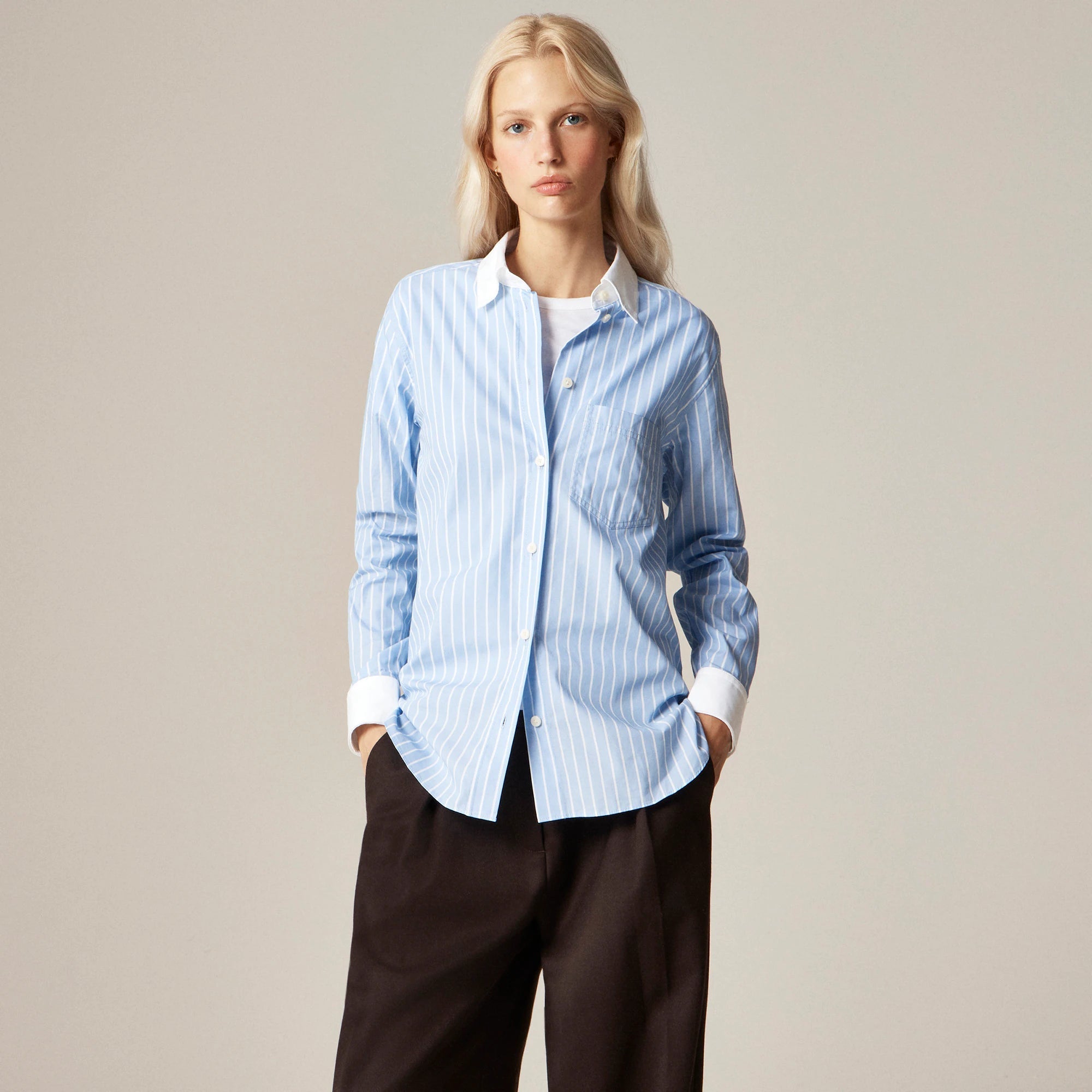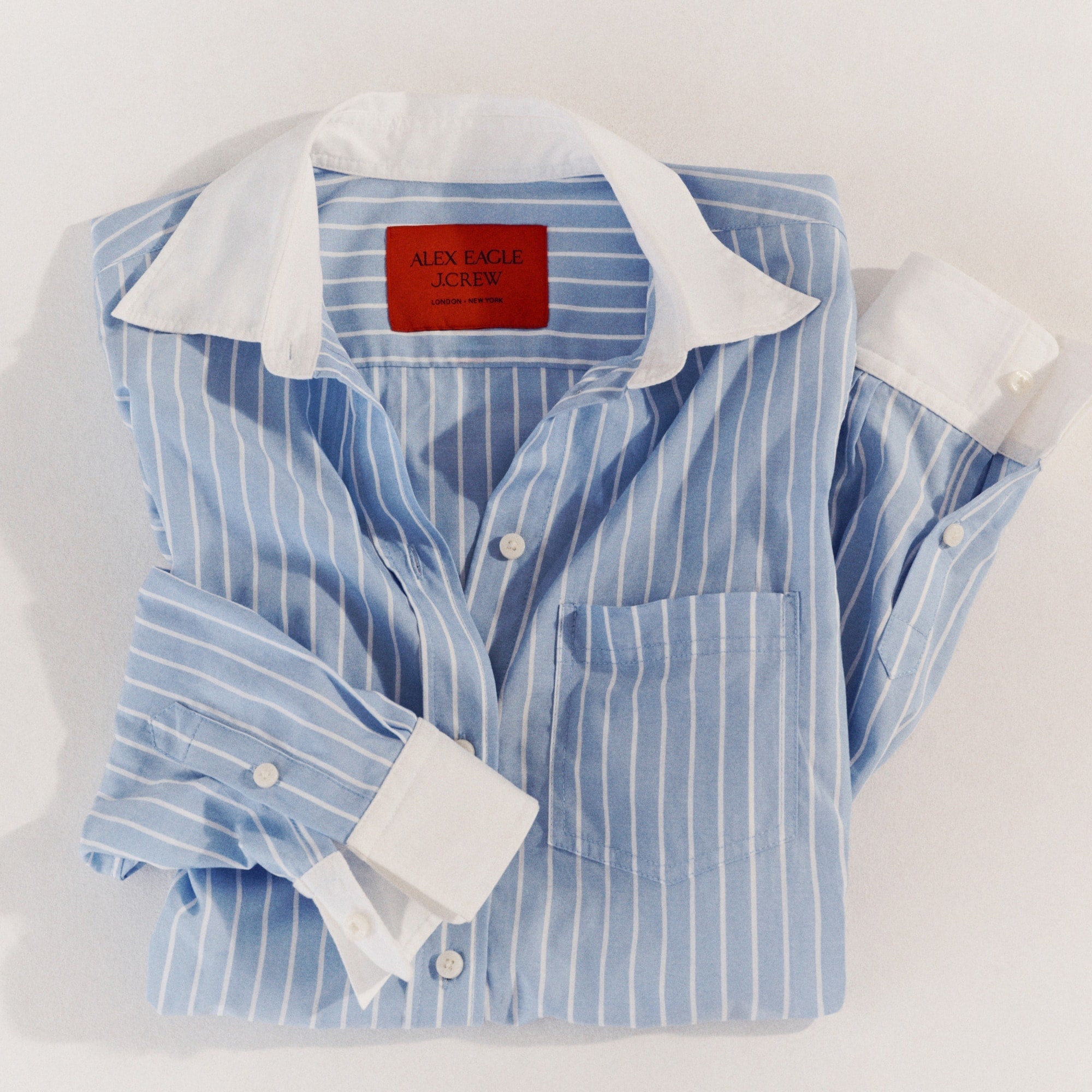 Introducing Alex Eagle X J.Crew. We collaborated with the London-based creative director and designer Alex Eagle on a capsule of timeless pieces infused with her brand's signature tailoring and sporty touches. Tailored in crisp 100 percent cotton, it comes with clean vertical stripes, plus a contrasting collar and cuffs for a subtle nod to heritage menswear.