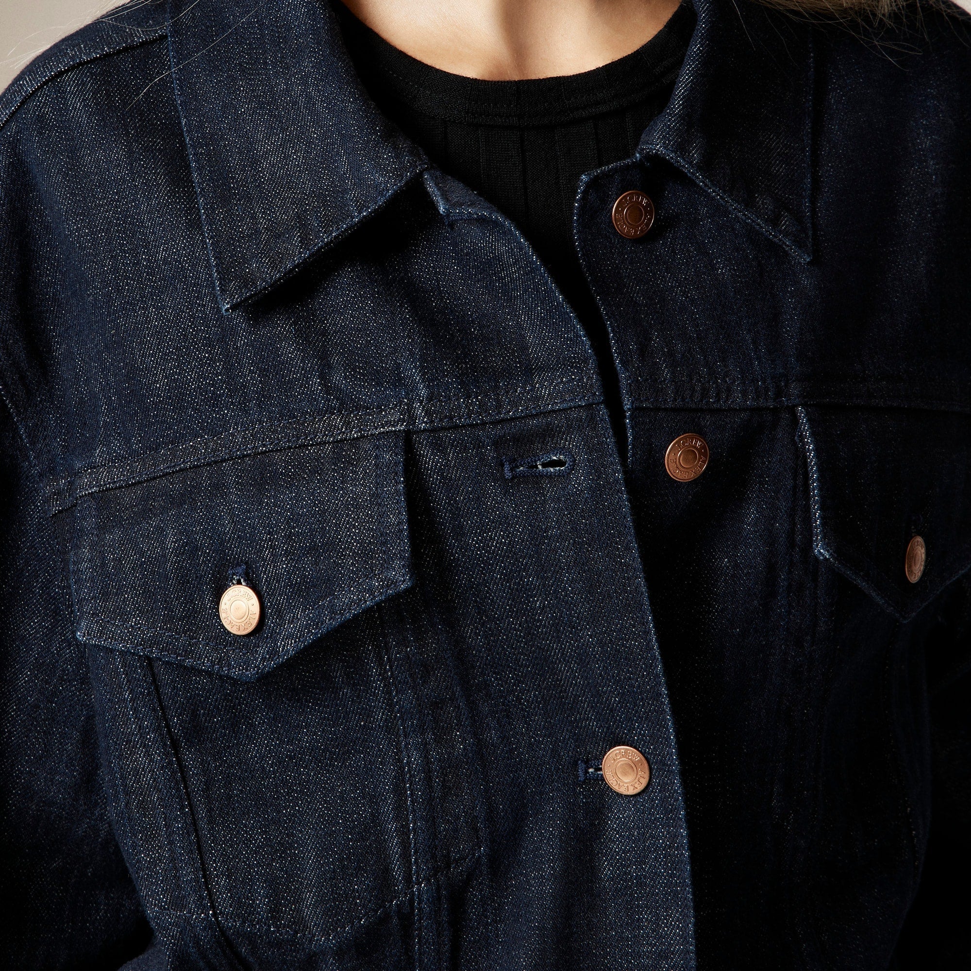 Introducing Alex Eagle X J.Crew. We collaborated with the London-based creative director and designer Alex Eagle on a capsule of timeless pieces infused with her brand's signature tailoring and sporty touches. Cut from crisp 100 percent cotton denim in a structured-yet-refined silhouette, this versatile layer comes with classic button-flap pockets, copper hardware and clean seaming.