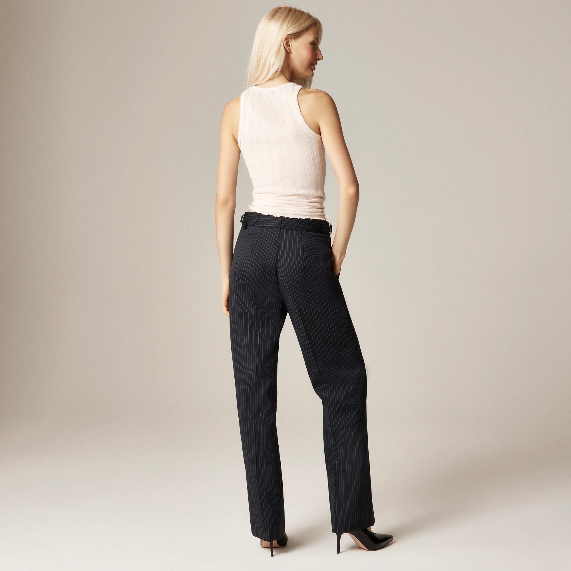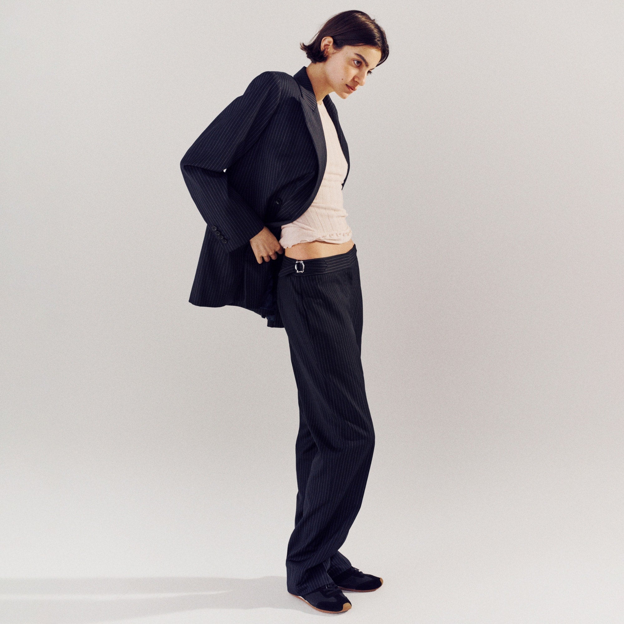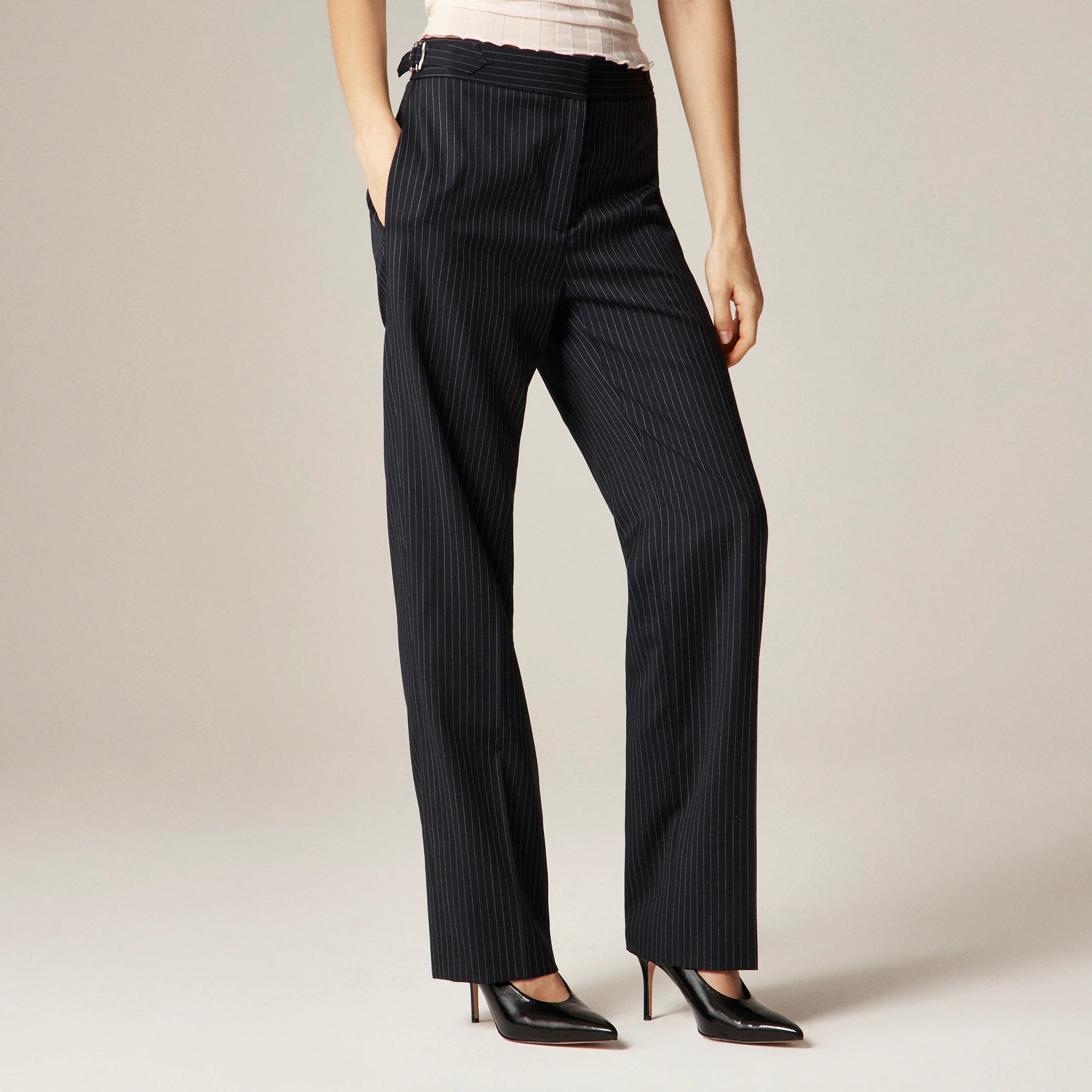 Introducing Alex Eagle X J.Crew. We collaborated with the London-based creative director and designer Alex Eagle on a capsule of timeless pieces infused with her brand's signature tailoring and sporty touches. These pinstriped pants deliver both with a comfortable-yet-polished wide-leg, 100 percent wool fabric and unexpected silver hardware at the hip.