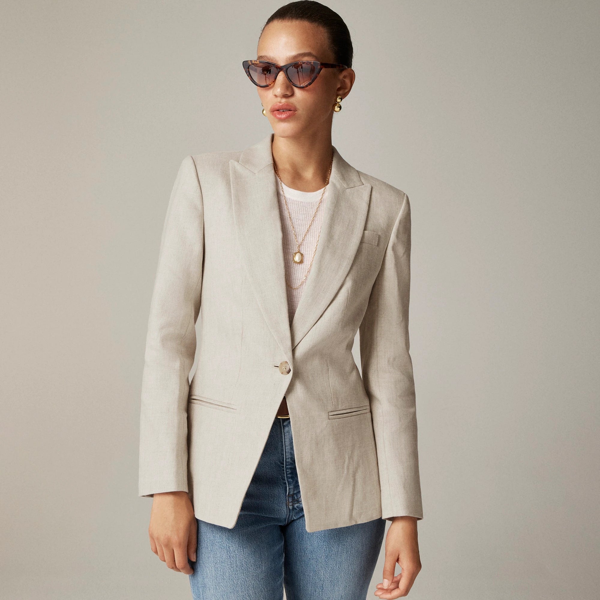 Our blazer collection just keeps getting better. . . Sleek and classic, this new style comes with braided trim details along the lapel for added polish and a longer, streamlined length that hits right at the hips. Plus, it's crafted from an easy linen blend that's naturally breathable and incredibly soft.