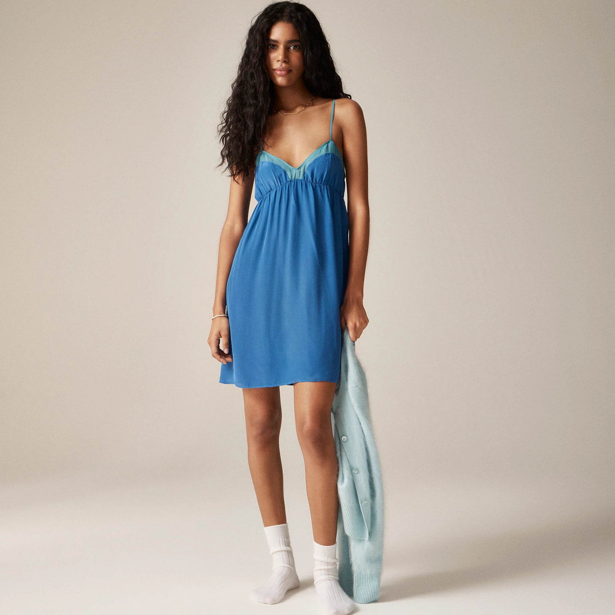 Introducing Araks X J.Crew. We collaborated with designer (and J.Crew alum) Araks Yeramyan on an exclusive collection of pajamas and lingerie that celebrates our shared love of unexpected color combinations and thoughtful details. A sleep dress designed for any time of day, with a sheer panel in a pop of color along the neckline and adjustable straps. Plus, it's crafted from our crepe de chine, which is incredibly smooth, soft and light.