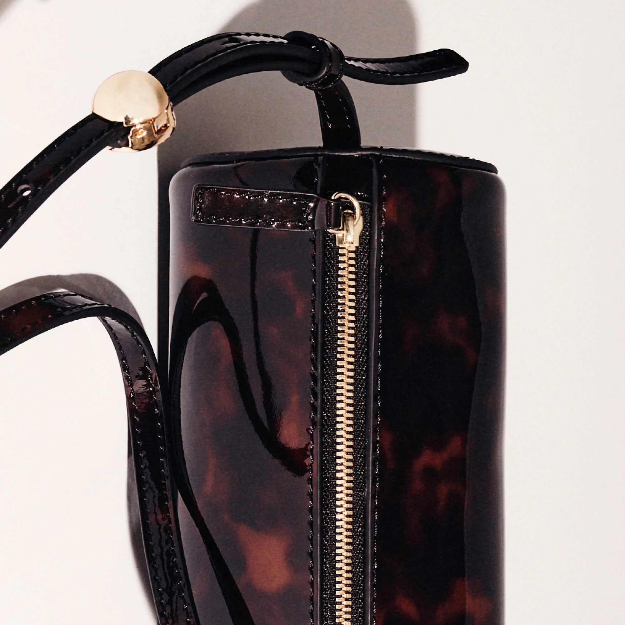 Meet the bag of the season. This eye-catching pencil bag features a cool rounded silhouette that fits all the essentials (so you can take it anywhere and everywhere). It's finished with a gold bauble detail to adjust the length of the strap, plus tortoise-print leather with all the '90s vibes.