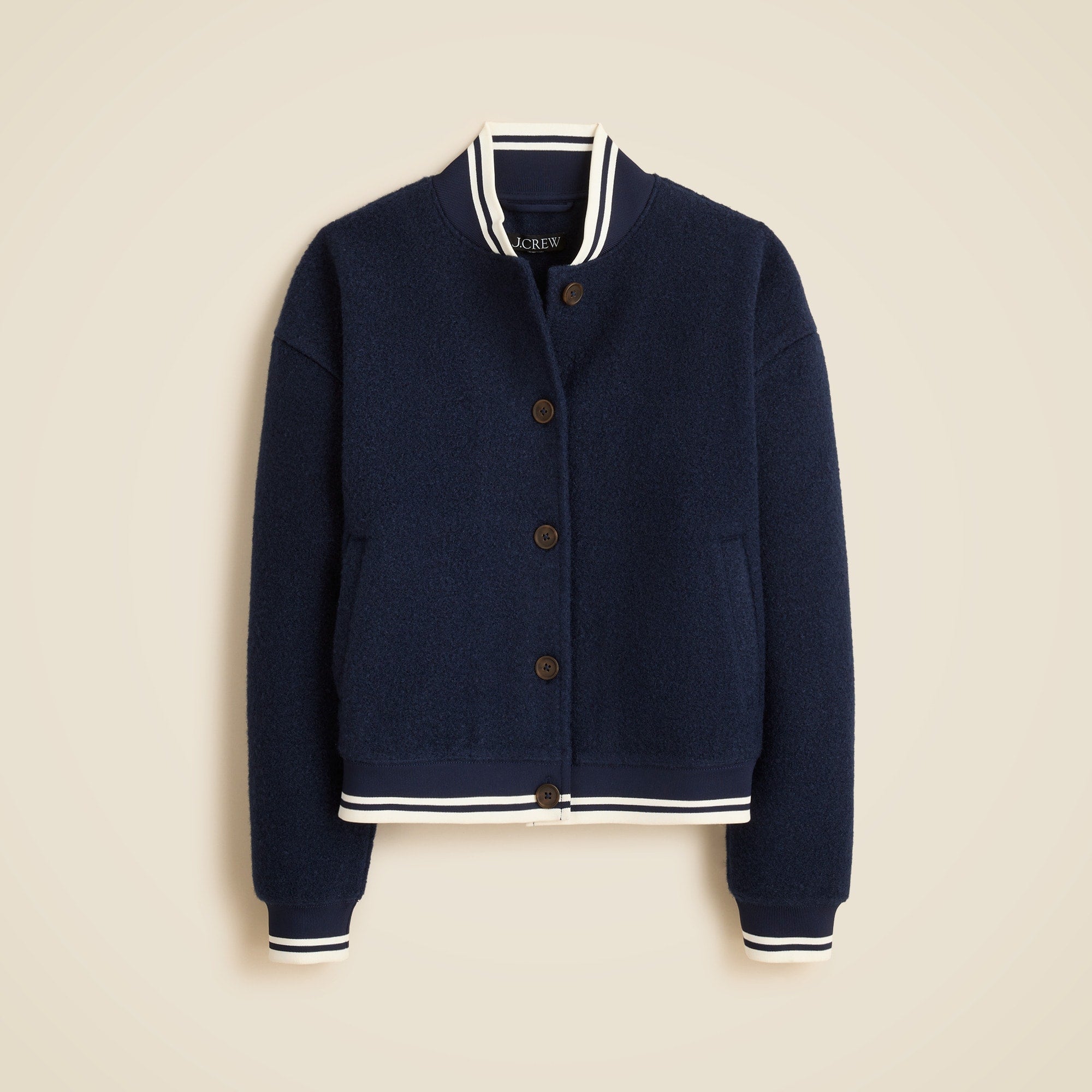 A varsity-inspired layer with a twist. Crafted from soft bouclé fabric, it combines a classic athletic silhouette with a textured, cozy feel. In other words, it's the perfect addition to casual outfits and more elevated looks.