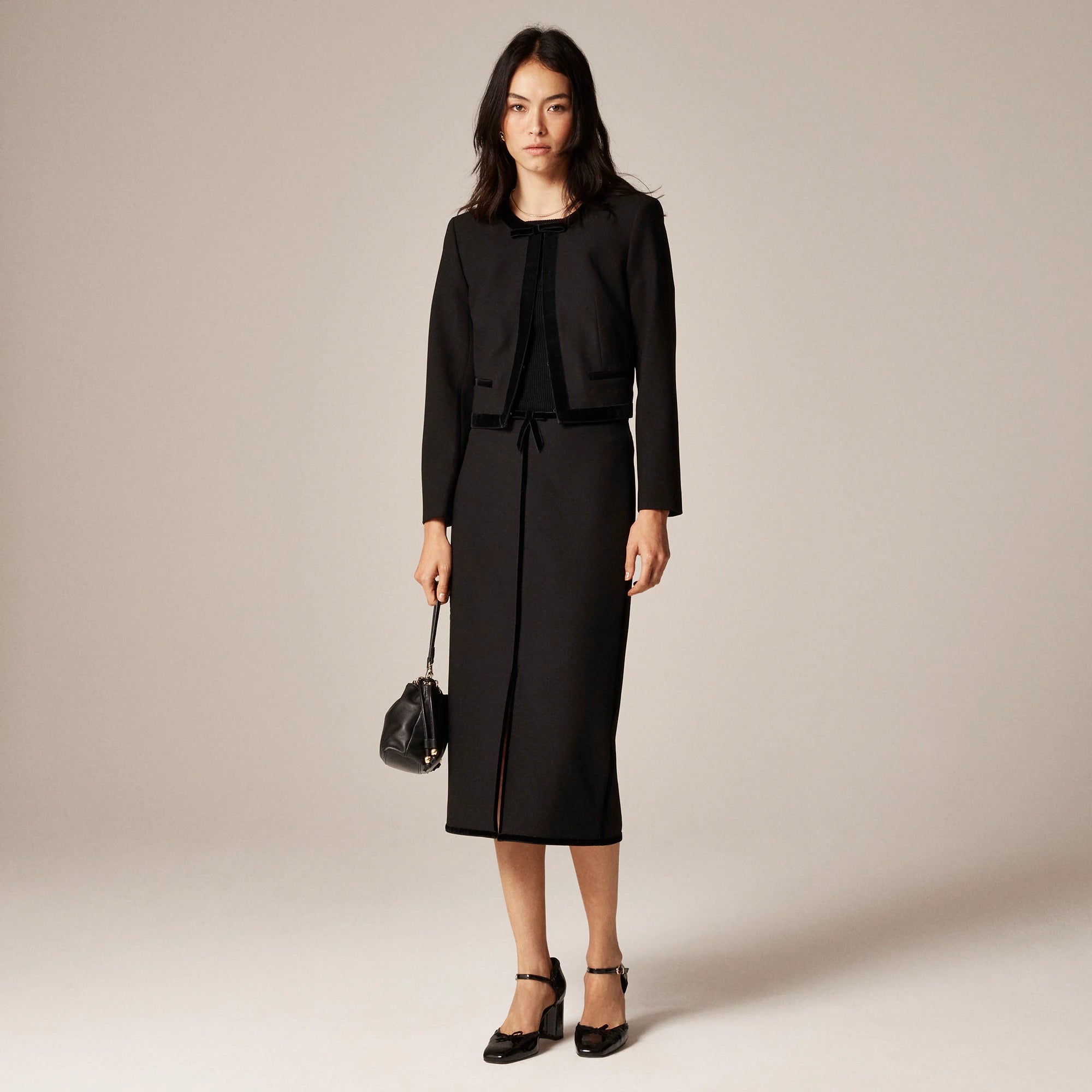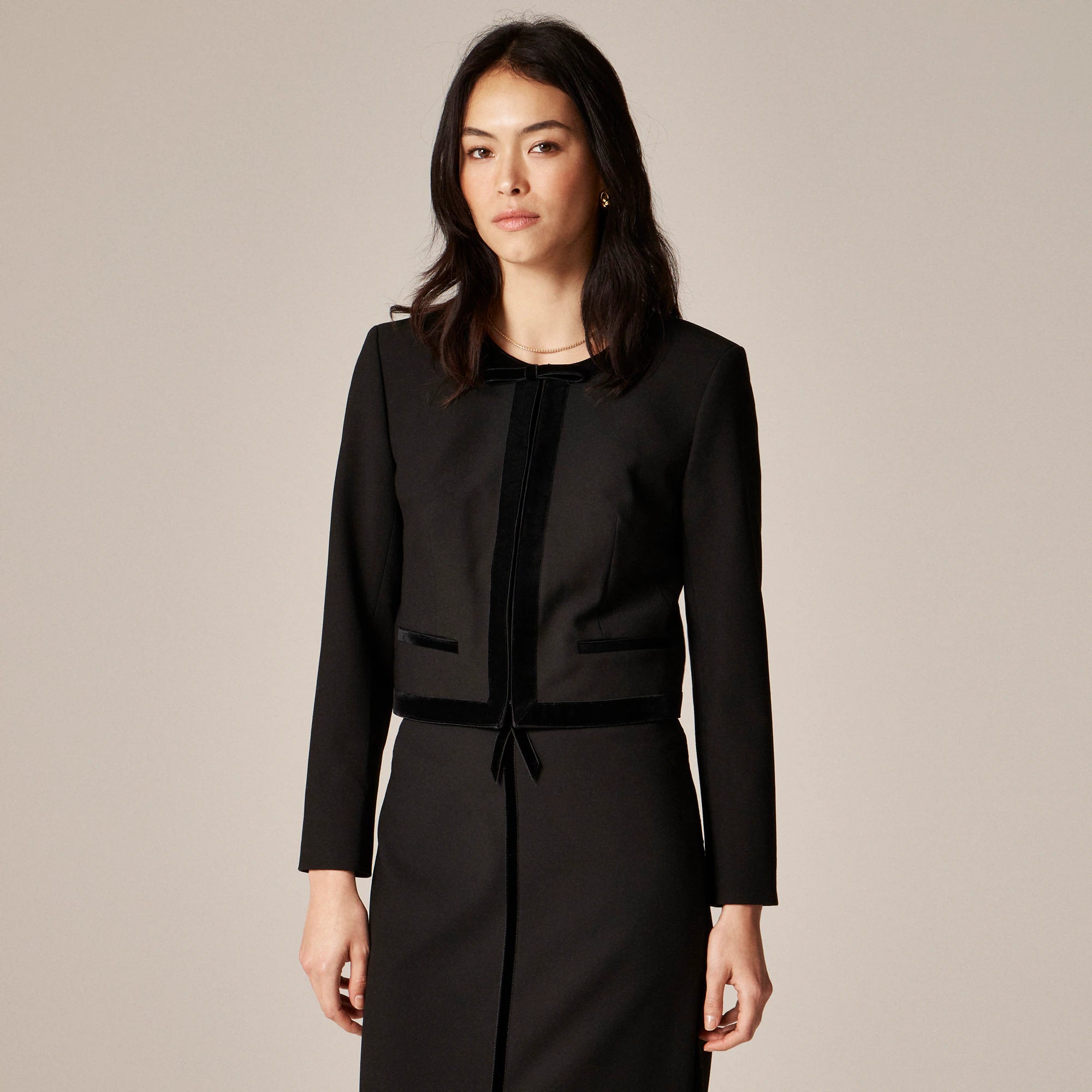 An instant classic with elevated details. This subtly cropped jacket comes with a sweet bow detail at the neckline and rich velvet trim along the placket, hem and pockets for a touch of understated luxury. Plus, it's crafted from our famous four-season stretch (a super-comfy fabric that never loses its shape).