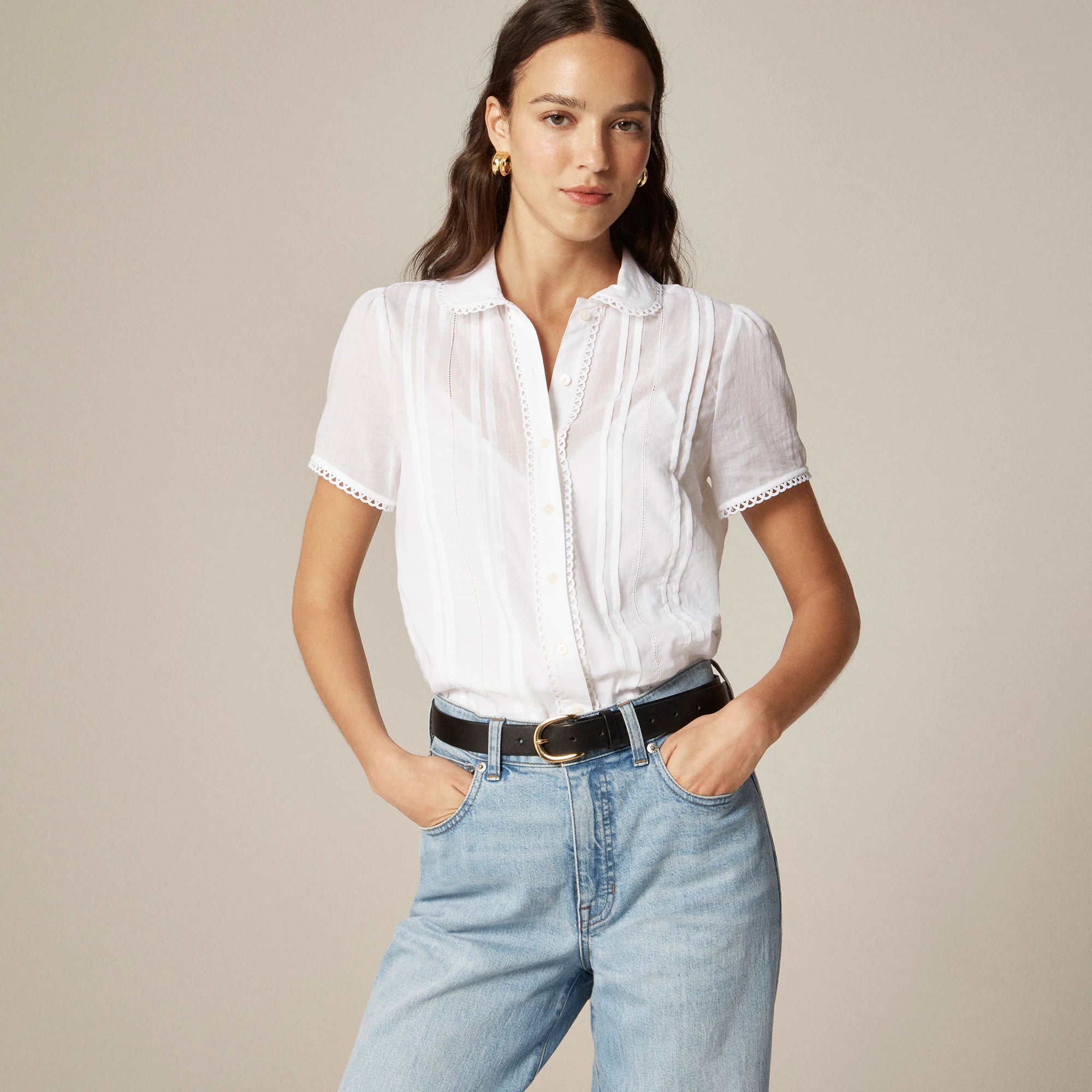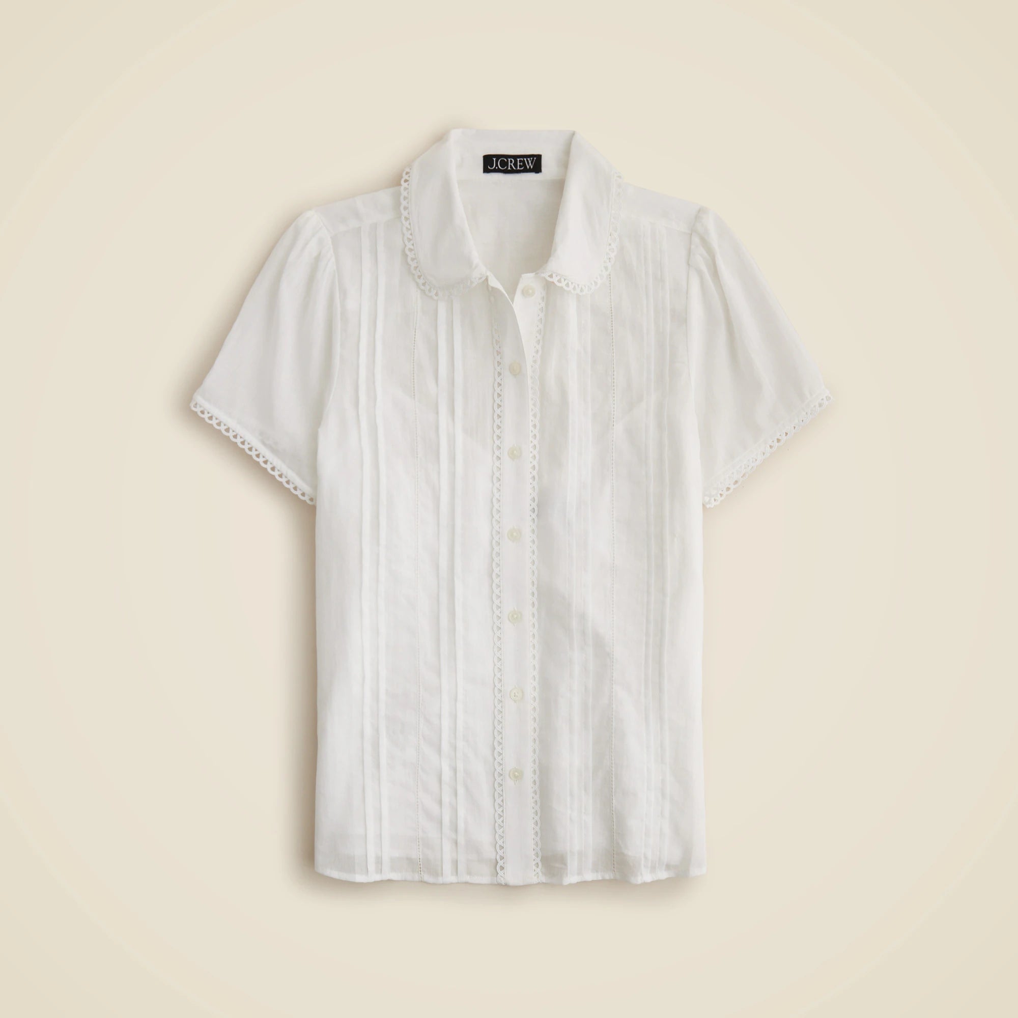 Our best-selling blouse, now in breezy cotton voile. We brought back your favorite tailored-meets-romantic silhouette in a new lightweight fabric that's perfect for the last days of summer. Crafted in 100 percent organic cotton voile with delicate lace trim at the collar, placket and sleeves, it's slightly sheer (except the white version, which is fully lined) and softly structured with pintucks for polish. Tuck it into denim or dress it up—it plays well with everything.