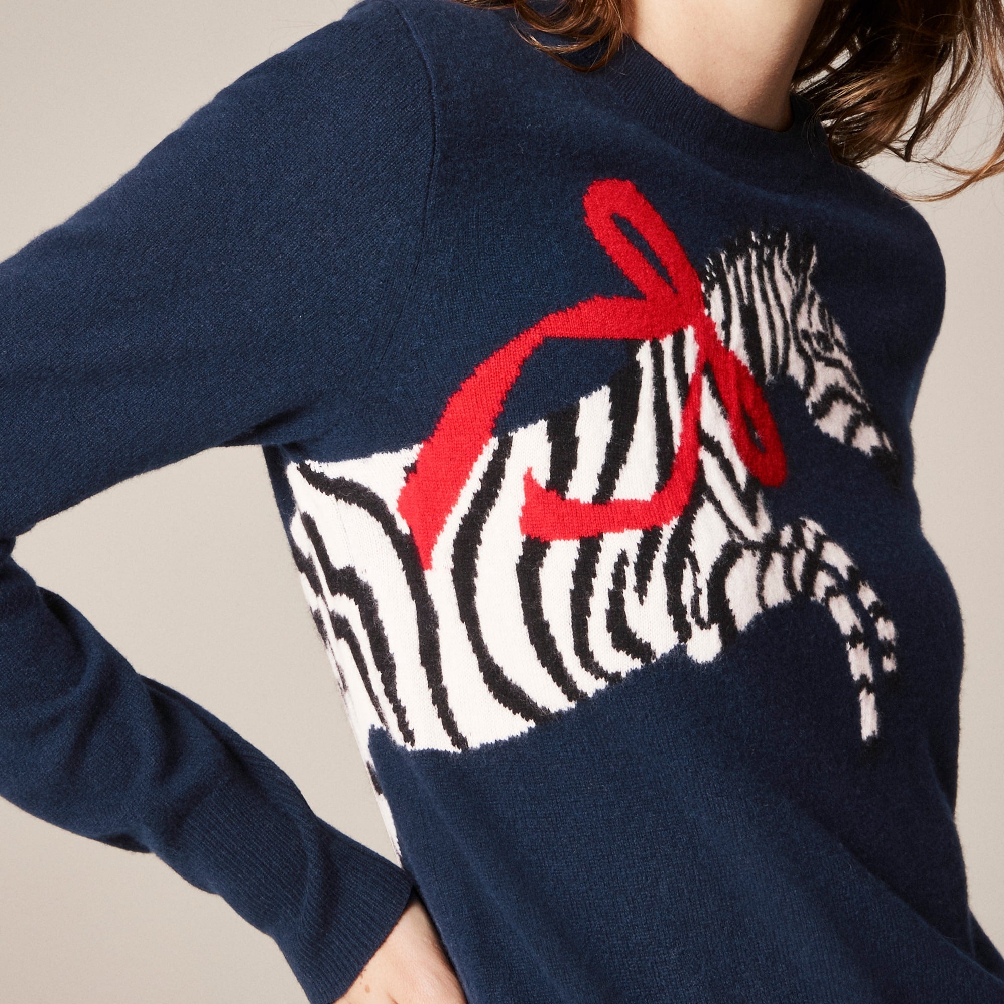 When you think of cashmere, you think of J.Crew. We've spent decades fine-tuning our collection, sourcing the softest, longest-lasting fibers and perfecting every detail from fit to fabric to color. True to its name, our classic crewneck has a just-right fit that's not too slim or relaxed. Plus, the silhouette has a slightly longer length, so it's easy to tuck in or layer. This version comes with intarsia-knit details that create a statement zebra print across the front and back. Timeless in every sense, it's no wonder this sweater is our number one best seller.