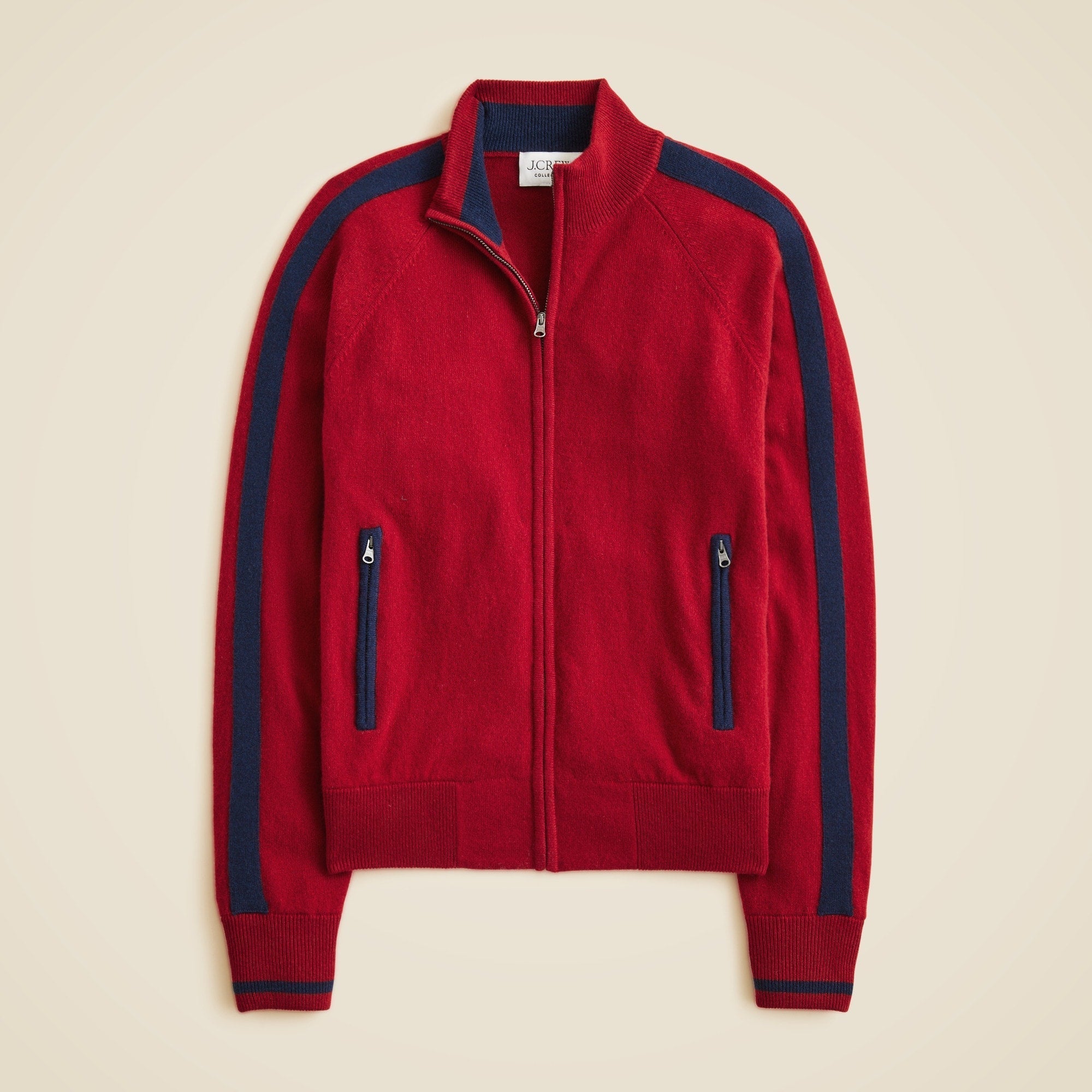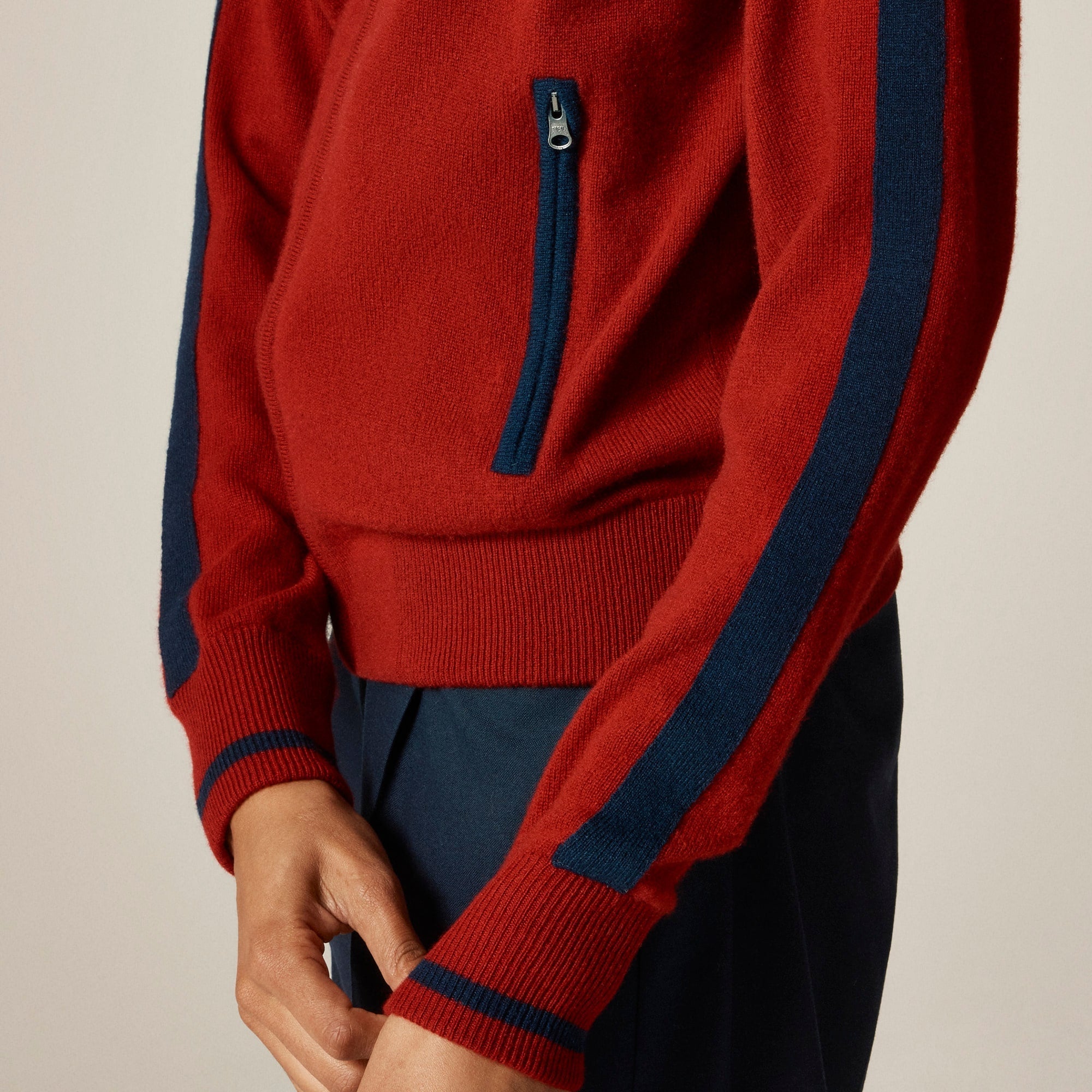 When you think of cashmere, you think of J.Crew. We've spent decades fine-tuning our collection, sourcing the softest, longest-lasting fibers and perfecting every detail from fit to fabric to color. This sporty-inspired style comes with zip details down the front and at the pockets, plus a higher neckline and contrast stitching that feels considered. Pro tip: Pair it with the matching cashmere pant for an impossibly soft set.