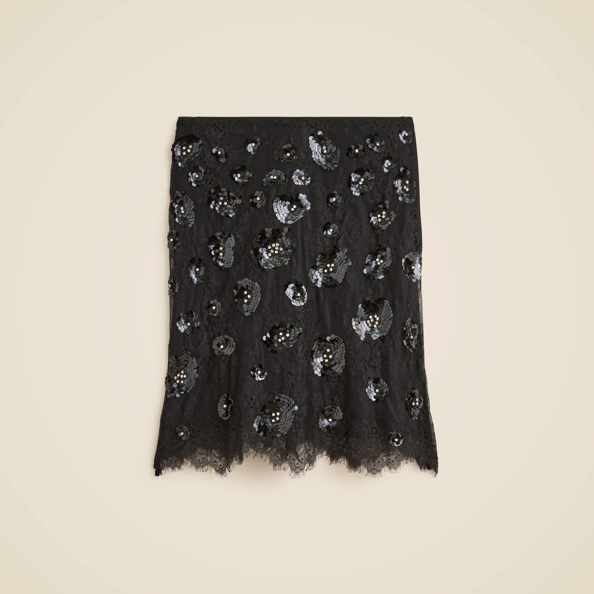 New in J.Crew Collection. This skirt brings a touch of artistry with an intricate lace overlay, scalloped details at the hem and sparkling sequins set in floral shapes scattered all over. Designed to sit at the waist and fall to the knee, it pairs perfectly with its matching top for a coordinated look.