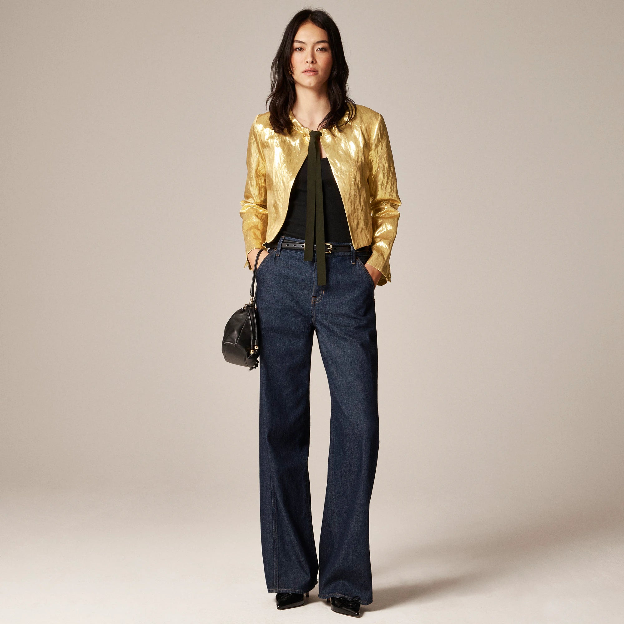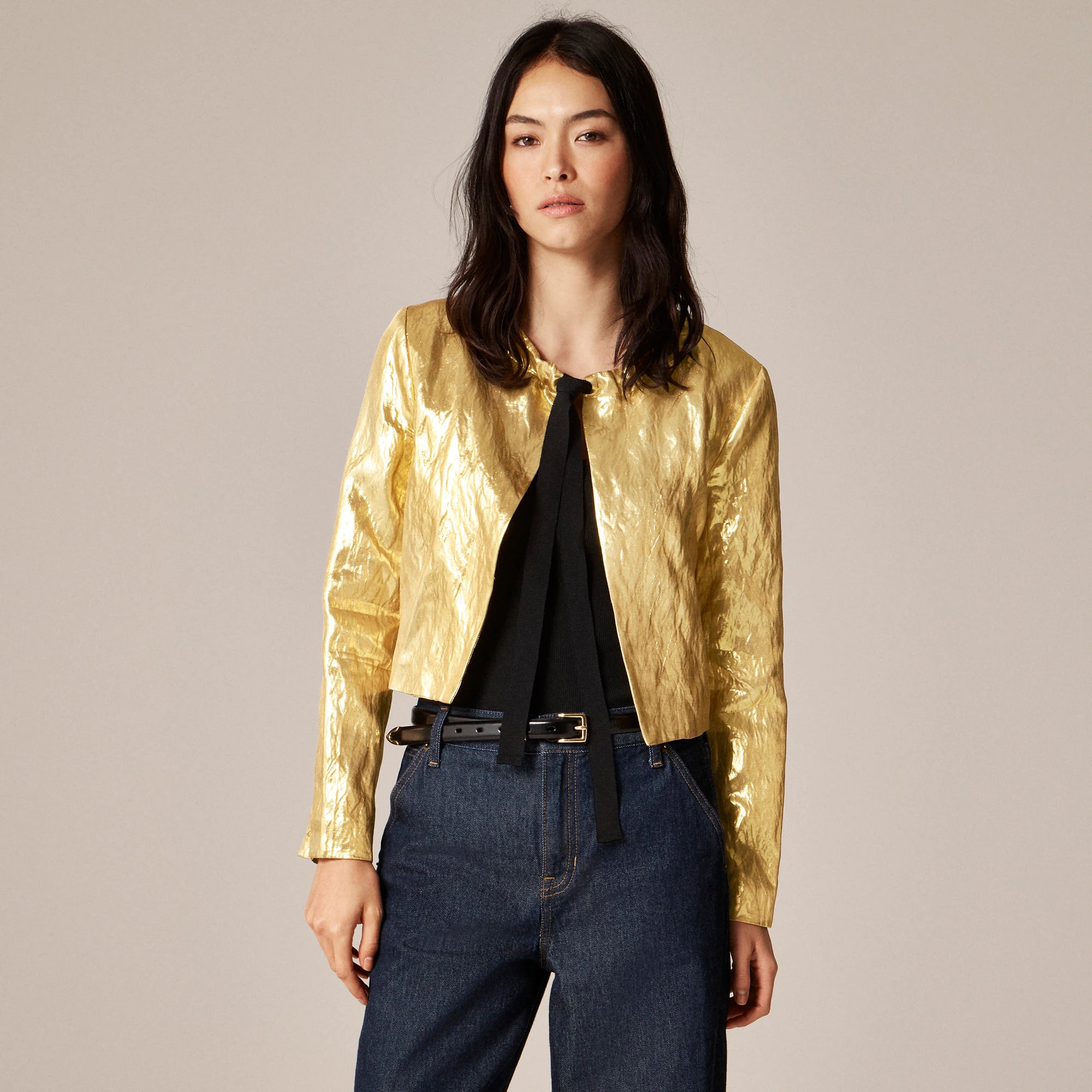 New in J.Crew Collection. A shimmering take on our signature silhouette. This special lady jacket comes with a velvet bow detail at the neckline and an open front, so you can show off your favorite party dress underneath. Plus, it's crafted from a light-reflecting lamé fabric with flecks of metallic thread throughout. Another reason to love it? The matching skirt and dress.