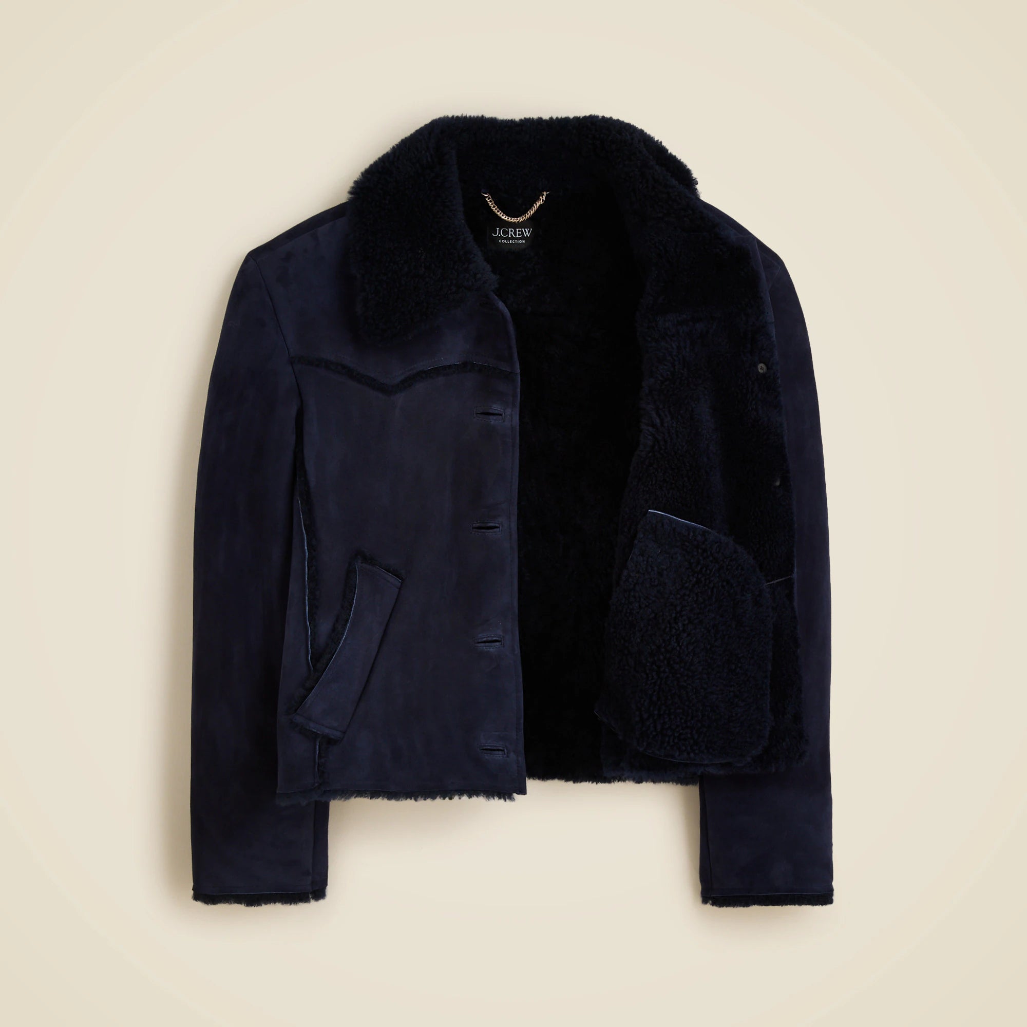 New in J.Crew Collection. A statement-making layer lined in soft shearling and finished in smooth suede, with standout seam details across the front and down the sides for added polish.