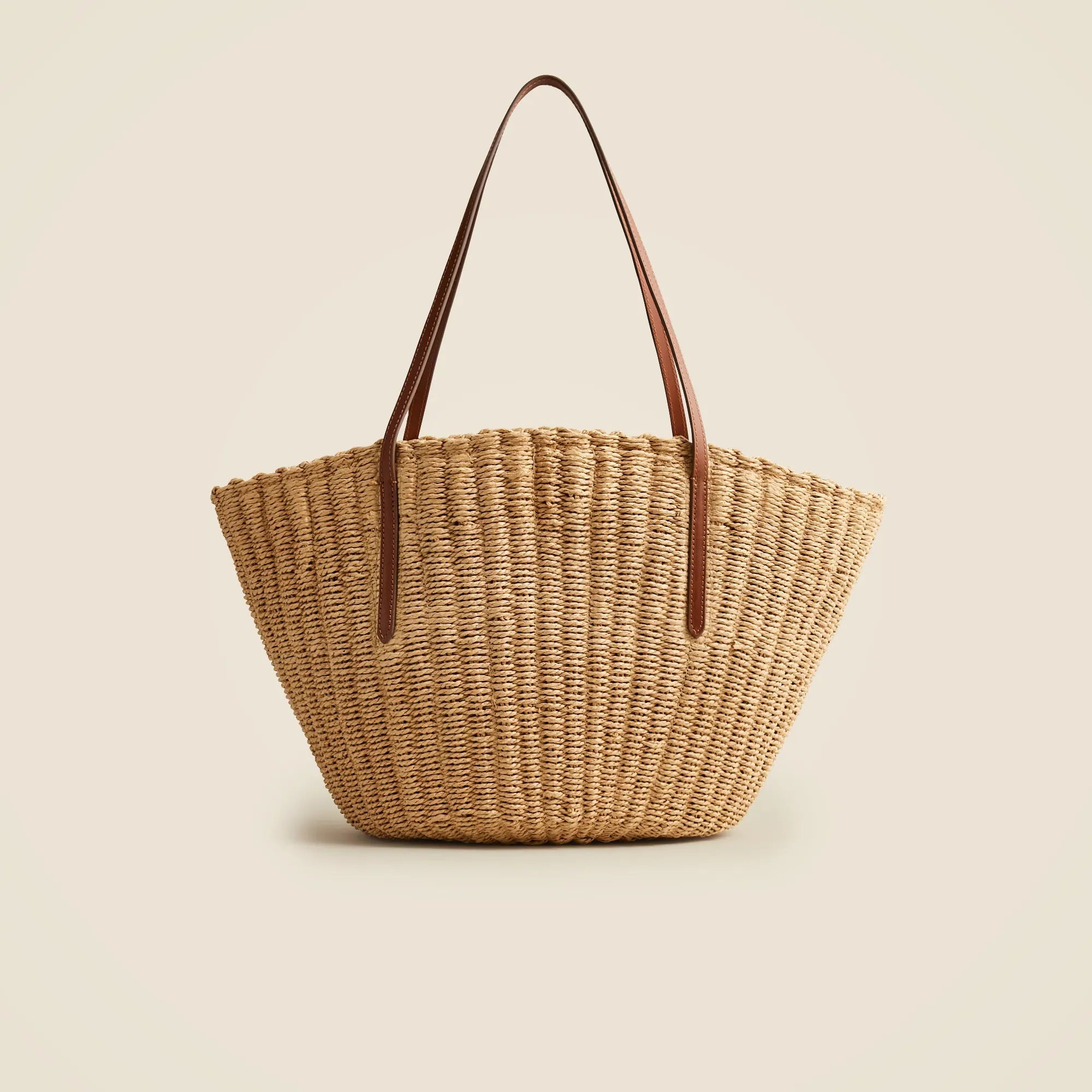 Meet the tote of the season. Our woven straw style is perfect for taking everywhere—from the farmer's market to your next beach vacation. Roomy and refined, it features slim leather straps and an updated shape that's flared at the opening for a modern look.