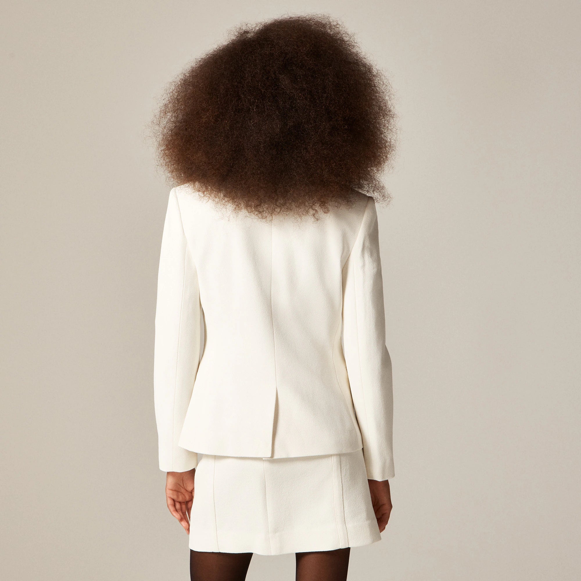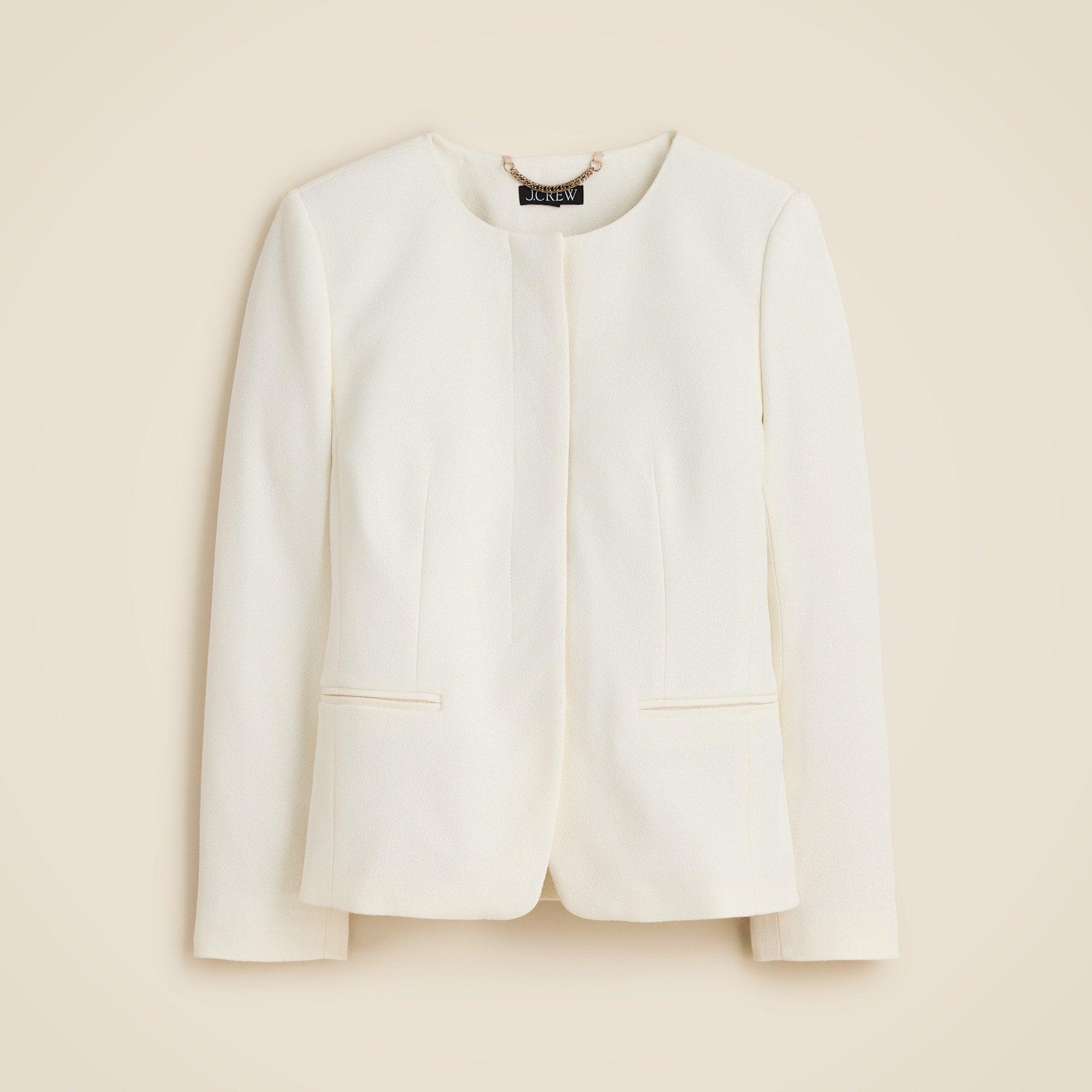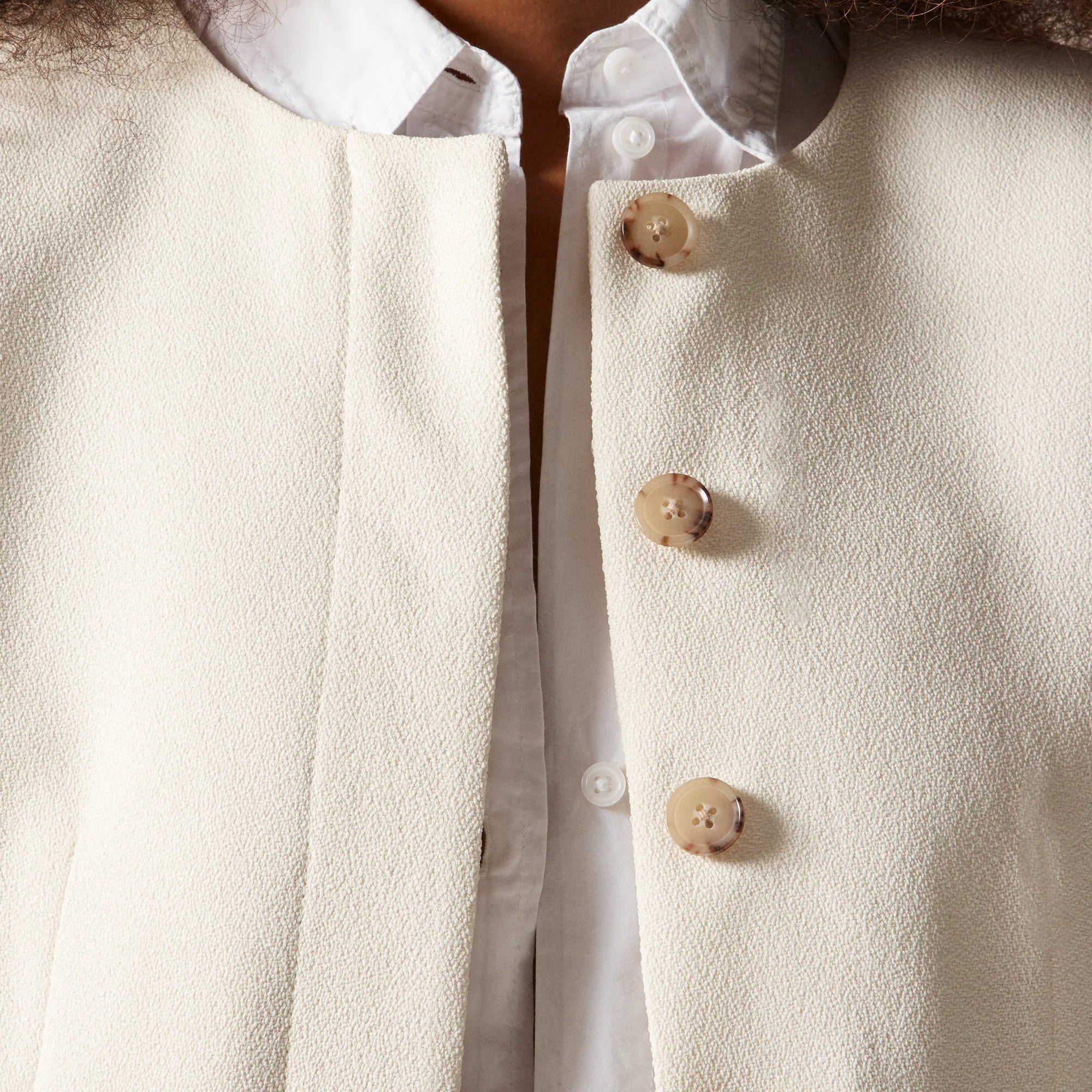 Sleek and tailored, with a modern twist. This take on the lady jacket comes with a cutaway detail at the hem that shows a hint of skin and a covered placket with hidden buttons. Plus, it's crafted from 100 percent viscose fabric with a dimensional bouclé texture for a refined look and feel.