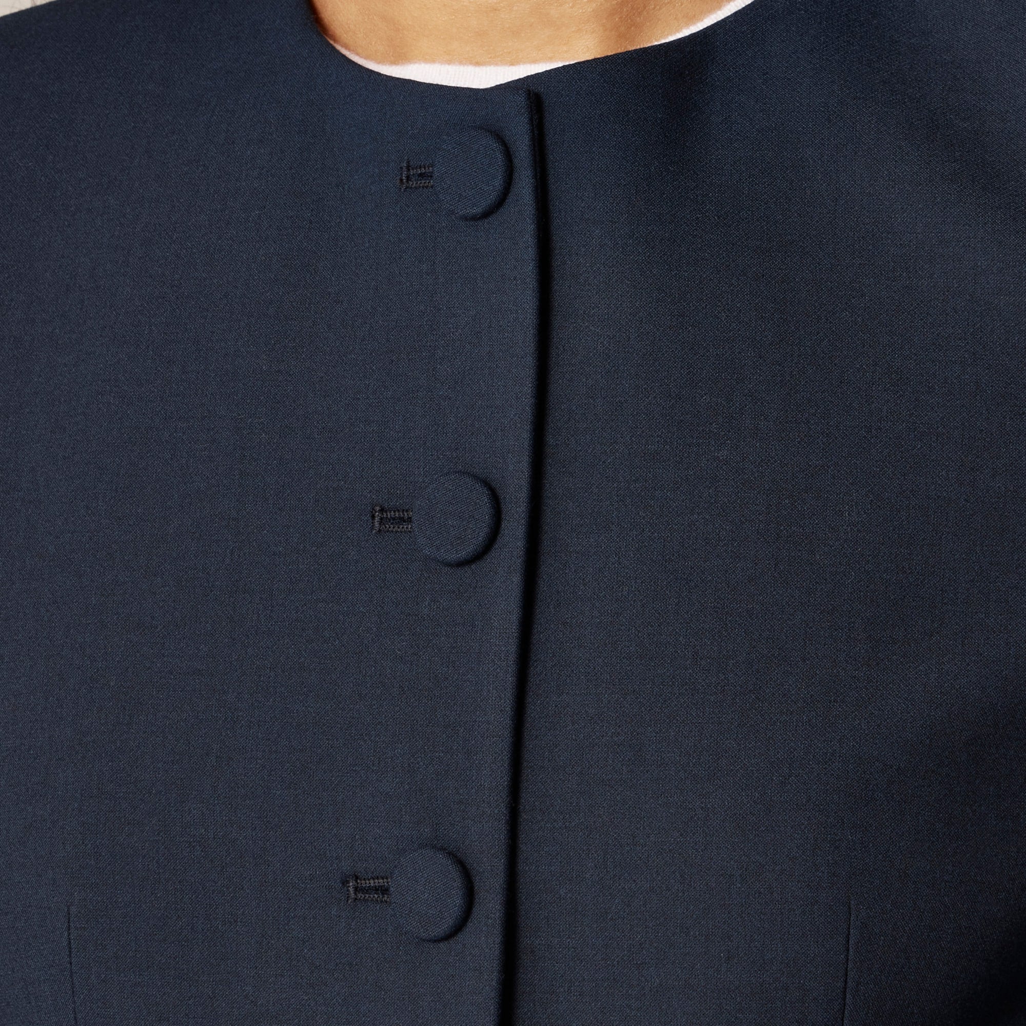 Sleek and tailored, with a modern twist. This take on our customer-favorite layer is made with our famous four-season stretch (a super-comfy fabric that never loses its shape). We love the cutaway detail at the hem that shows a hint of skin, covered buttons and welt pockets.