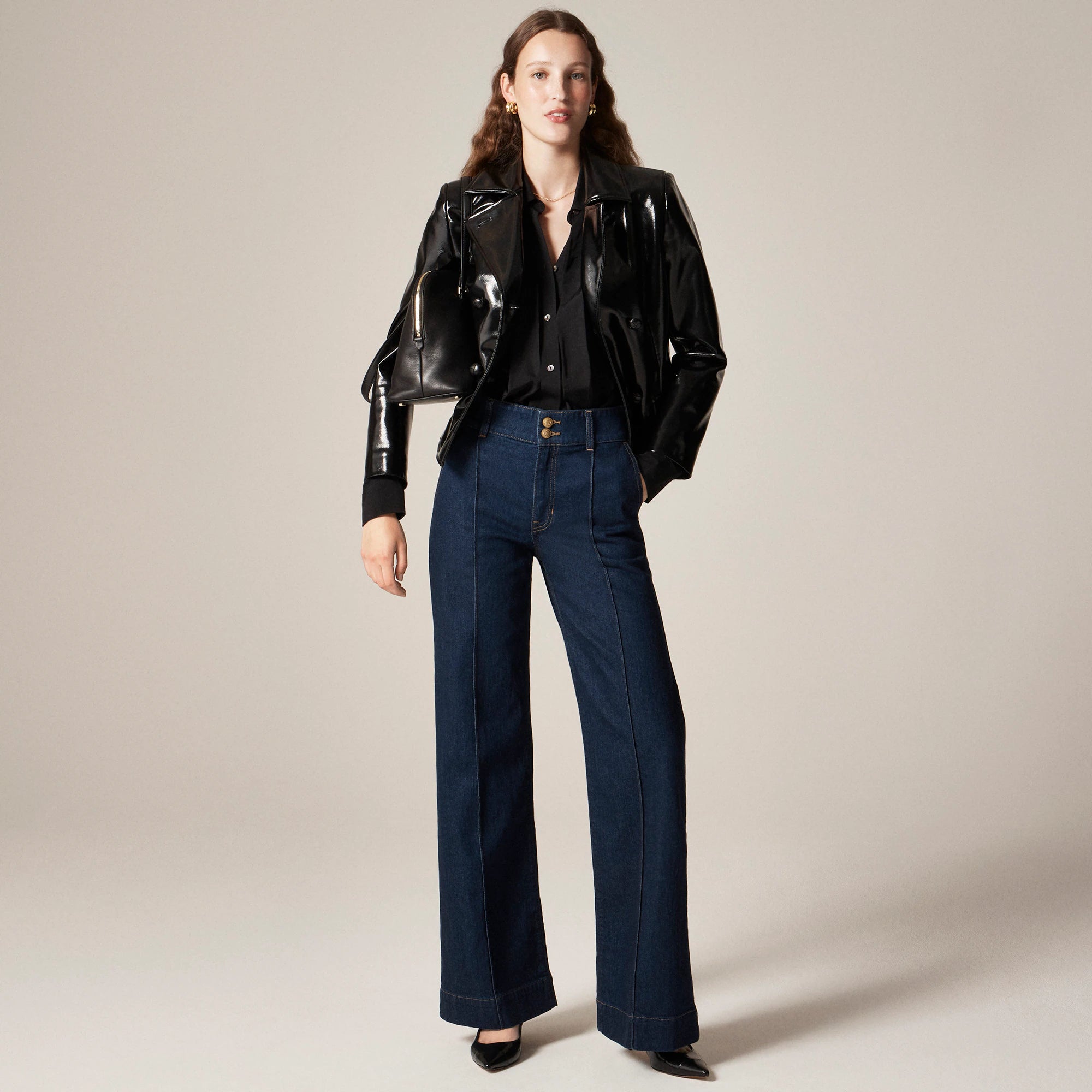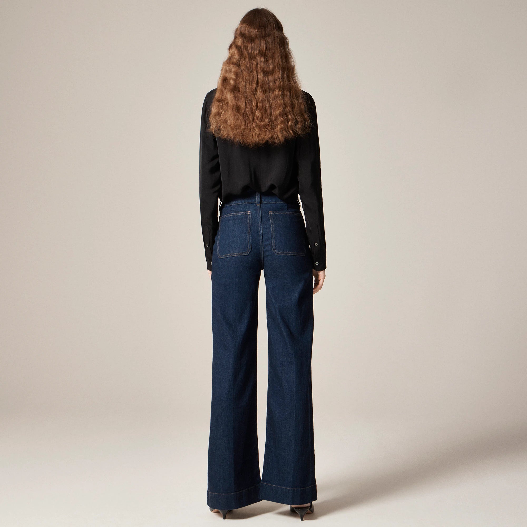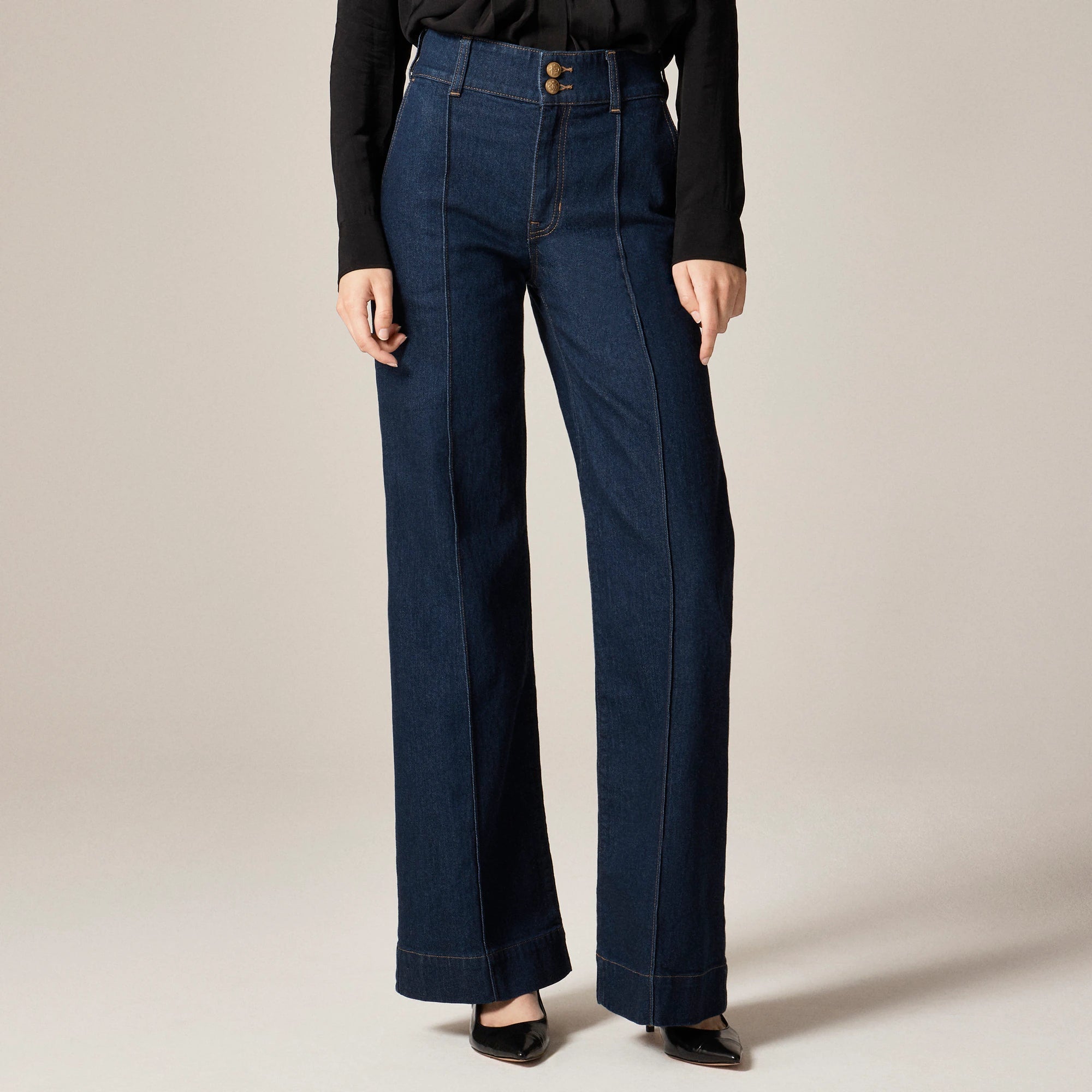 Our top-rated fit, with an extra-polished twist. This effortless everyday pair comes with an ultra-high rise that sits right above your natural waist and a wide-leg that's fitted around the hips and gradually gets roomier. With a 31" inseam, this pant grazes the floor in sneakers and can be paired with heels for a touch of drama. We also added a flattering wider waistband with double-button details for that extra hint of refinement. Plus, these are crafted in semi-stretch, so they're structured, durable and designed for all-day comfort.