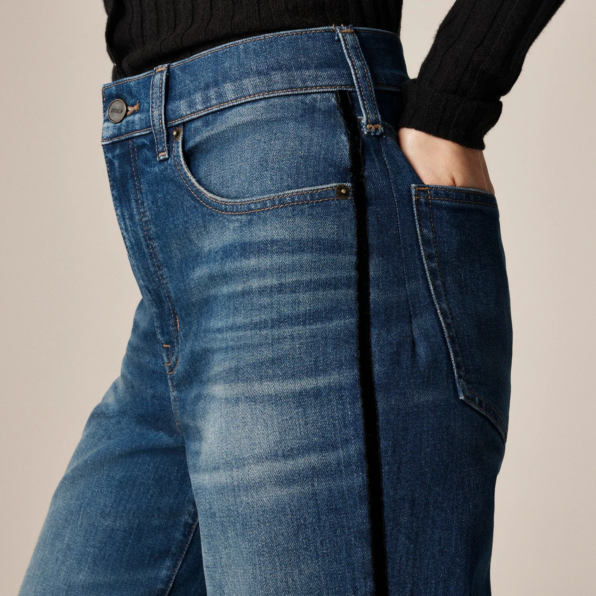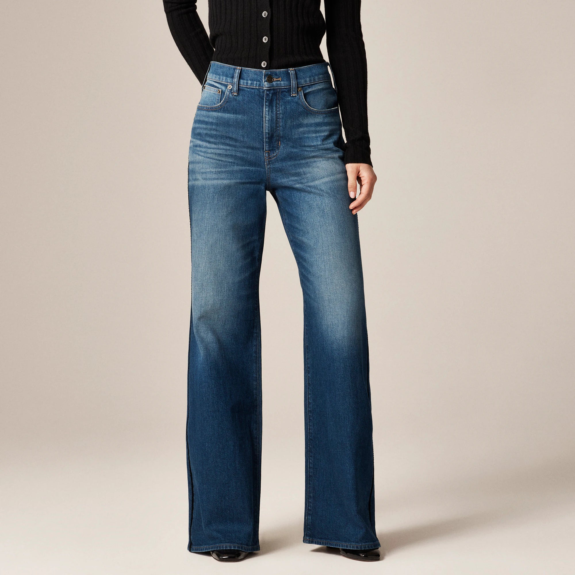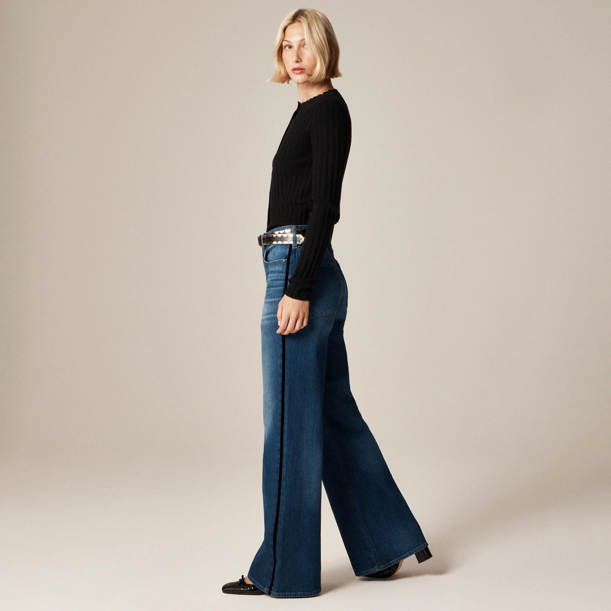 Our forever denim obsession. The effortless everyday pair you were looking for, with a velvet stripe along the side seam, an ultra-high rise that sits right at—or just below—the belly button and a wide-leg that's fitted around the hips and gradually gets roomier. With a 31" inseam, this pant grazes the floor in sneakers and can be paired with heels for a touch of drama. Plus, our design team pored over pocket placement for a flattering, lifted look from every angle.