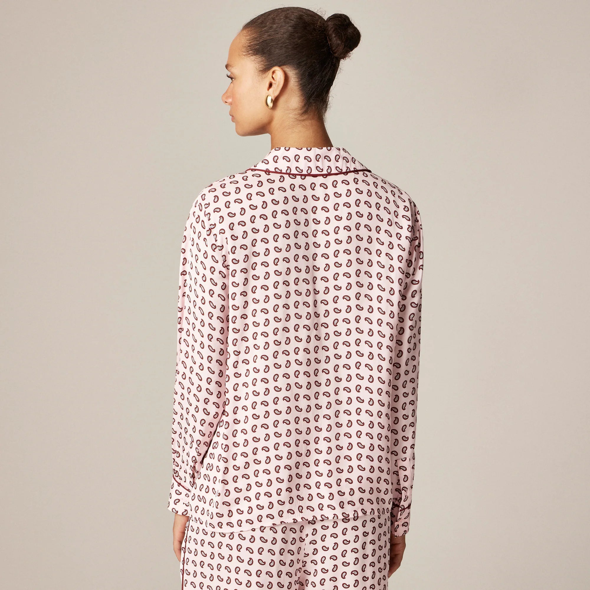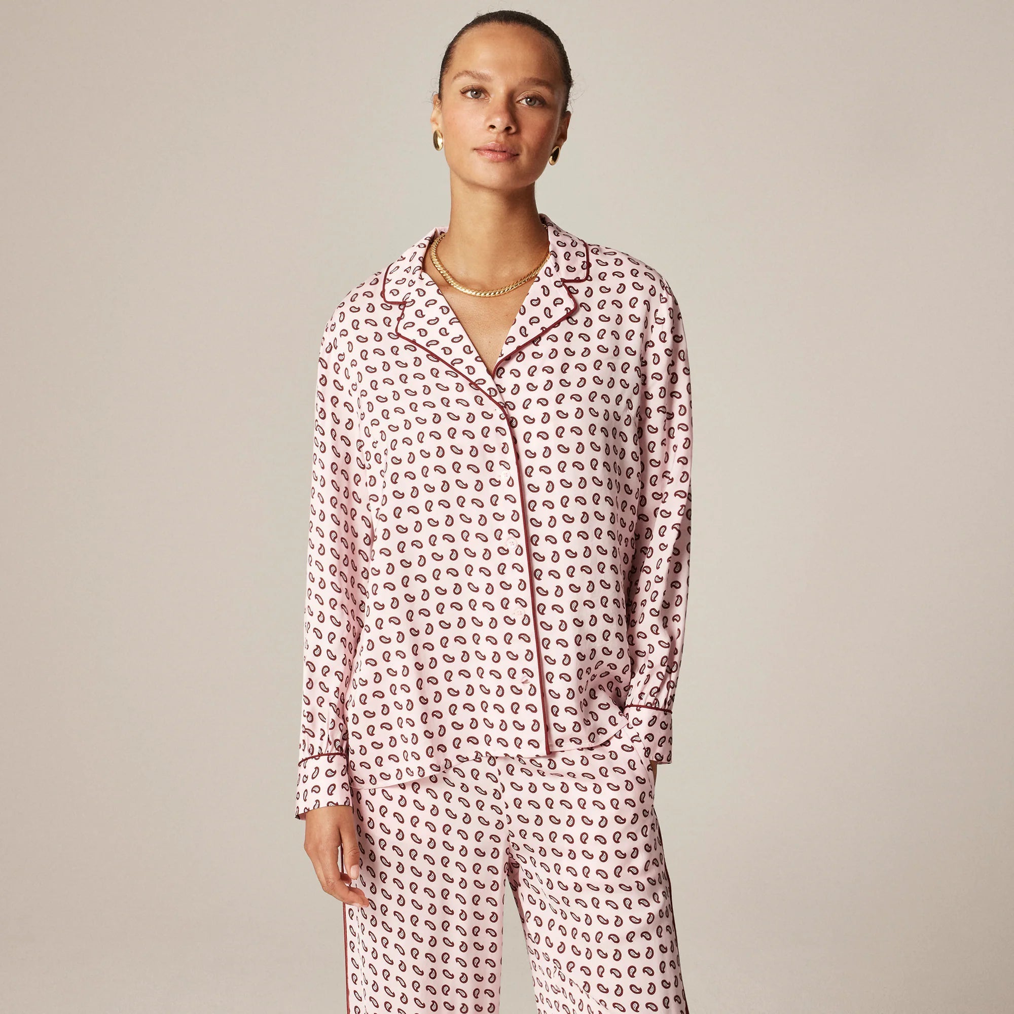 A sophisticated button-up that feels like your favorite pj's. This one comes with contrast piping, a fun paisley pattern and a drapey twill fabric that moves with you. Pro tip: It pairs perfectly with the matching Cosmo pant for a comfy-yet-refined set.