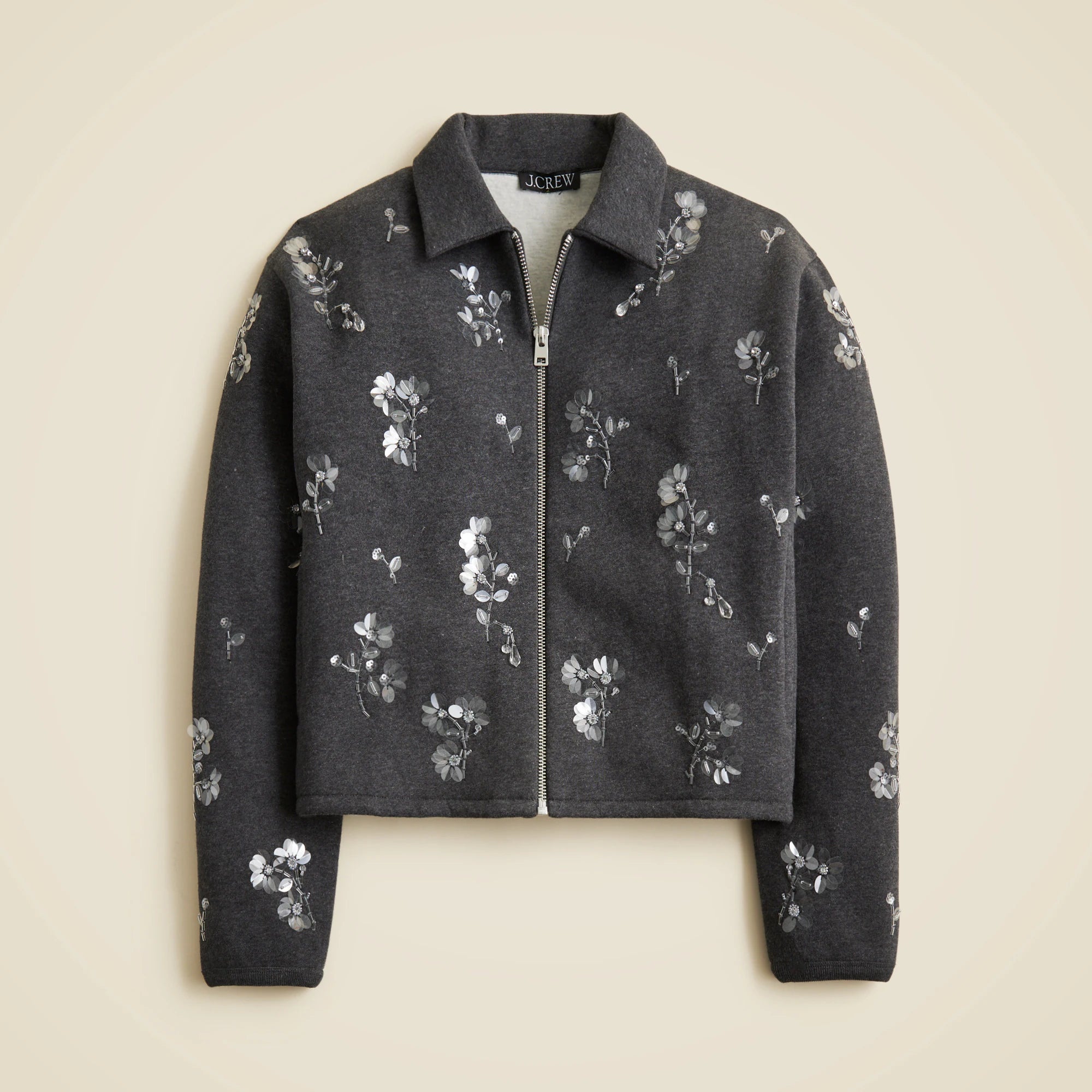 Soft and statement-making. This collared zip-up jacket comes with tonal floral embellishments for subtle dimension and shine. With a just-right fit that's not too cropped and not too boxy, it feels effortlessly dressed up. Plus, it's crafted from our heritage fleece, a cozy fabric with the weight and feel of vintage styles.