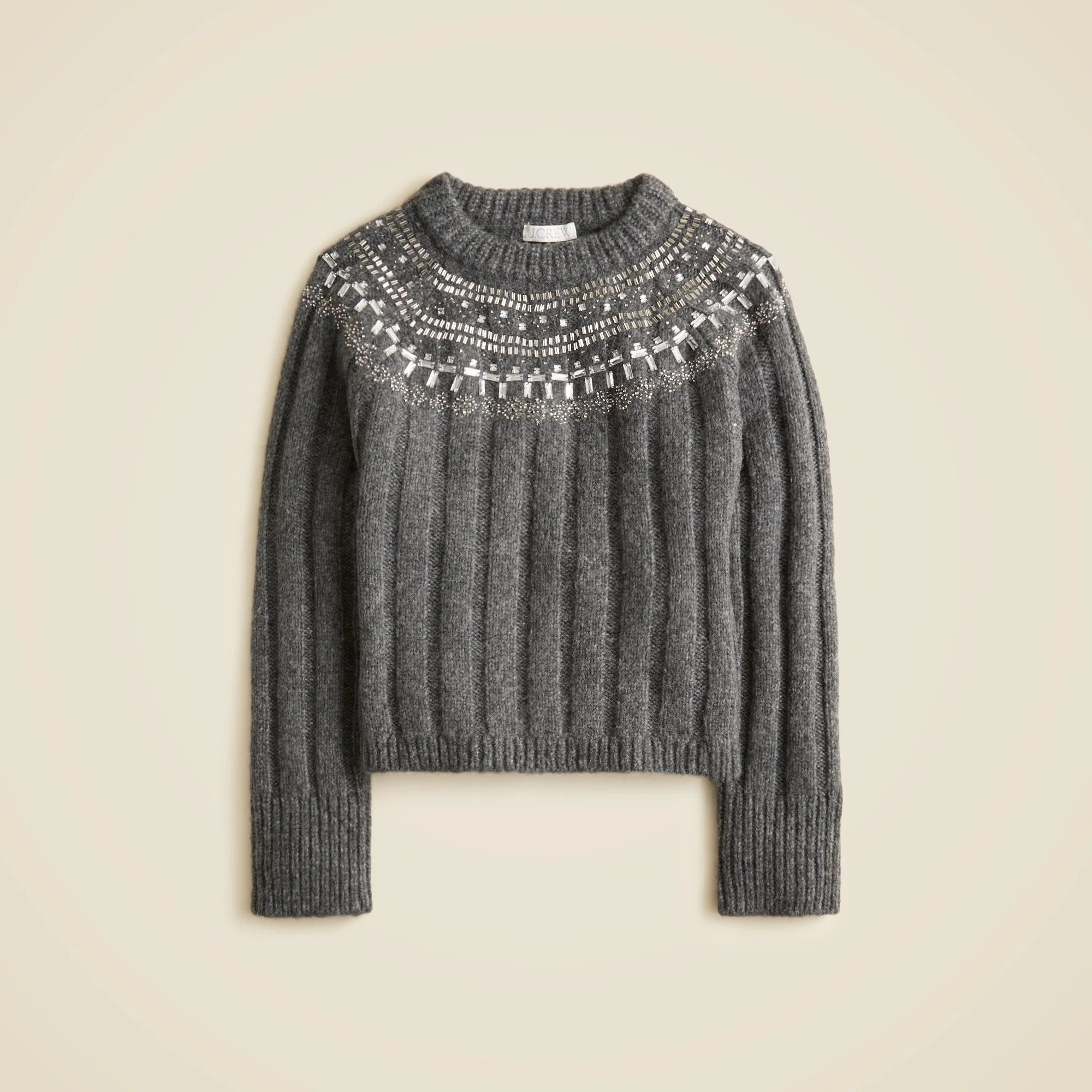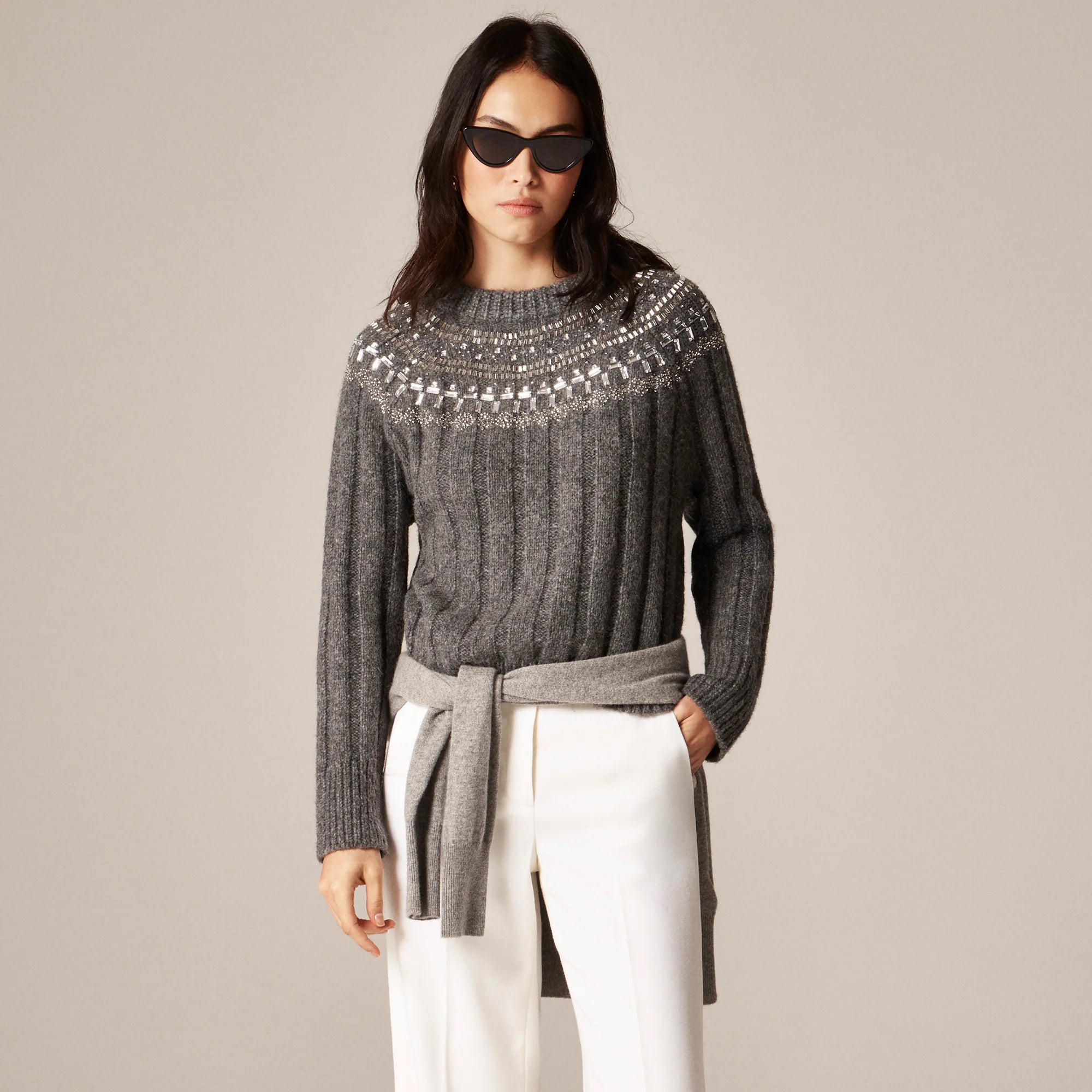 The Fair Isle-est of them all. . .Elevated with delicate bead and stone embellishments along the yoke and knit in a cozy wool blend, this standout style is perfect for all things festive. Plus, it's knit in a thicker rib texture with a chunky collar that adds an extra layer of warmth.