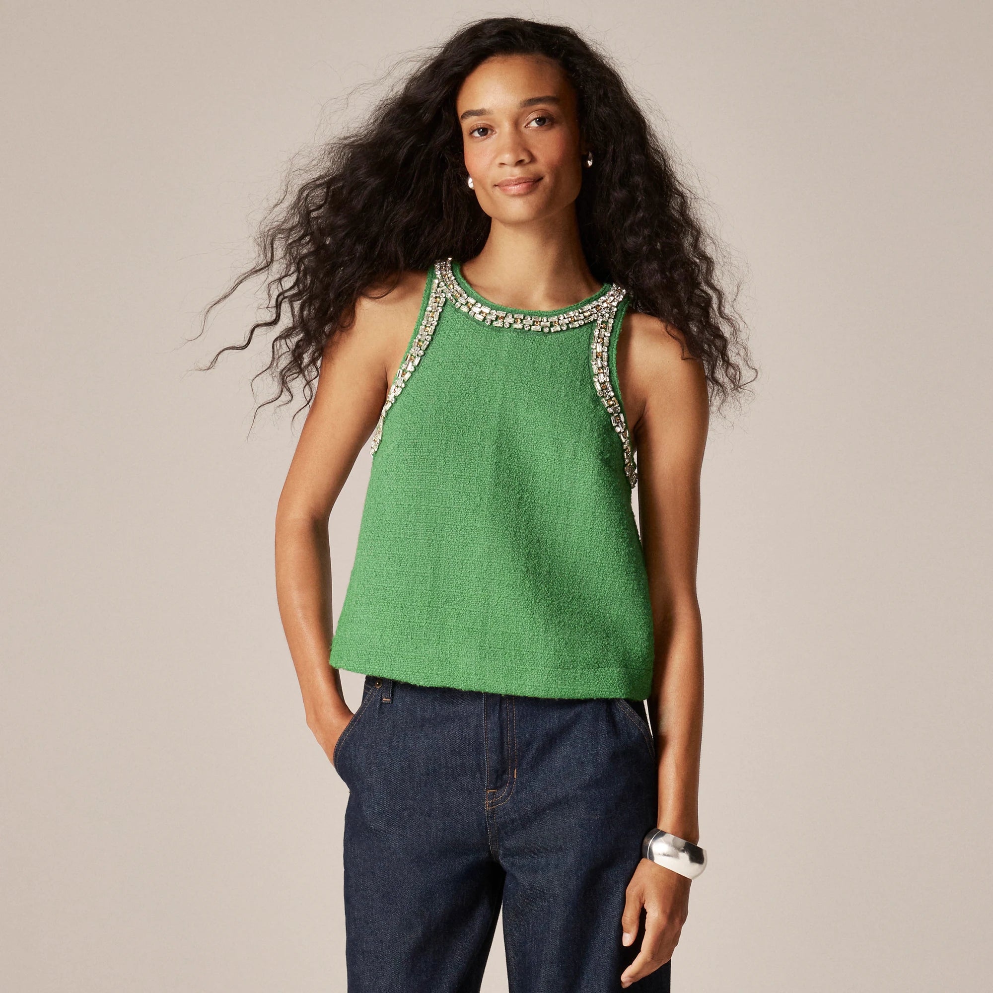 A new way to do structure. We took everything we love about timeless tailoring—think textured tweed, clean lines and a great fit—and gave it a fresh twist with this tank-top silhouette. The gemstone details along the neckline and arms add a fun twist on an everyday favorite (no necklace required).