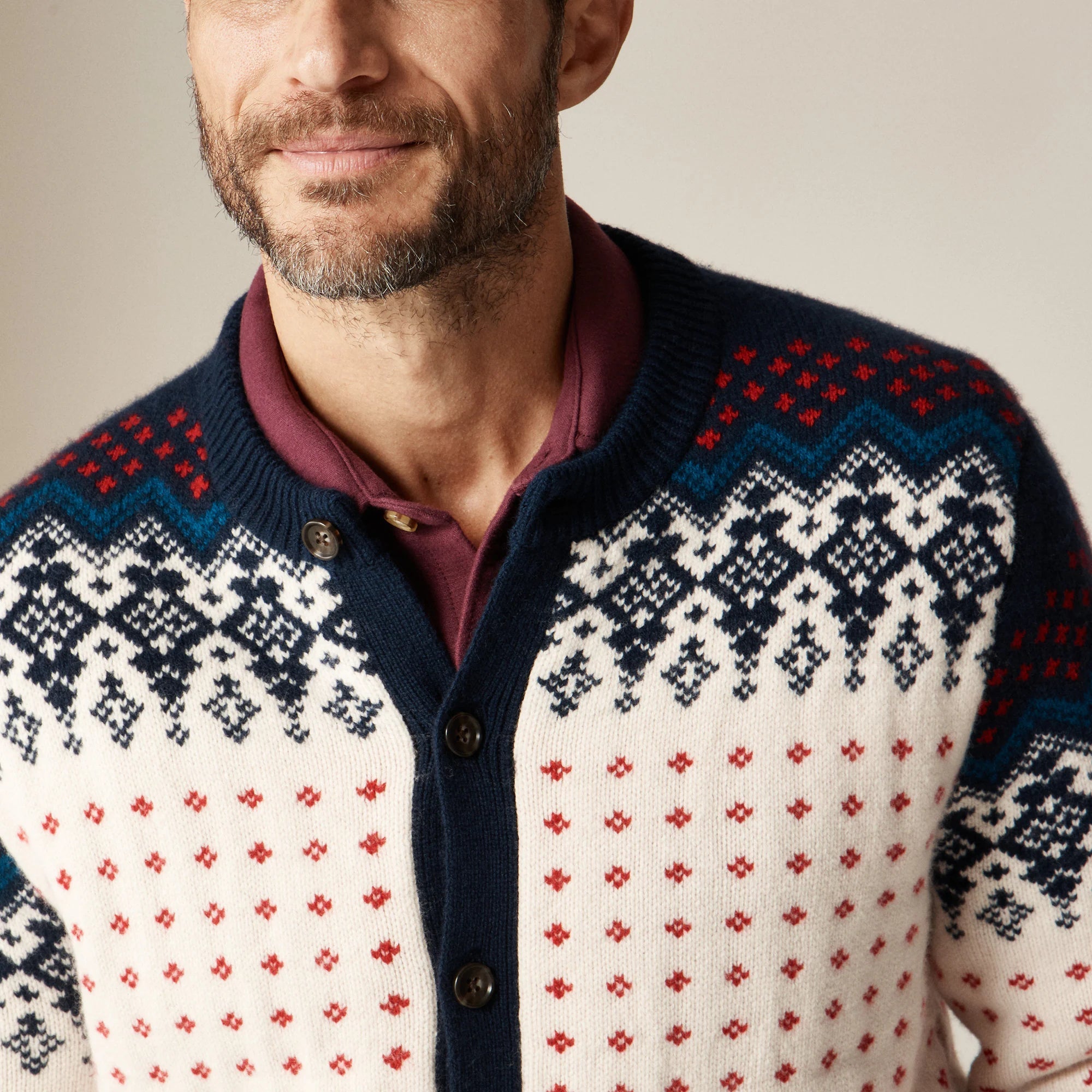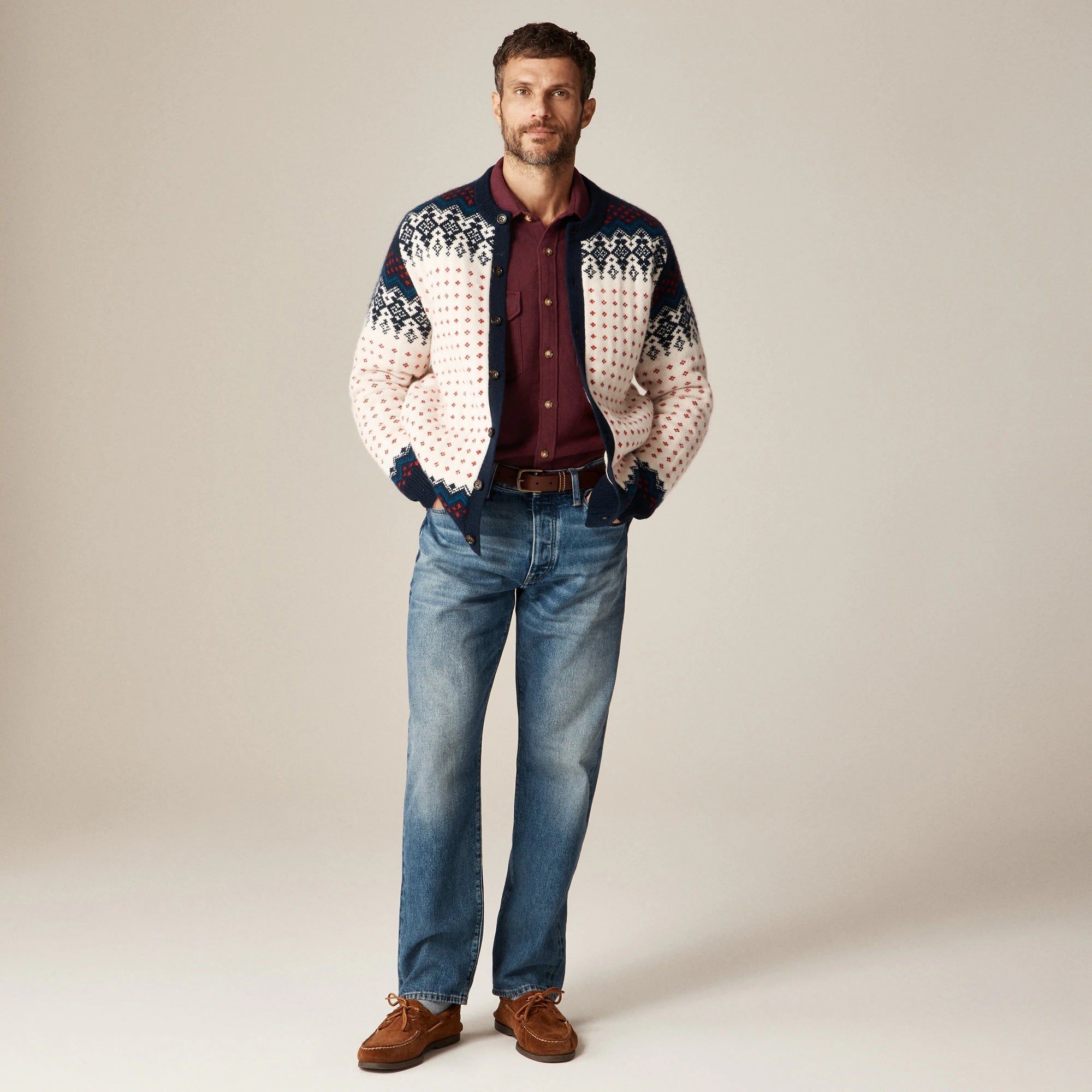 A 100 percent lambswool style that's made for layering. Crafted from incredibly soft lambswool, this instant classic features a Fair Isle pattern that traces its origins to the Shetland Islands off the windy coast of Scotland.