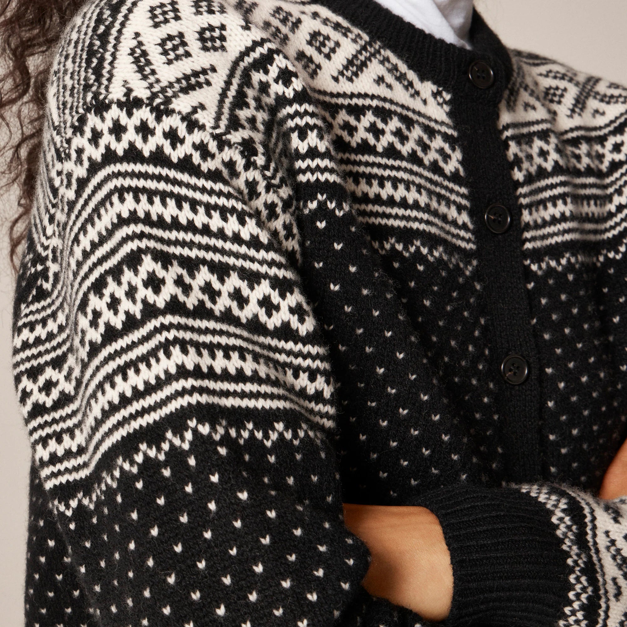 The quickest way to make any outfit more festive. You pretty much can't go wrong with a Fair Isle cardigan, especially one made from lambswool. It's soft, warm and always a good decision when the temperature starts to drop. This one has a boxier fit and an eye-catching pattern knit from black-and-white yarns.