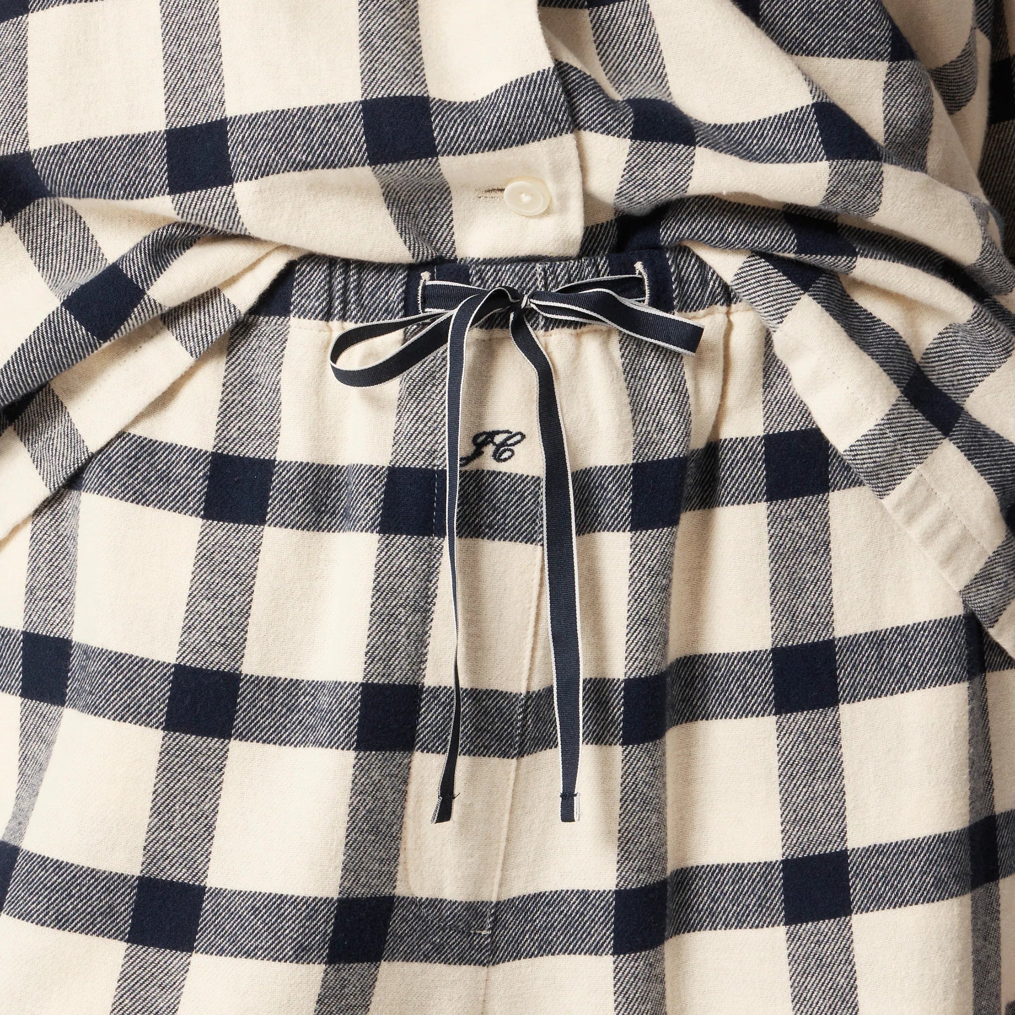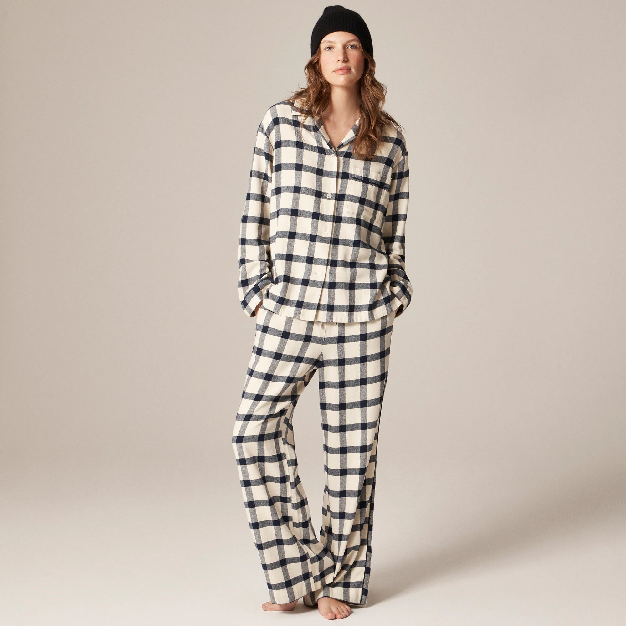 The pj set of our dreams, in soft cotton flannel. We updated our flannel fabric in breathable-yet-cozy 100 percent cotton, so you can rest even easier. It comes with a pair of high-rise, wide-leg pants embroidered with a small "JC" logo at the waistband, plus a comfy button-up shirt.