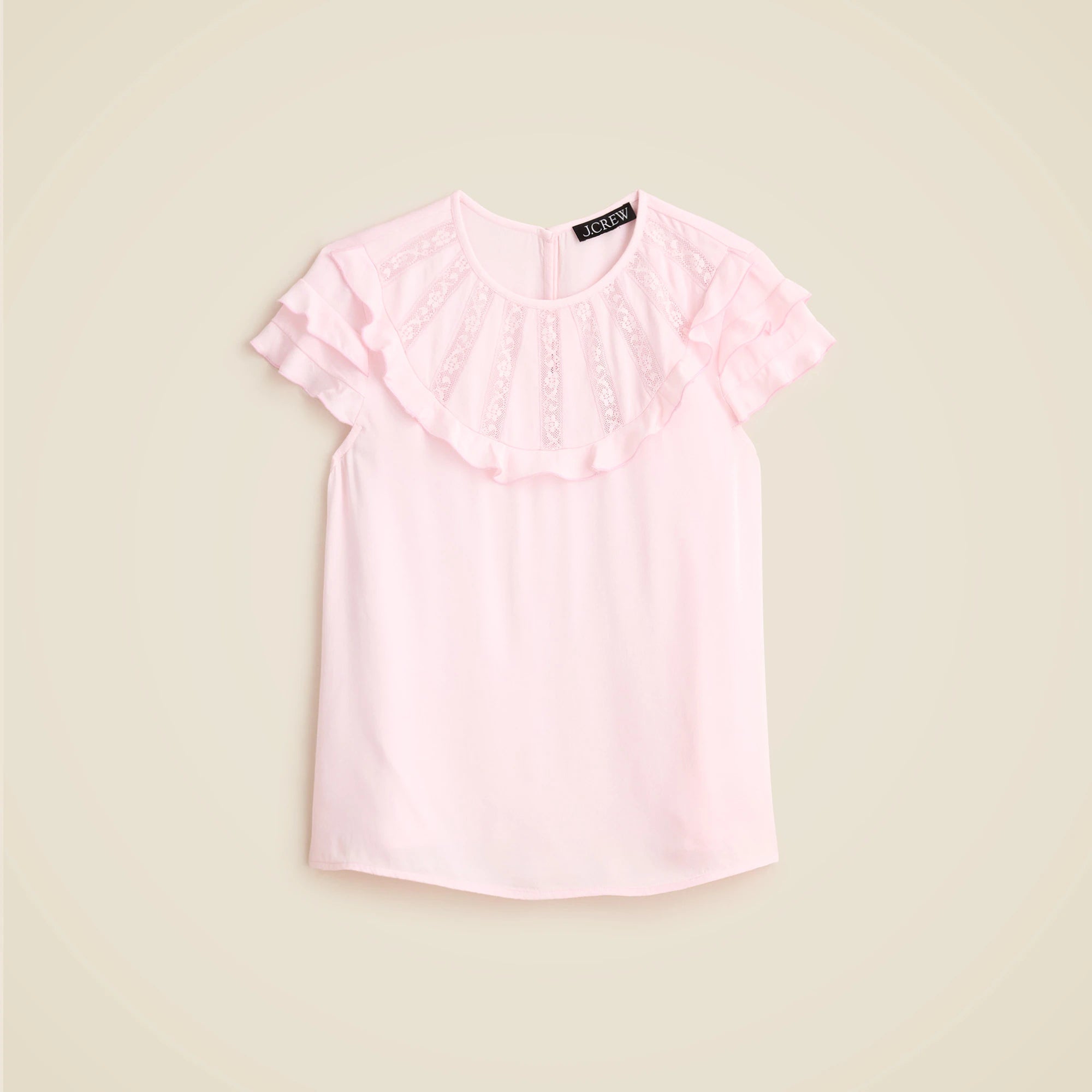 A polished take on pretty. This short-sleeve blouse is softly structured with flutter sleeves, lace panels along the front and ruffles at the chest. Plus, it's crafted from our crepe de chine, which is incredibly smooth, soft and light on the body.