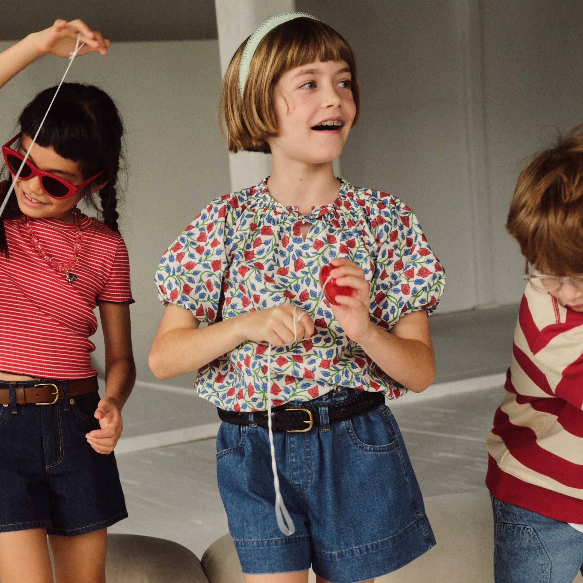 Her take on the trending bubble top. This sweet style is perfect for spring, with easy shirring along the neckline and voluminous puff sleeves. Plus, she can dress it up with a matching printed skirt!