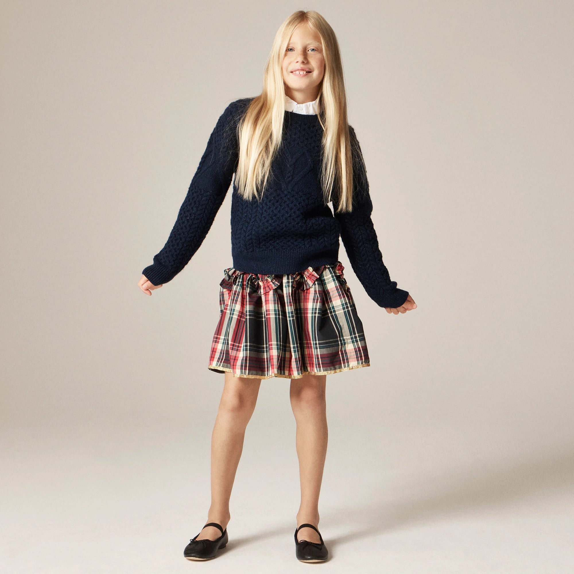 This skirt is a design-team favorite for many reasons. . . Our classic style feels especially luxe, thanks to the timeless pull-on silhouette, zigzag ruffles and tinsel-inspired trim along the bottom hem. P.S. Cue the family photos. . . We made matching tartan styles for the whole crew!