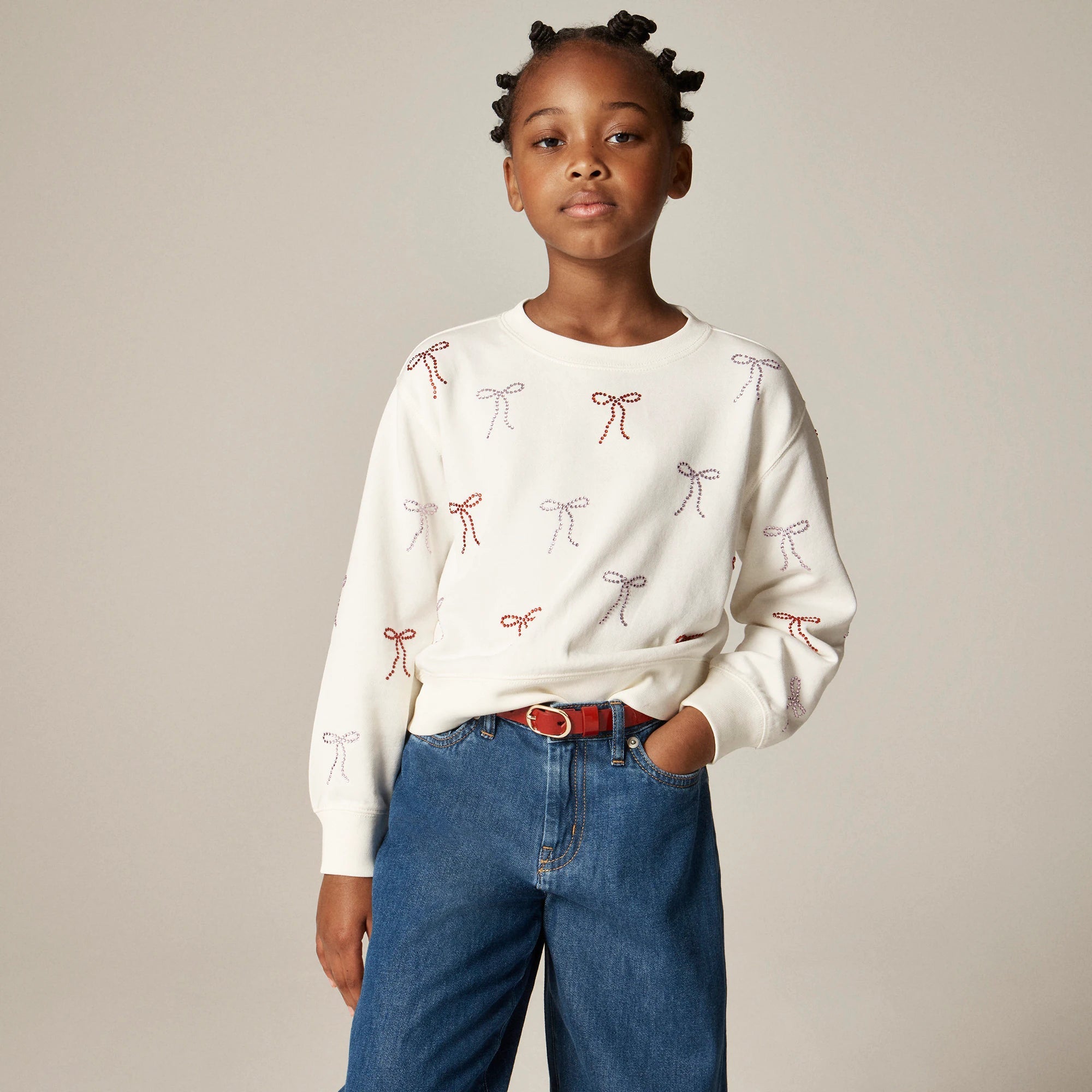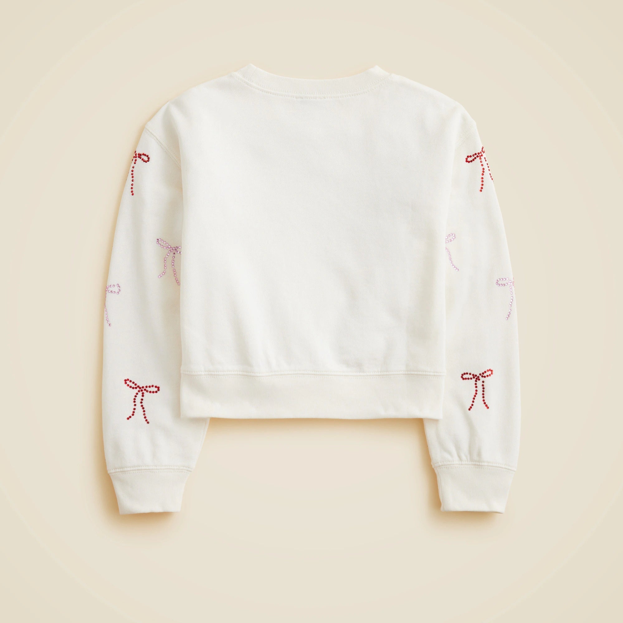 Who says basics have to be boring? This cozy sweatshirt is full of sparkling personality, thanks to bow-shaped crystal embellishments!