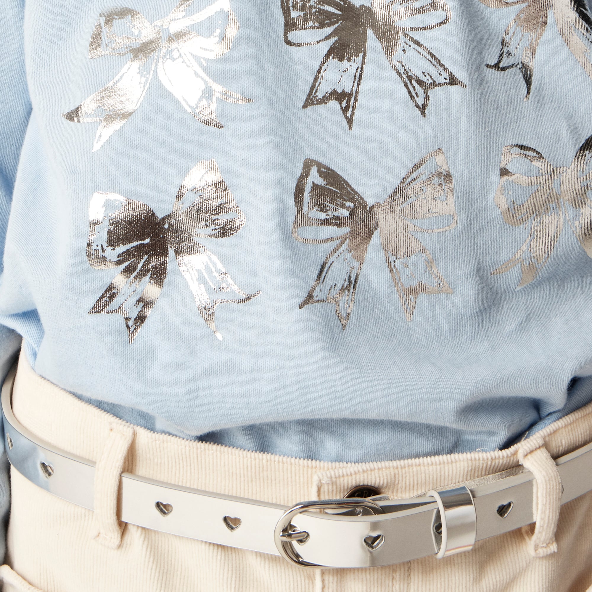 Take a bow! We topped this tee with plenty of silver-tone ribbons for a hint of shine.