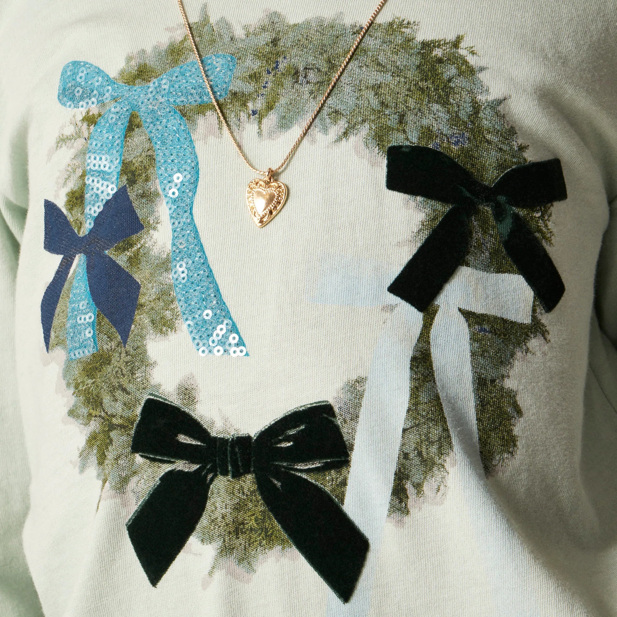 The best way to spread holiday cheer—put it on a T-shirt! Our new graphic does exactly that, thanks to a bow-draped wreath with sequin and velvet details.