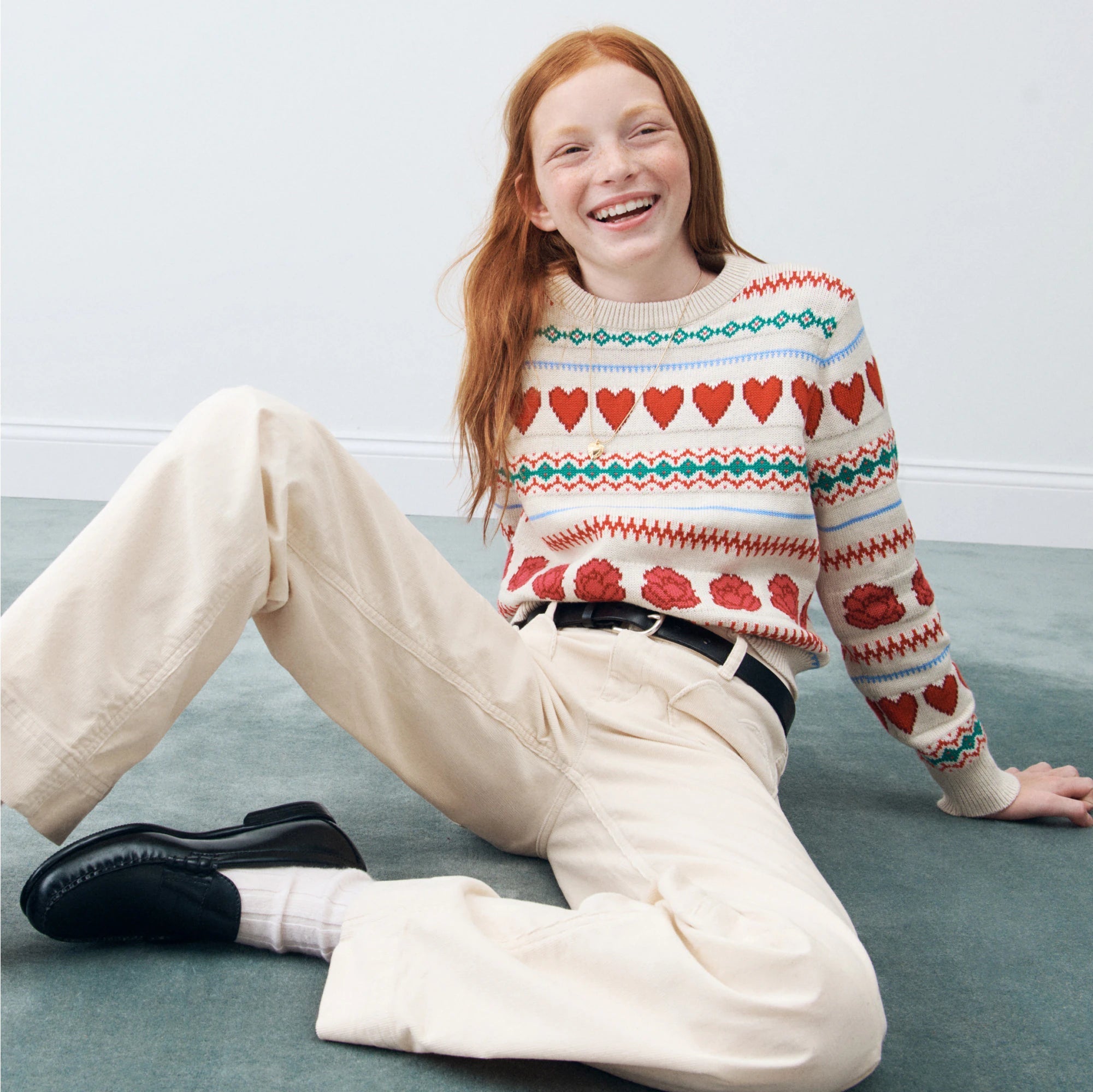A fresh take on Fair Isle. We updated our classic holiday pattern with the prettiest heart and rosette details, all in soft 100 percent cotton. What's not to love?
