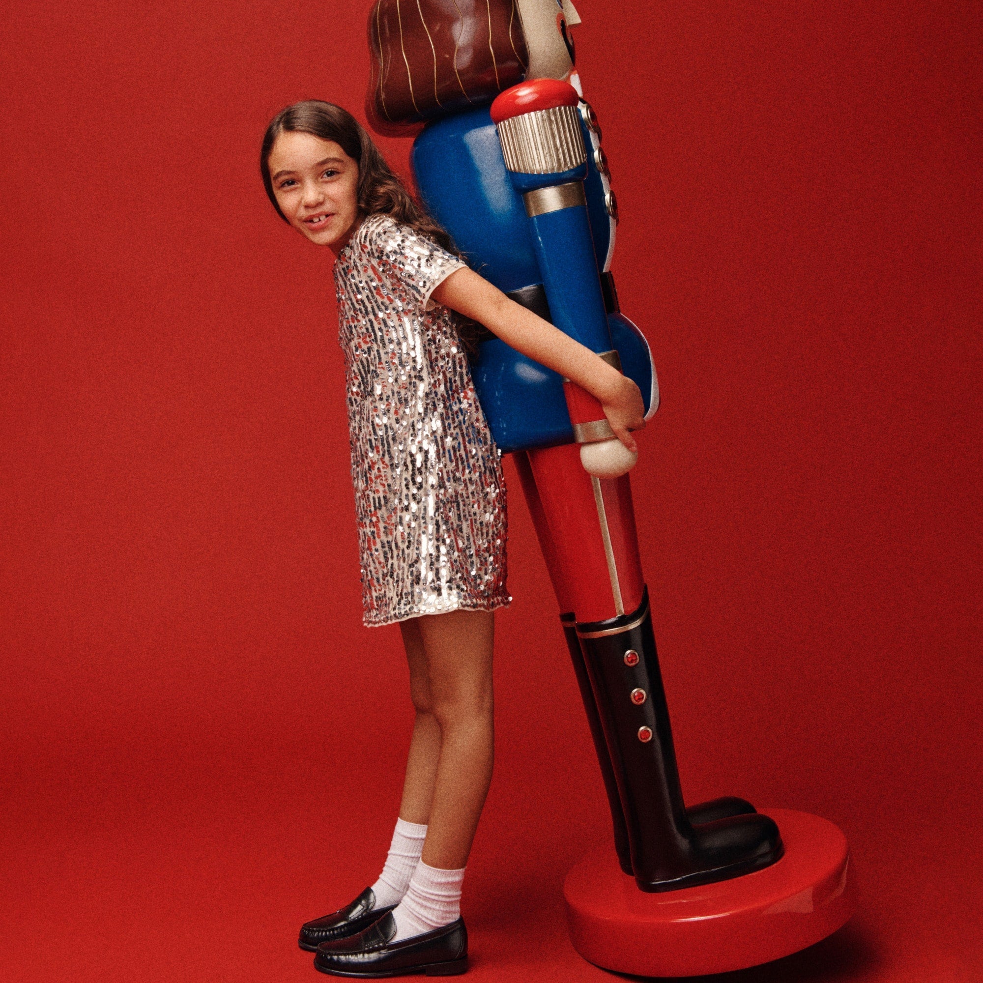 Add some extra twinkle this holiday season. Our embellished party dress features an easy shift silhouette—and always shows their sparkling personality.