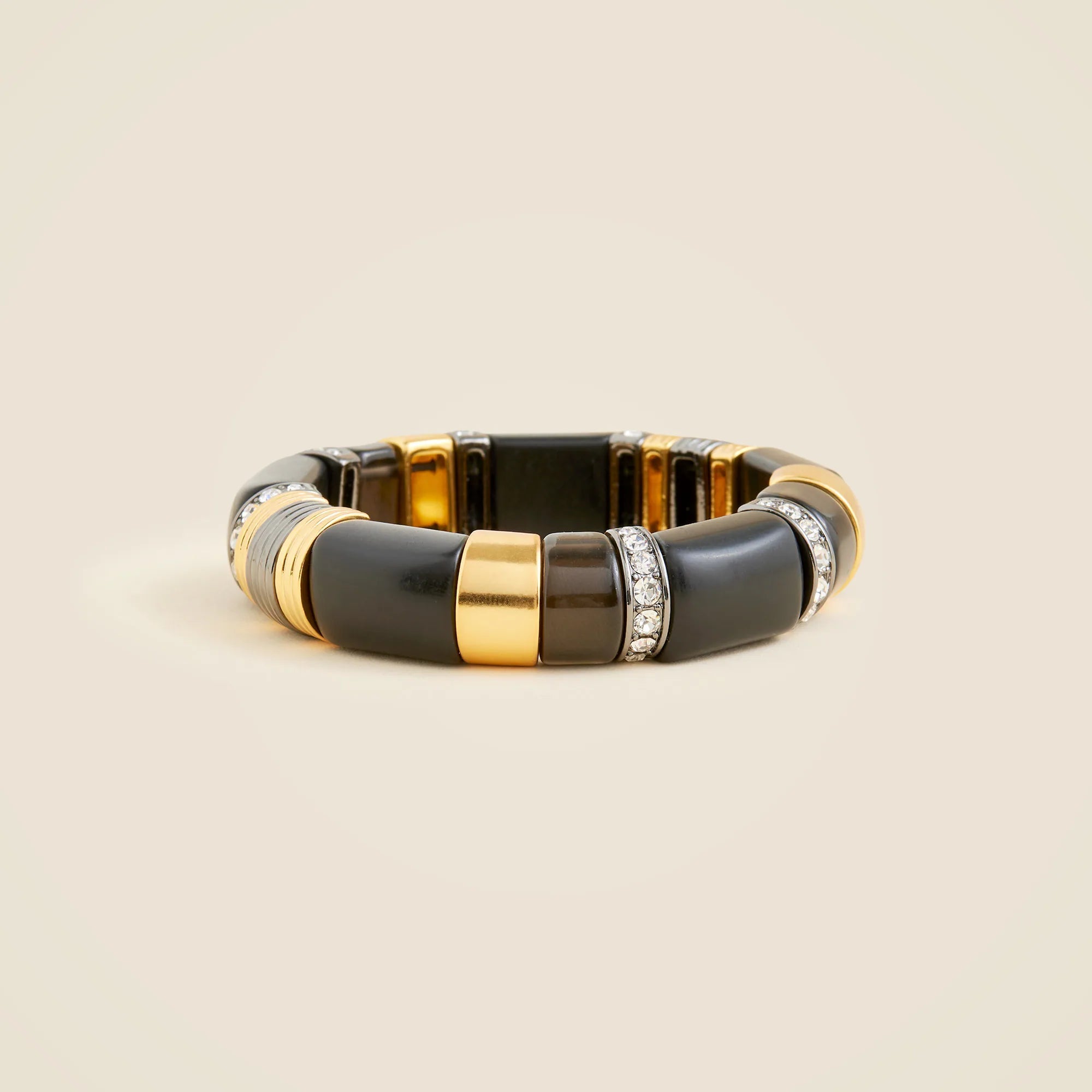 One of our favorite conversation starters this season. . .This sophisticated bracelet is handcut from colorful semiprecious stones and acetate (so no two are exactly alike). Want to keep your jewelry looking like new? We recommend removing it before showering or exercise and putting it on after applying hair products or perfume. To clean your pieces, polish them with a soft, dry cloth—and when not wearing, store them in a pouch or jewelry case.