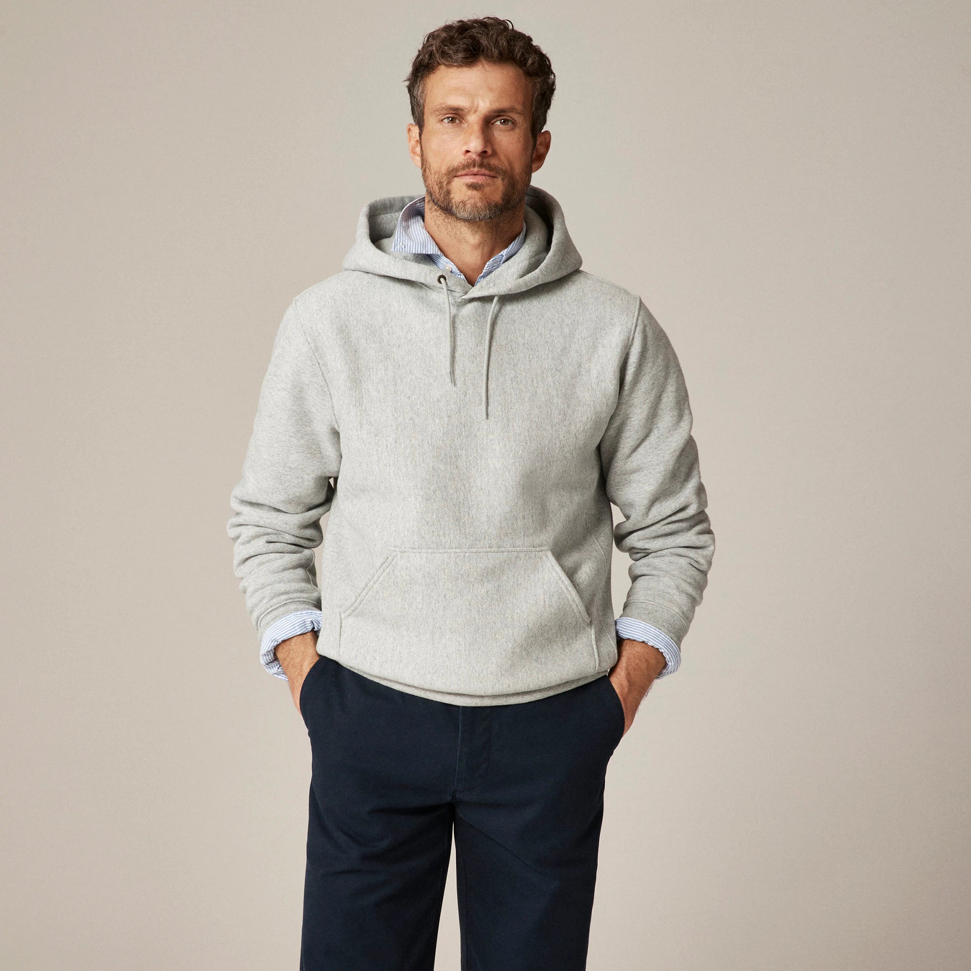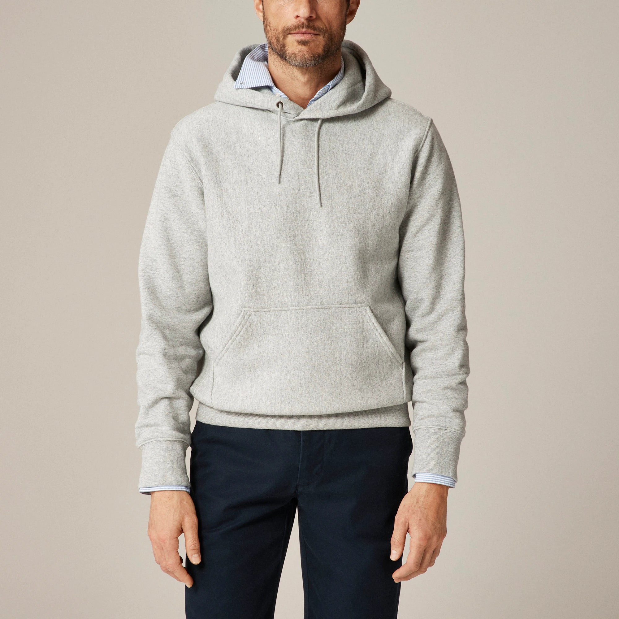 We had a goal when we set out to make this hoodie: Create a sweatshirt that can stand up to daily wear and tear, looks great with everything and feels just like an old favorite right from the start. Cut on the cross grain (an old-school method that prevents shrinkage), this 14-ounce cotton-polyester fleece is heavy enough to keep you warm but light enough that you can practically wear it all year-round. The interior is brushed for softness, and the richly dyed colors will only look better the more you wear them. All in all, this isn't just a new layer—it's your new best friend.