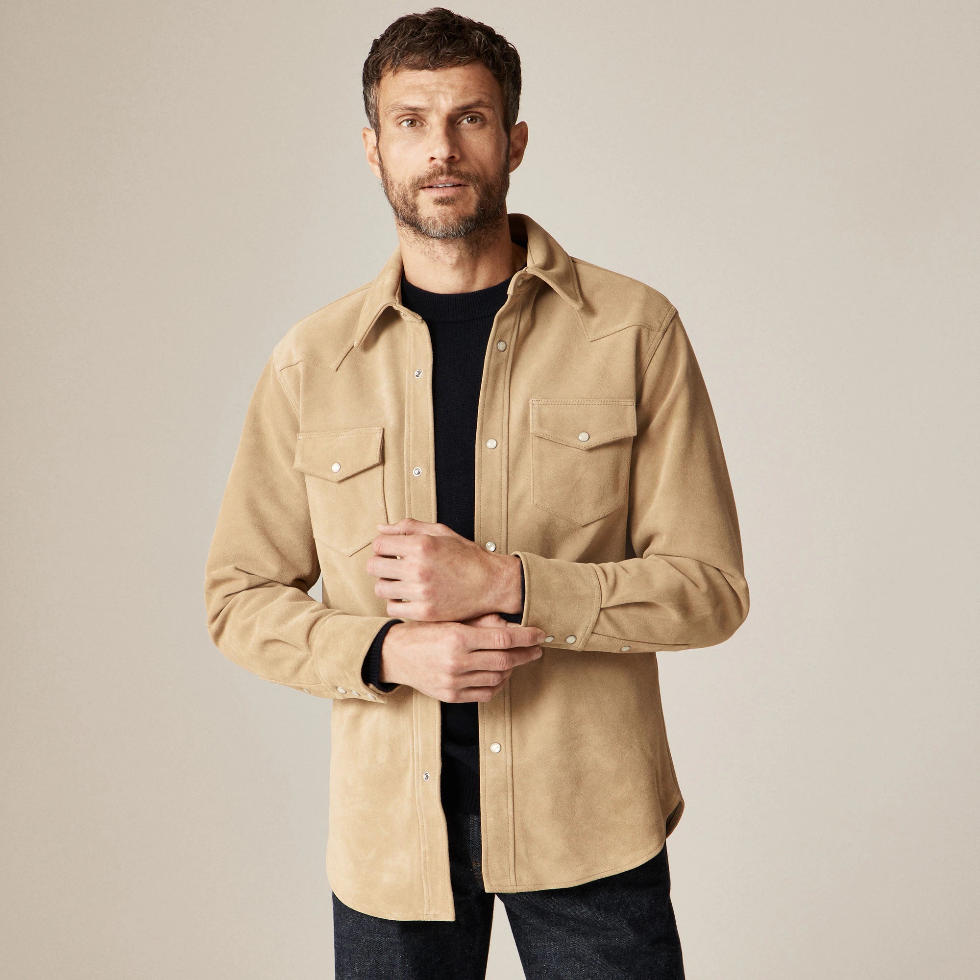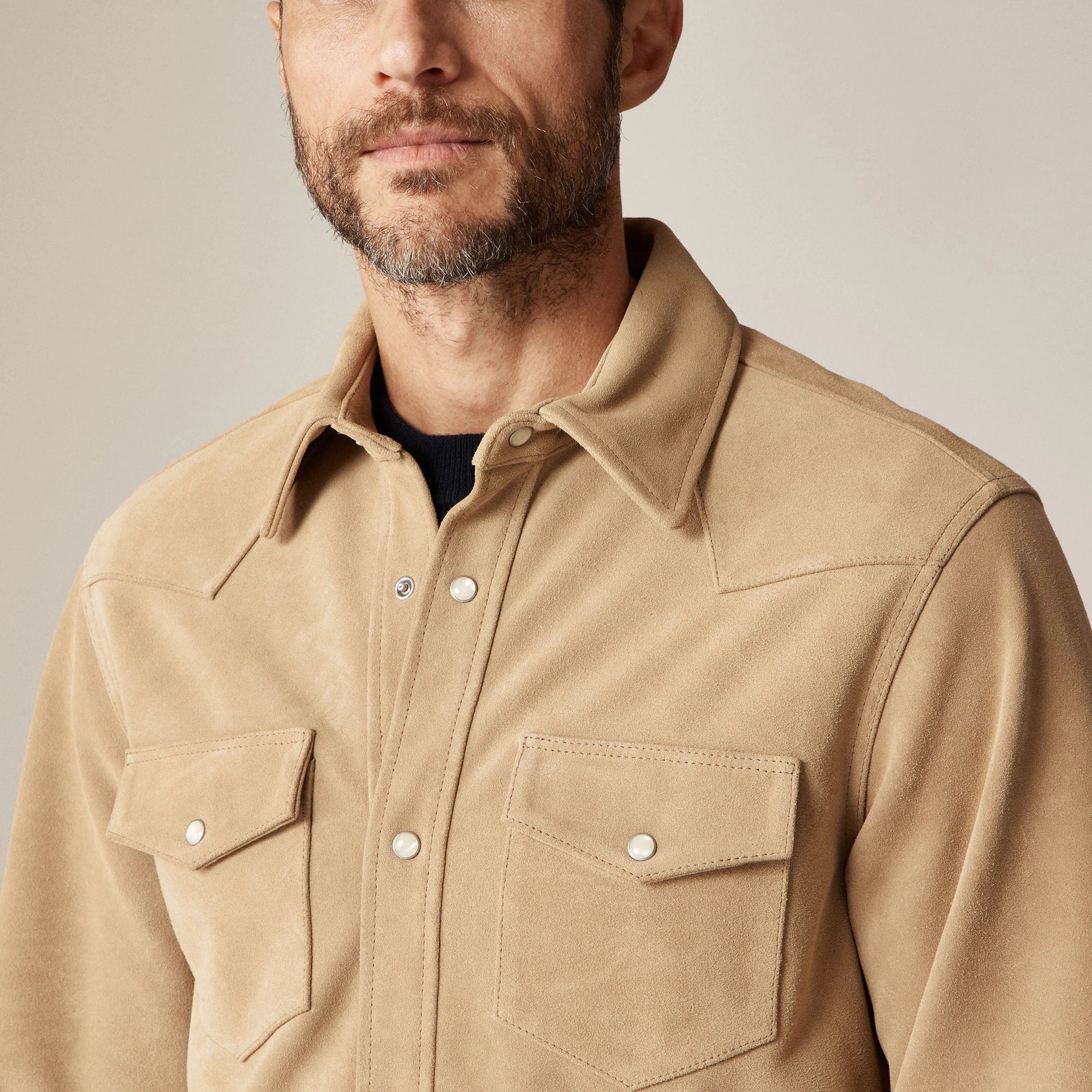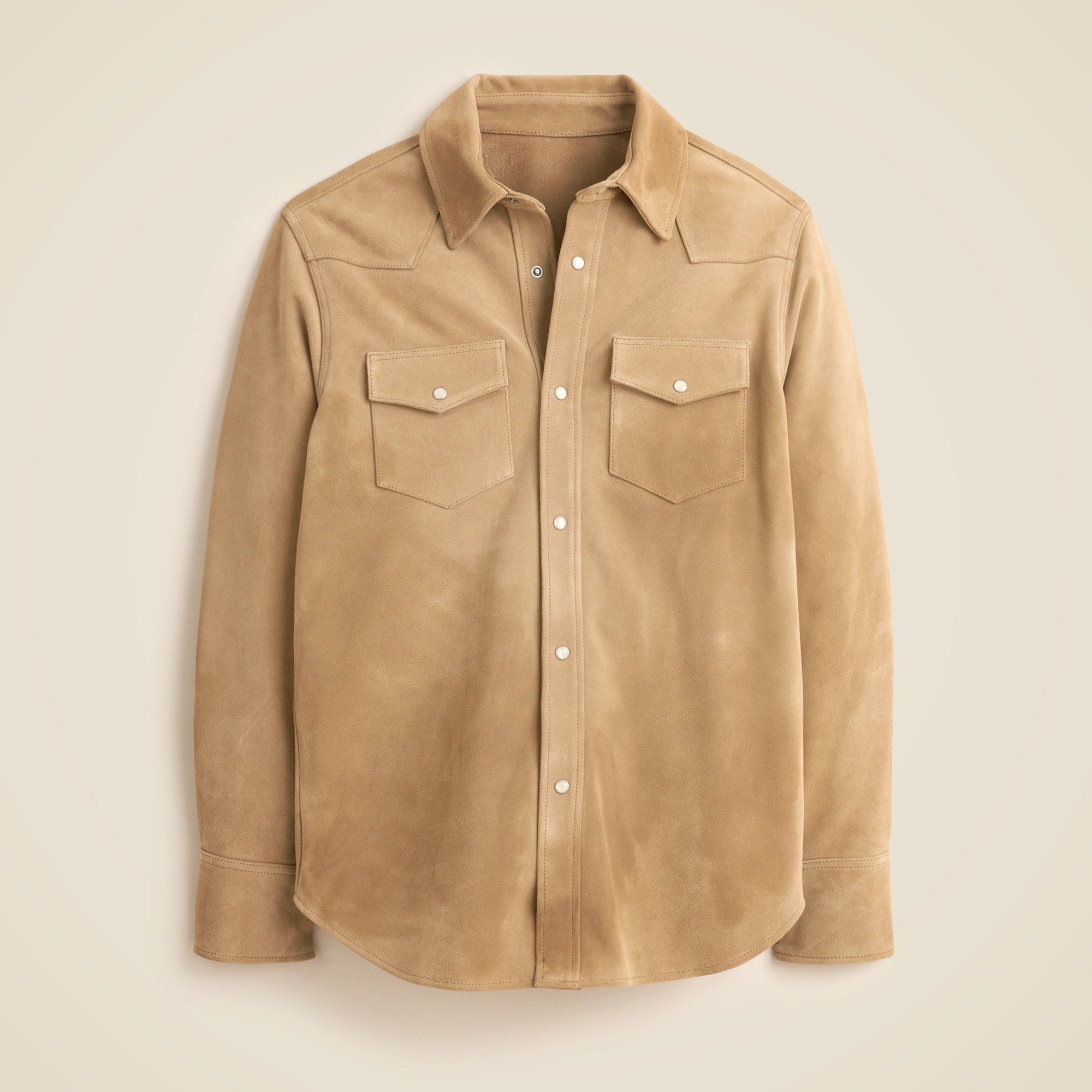 Based on traditional western styles, we made this overshirt in premium Italian suede with a front and back yoke. You'll find pearlized snaps on the front placket, chest pockets and cuffs. Wear it over a tee with denim or toss it over a sweater when you want a layered look. This suede overshirt will break in and become even softer the more you wear it.