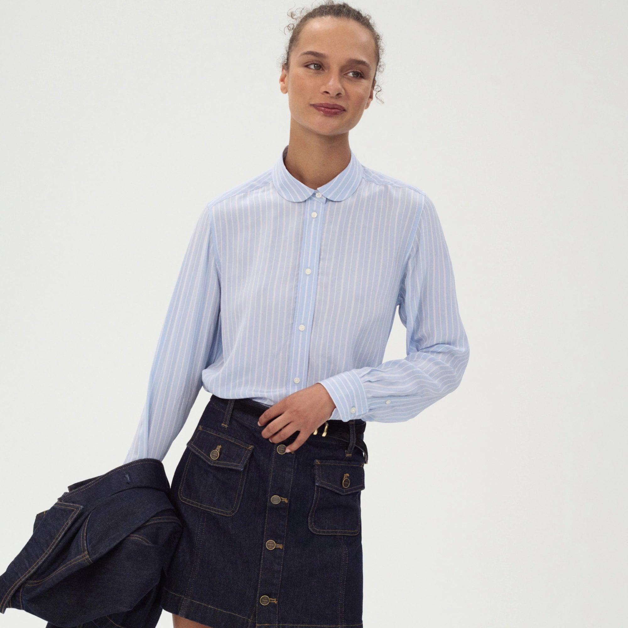 We made the ideal button-up. . .Our design team spent months fine-tuning this new fit. It's cut in a classic silhouette (similar to our Garçon shirt), with slimmer sleeves for an elegant, modern shape that layers effortlessly under blazers and sweaters. Made from our smooth crepe de chine with a subtle sheen, it's equal parts comfortable and refined—and feels like it was tailored just for you. This version also comes with a club collar detail for a unique, prep-inspired touch.