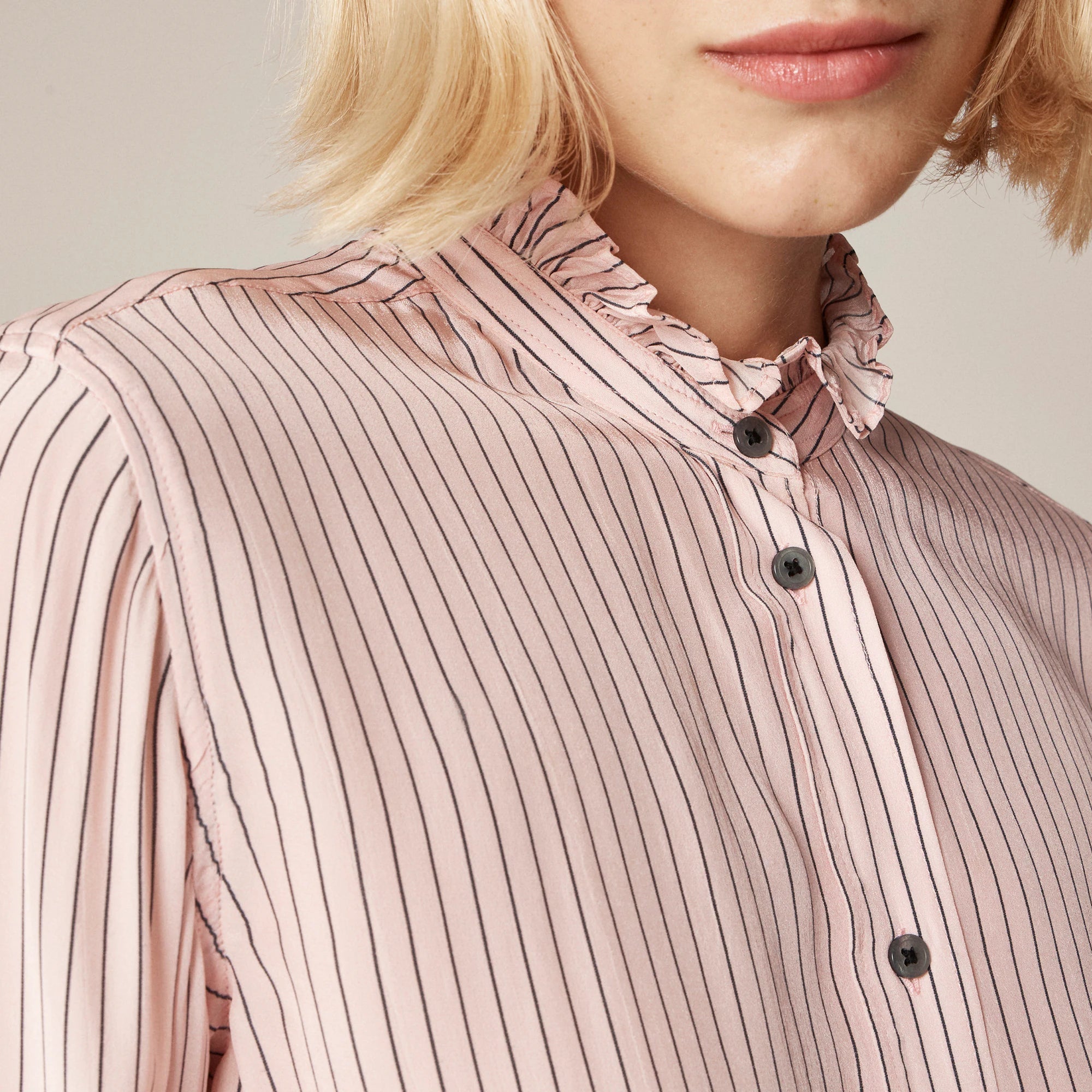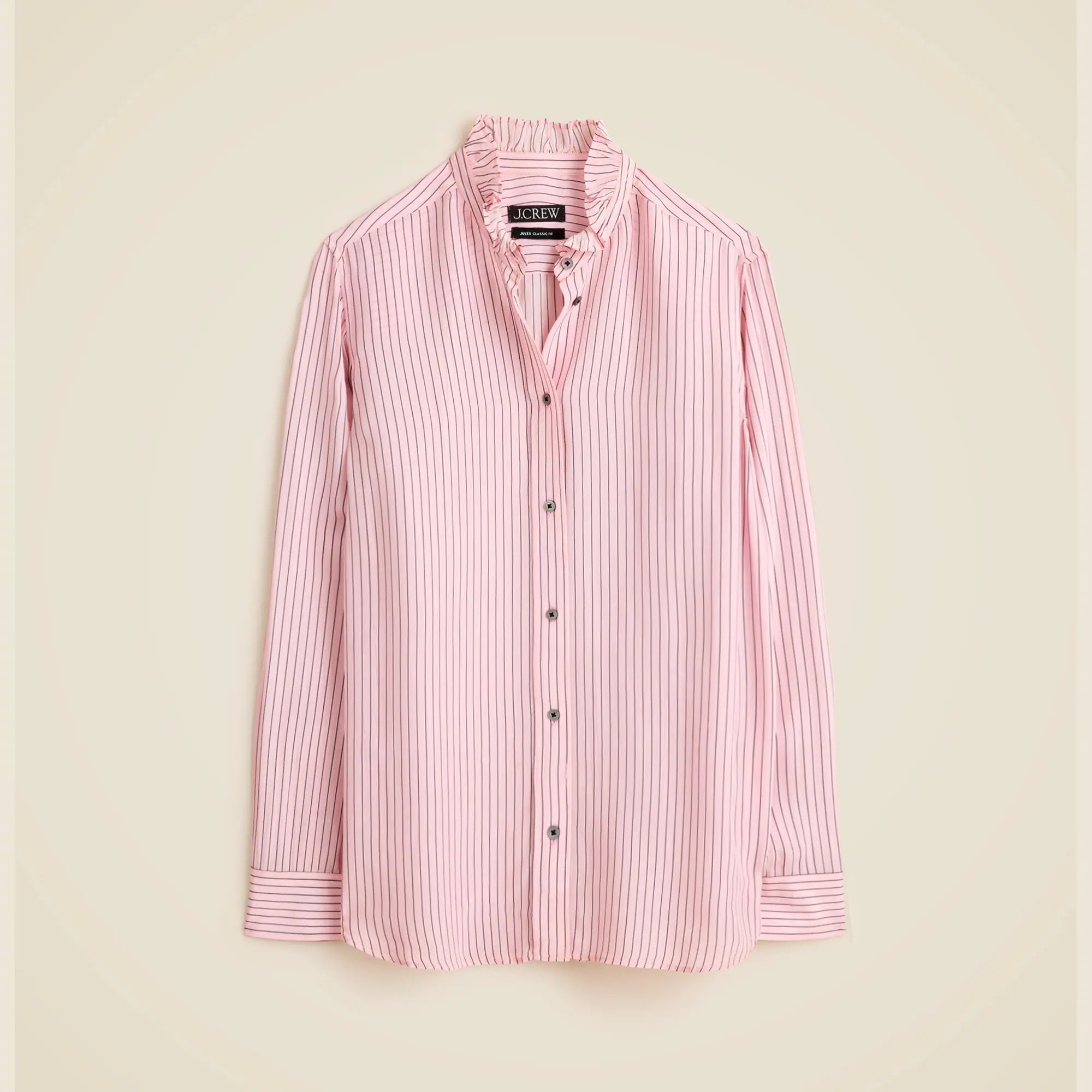 We made the ideal button-up. . . Our design team spent months fine-tuning this new fit. It's cut in a classic silhouette (similar to our Garçon shirt), with slimmer sleeves for an elegant, modern shape that layers effortlessly under blazers and sweaters. Made from our smooth crepe de chine with a subtle sheen, it's equal parts comfortable and refined—and it feels like it was tailored just for you. This version also comes with ruffle-trim details along the collar for an extra hint of sweetness.