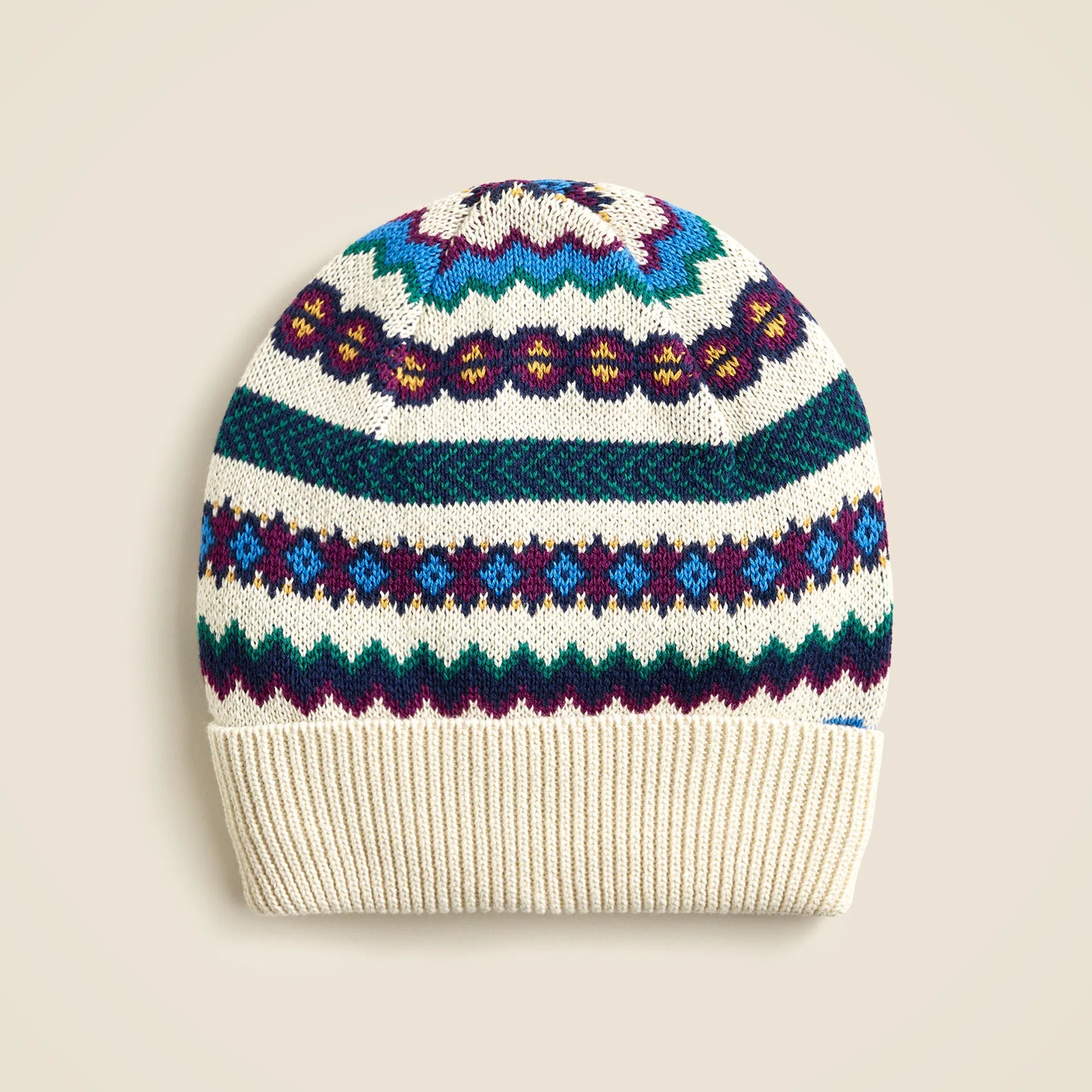 A cozy beanie to cap things off. We combined our all-time-favorite stripes and traditional Fair Isle for a colorfully patterned hat that's the best of both worlds. And for a winter matchy moment, we made a crewneck sweater to pair with it!