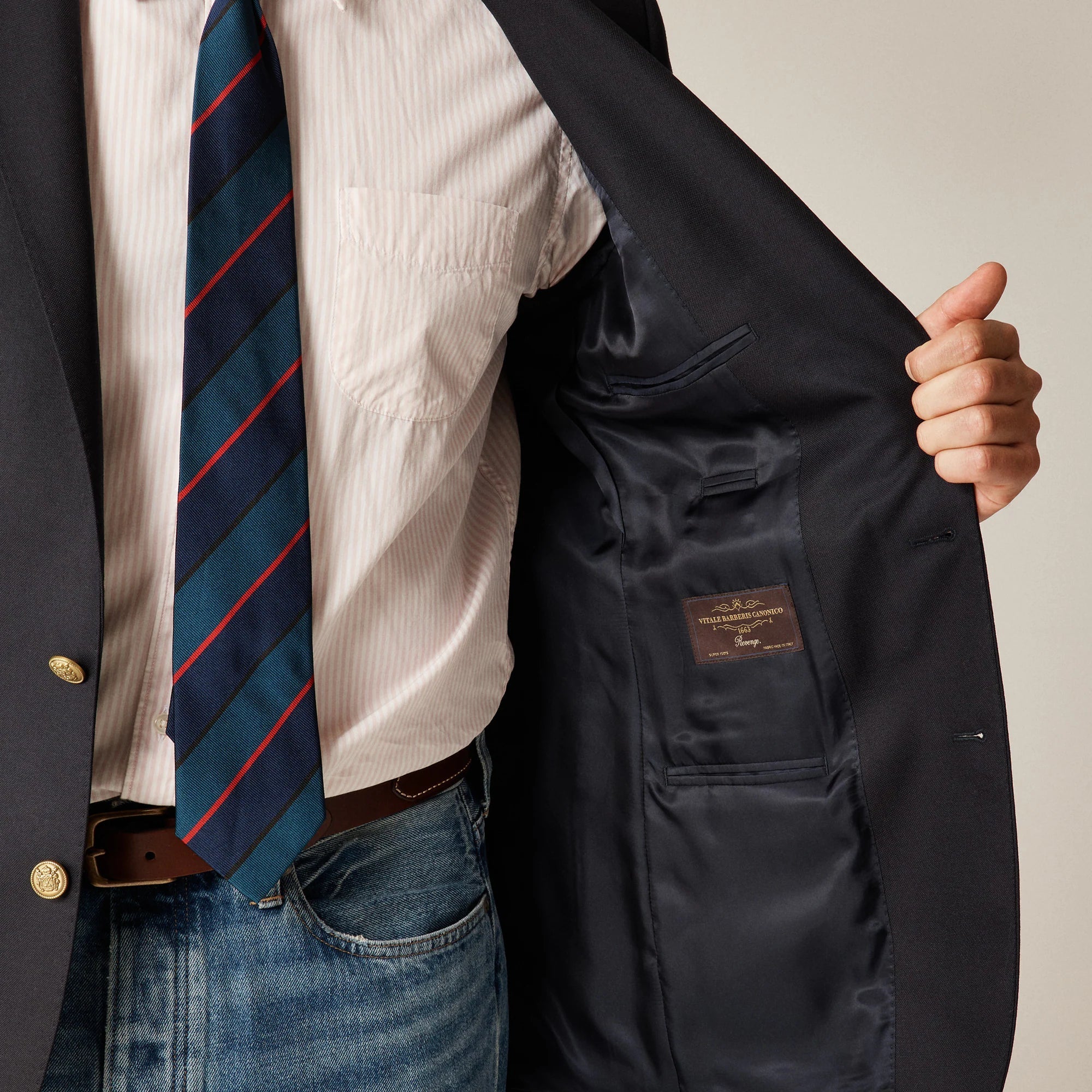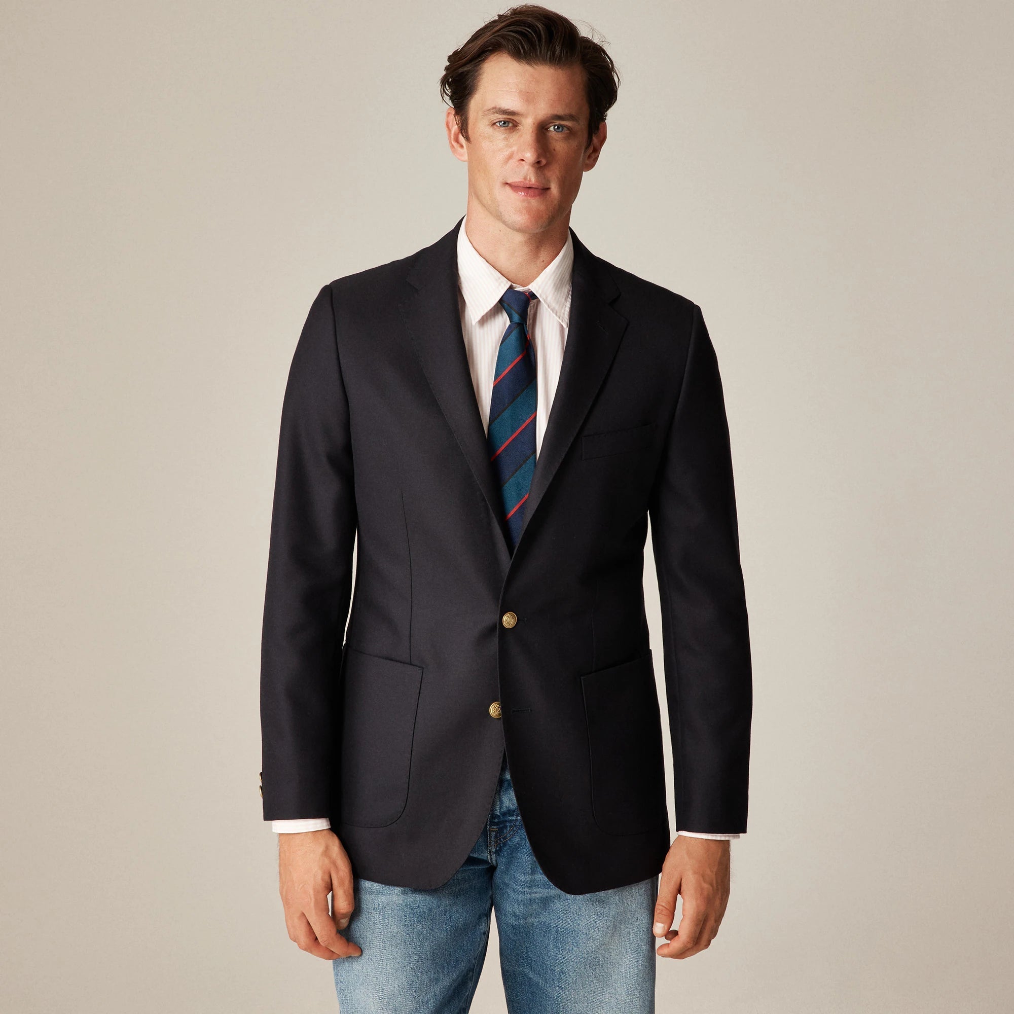 Welcome to the J.Crew Suit Shop, home of our three signature fits: Ludlow (a modern slim fit), Crosby (a traditional classic fit) and Kenmare (a relaxed-but-polished fit). We craft our suits in premium fabrics from some of the world's best mills using time-honored tailoring techniques. This fabric comes to us from Vitale Barberis Canonico (est. 1663). Since the Duke of Savoy became its first recorded customer 15 generations ago, this family business has been turning out top-quality fabrics like this 100 percent wool. The blazer comes with both gold-tone and faux-horn buttons, so you can choose your style.