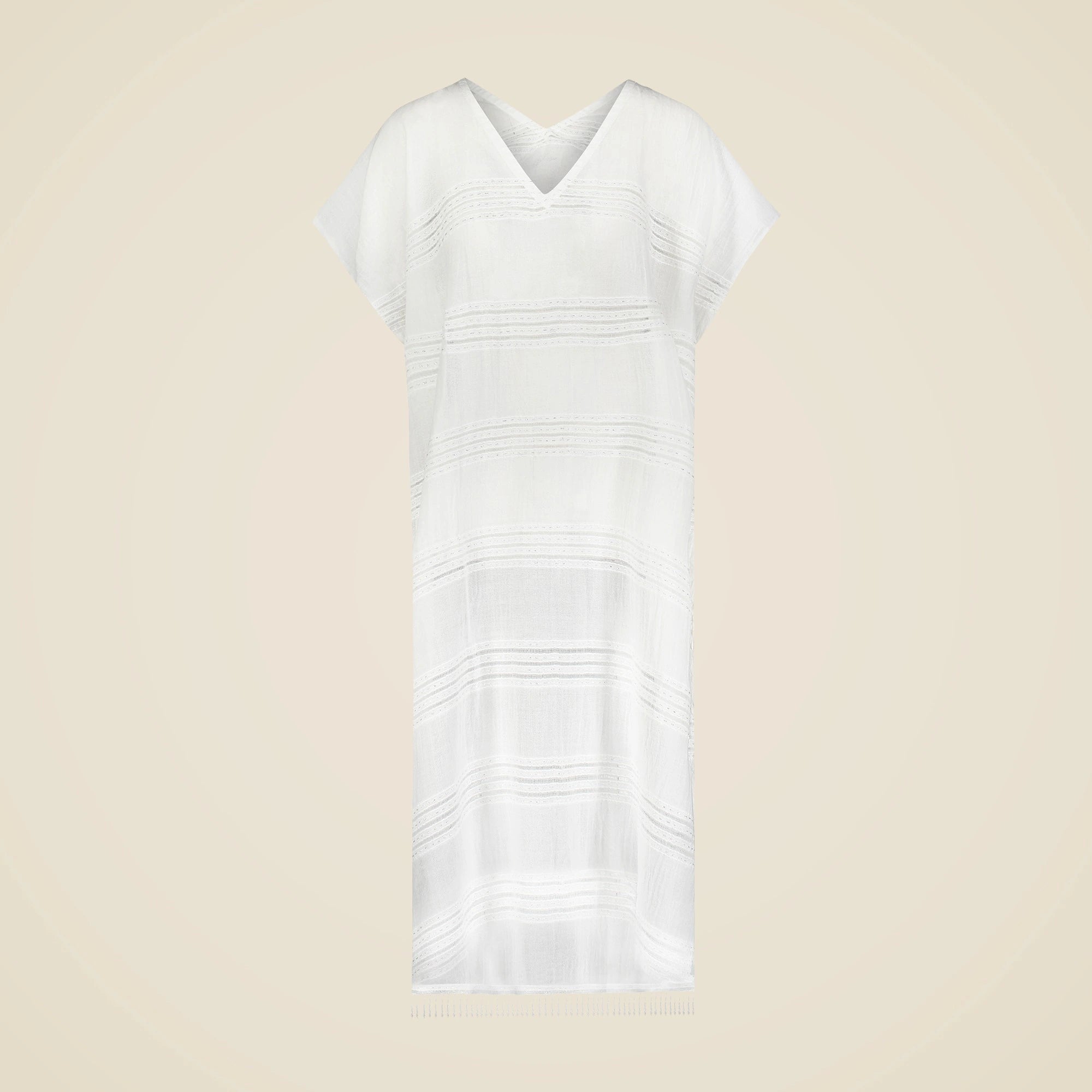 Supermodel and activist Liya Kebede started this handcrafted apparel and home collection - named for the Ethiopian word meaning "to bloom or flourish" - and employs local African artisans to create its unique statement pieces. Simple and elegant, the Abira collection features a textured solid and sheer weaving highlighted by delicate shimmering silver dots on a bright background. This classic caftan features a plunge neckline, short cap sleeves and hand-twisted fringe hem, making it the perfect beach cover-up. Handwoven in Ethiopia, this silhouette is made of soft, hand-spun cotton for a light and comfortable feel.