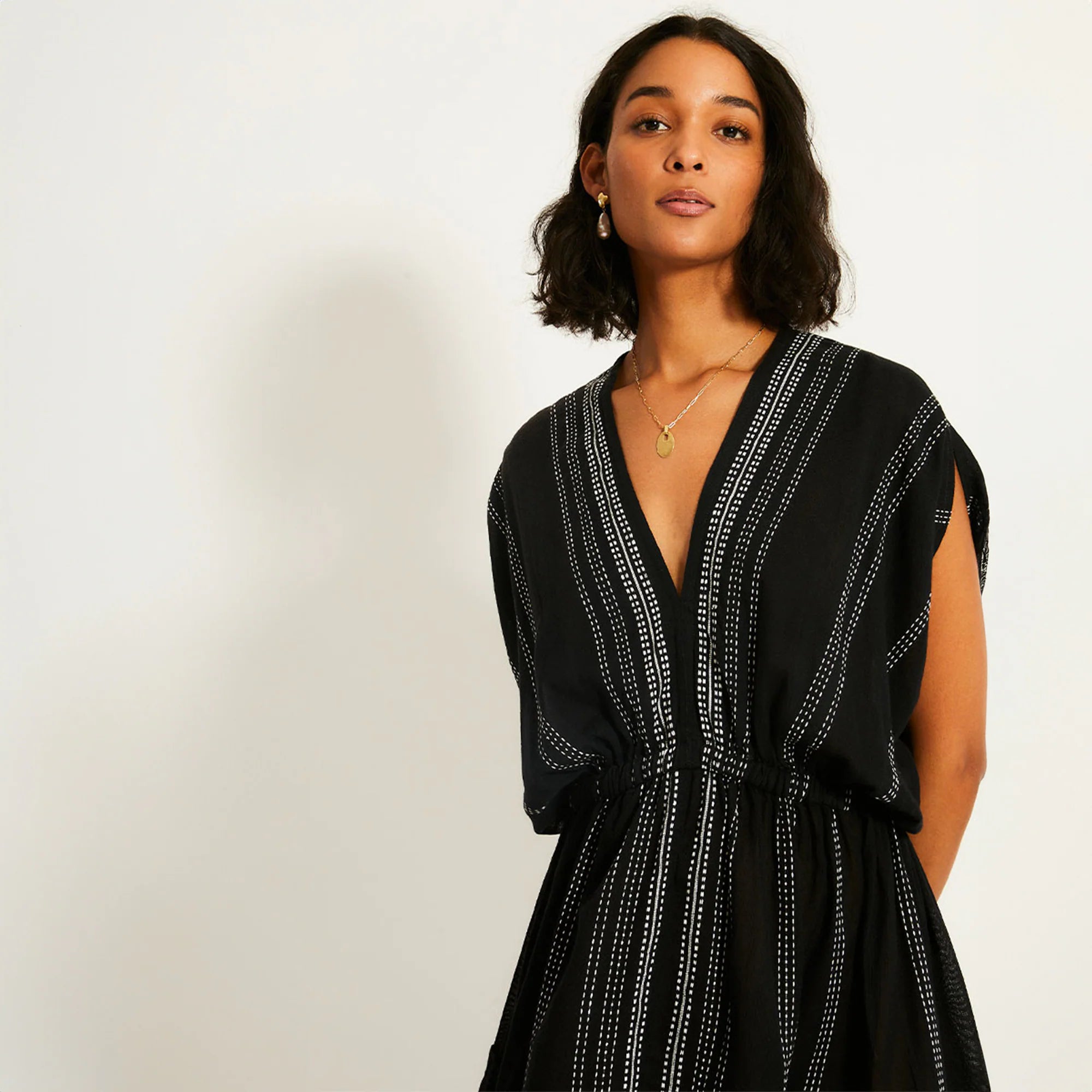Supermodel and activist Liya Kebede started this handcrafted apparel and home collection—named for the Ethiopian word meaning "to bloom or flourish"—and employs local African artisans to create its unique statement pieces. This short handwoven dress features dolman sleeves, a deep plunge neckline and a comfortable elastic waist, creating an hourglass silhouette. The ruffle hem makes this style a resortwear staple.
