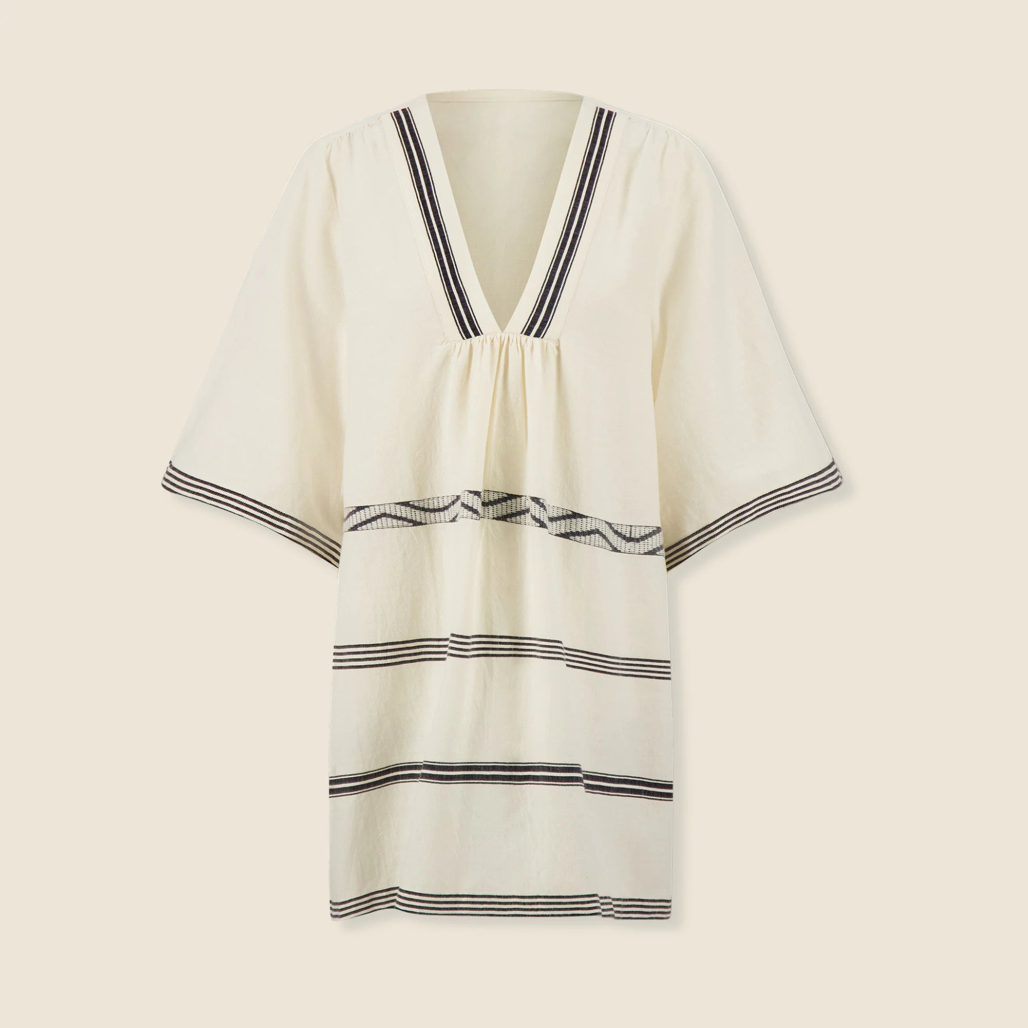 Supermodel and activist Liya Kebede started this handcrafted apparel and home collection—named for the Ethiopian word meaning "to bloom or flourish"—and employs local African artisans to create its unique statement pieces. This chic handwoven caftan features a mini silhouette with a flattering deep V neckline and bell sleeves for an effortlessly stylish and Bohemian look.