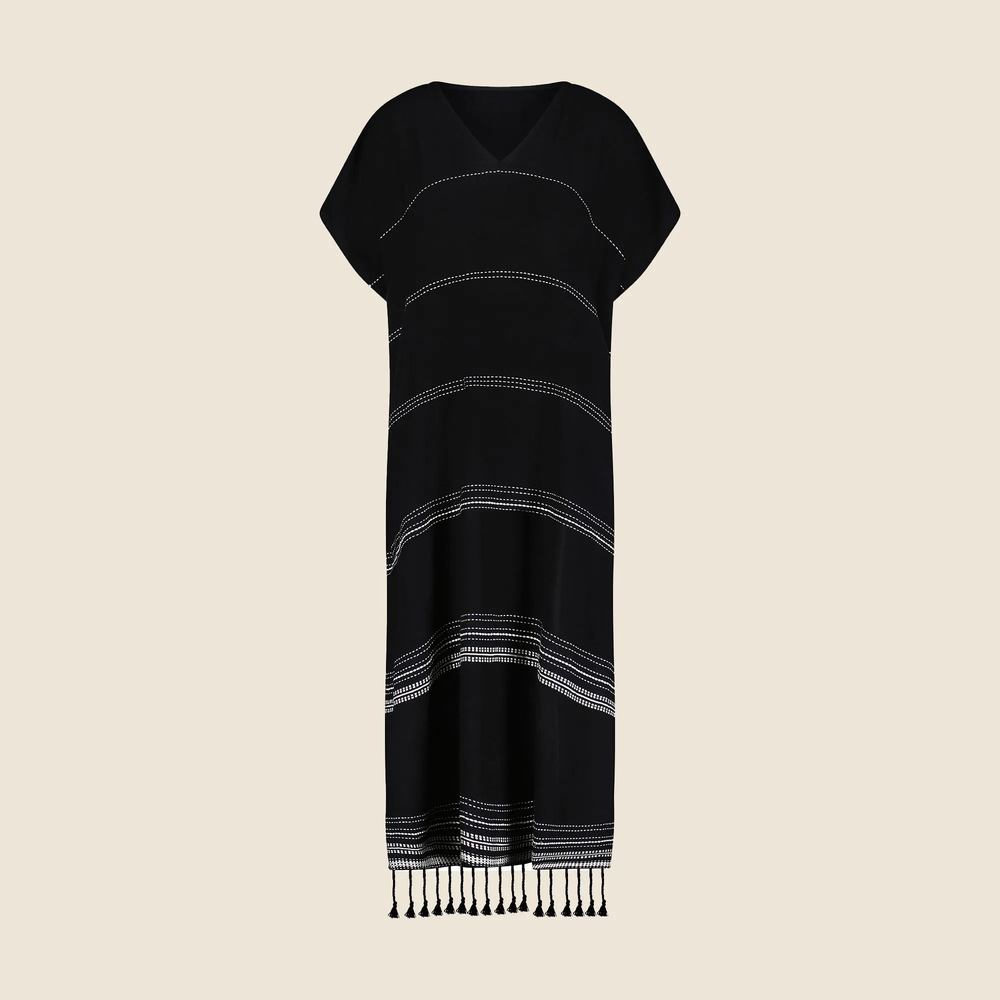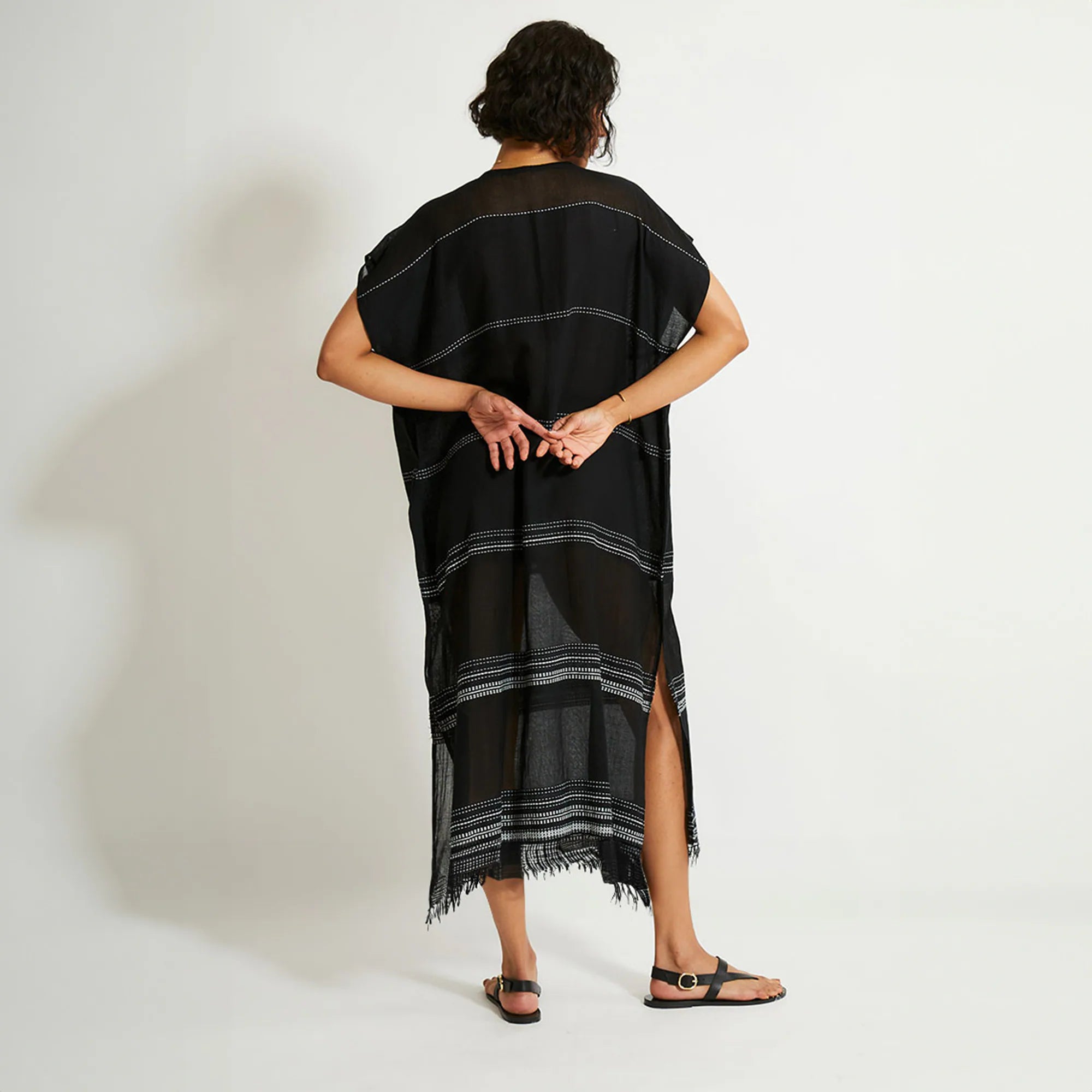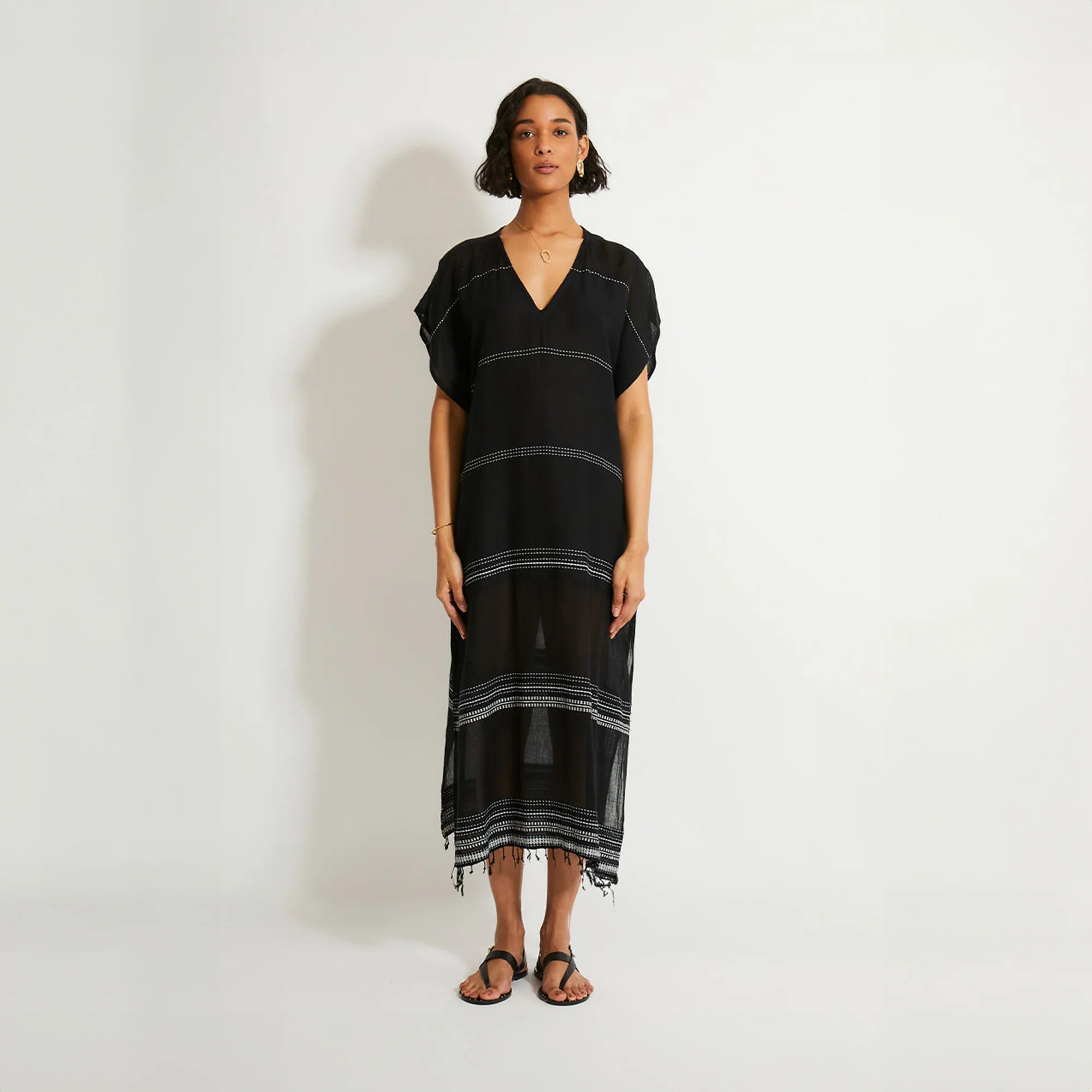 Supermodel and activist Liya Kebede started this handcrafted apparel and home collection—named for the Ethiopian word meaning "to bloom or flourish"—and employs local African artisans to create its unique statement pieces. This classic caftan features a plunge neckline, short cap sleeves and a hand-twisted fringe hem, making it the perfect beach cover-up.