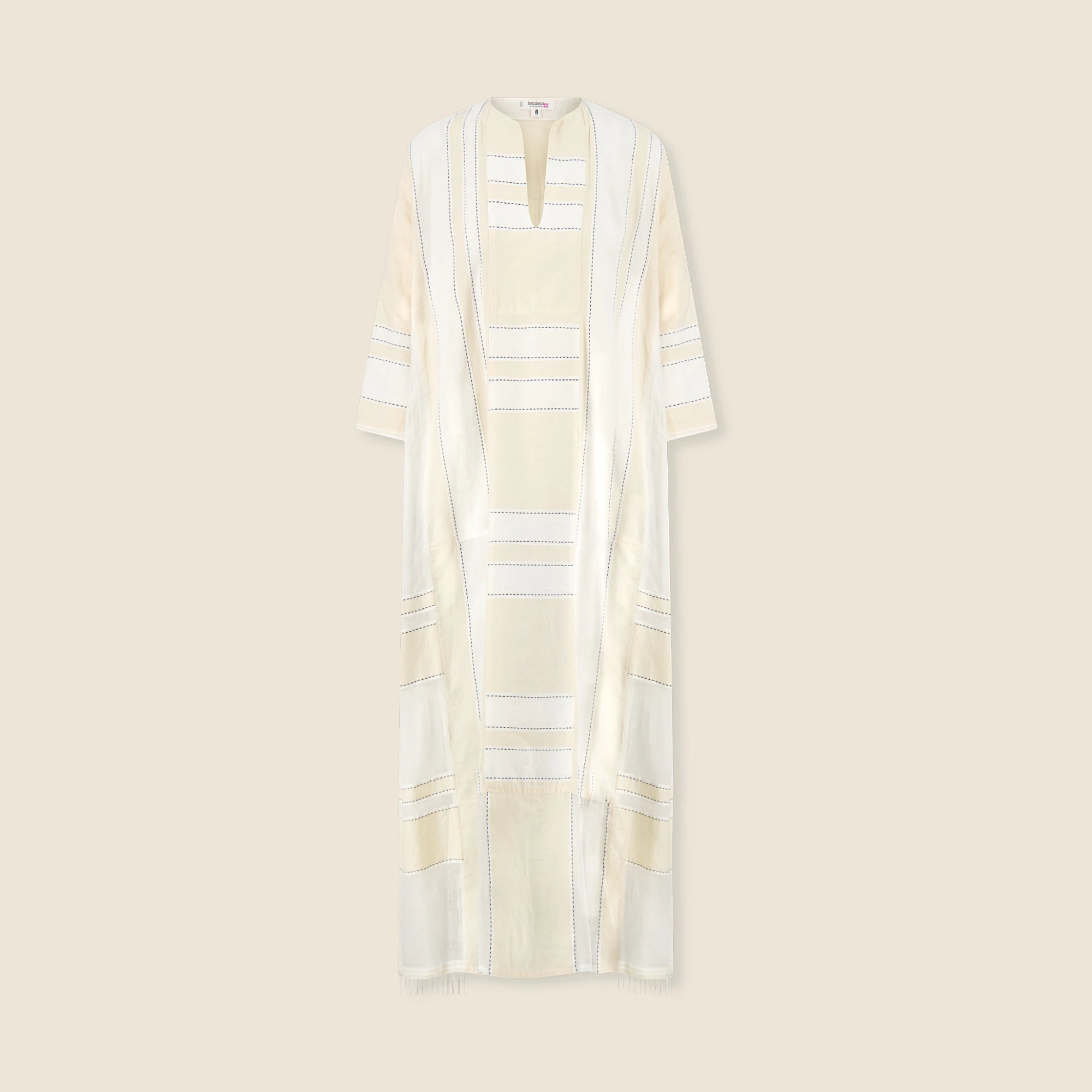 Supermodel and activist Liya Kebede started this handcrafted apparel and home collection—named for the Ethiopian word meaning "to bloom or flourish"—and employs local African artisans to create its unique statement pieces. This luxurious handwoven maxi caftan features long sleeves and a jewel neckline with a flattering deep slit. This versatile style can be worn as either a cover-up or a dress.