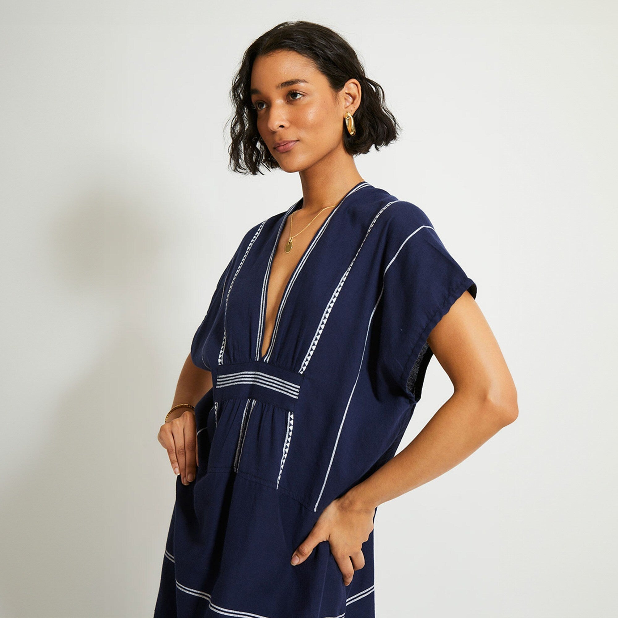 Supermodel and activist Liya Kebede started this handcrafted apparel and home collection—named for the Ethiopian word meaning "to bloom or flourish"—and employs local African artisans to create its unique statement pieces. This long caftan dress features a V neckline, elegant cap sleeves and a gathered empire waist. The dress's easy fit creates an hourglass silhouette highlighted by the gradual, flowy hem.