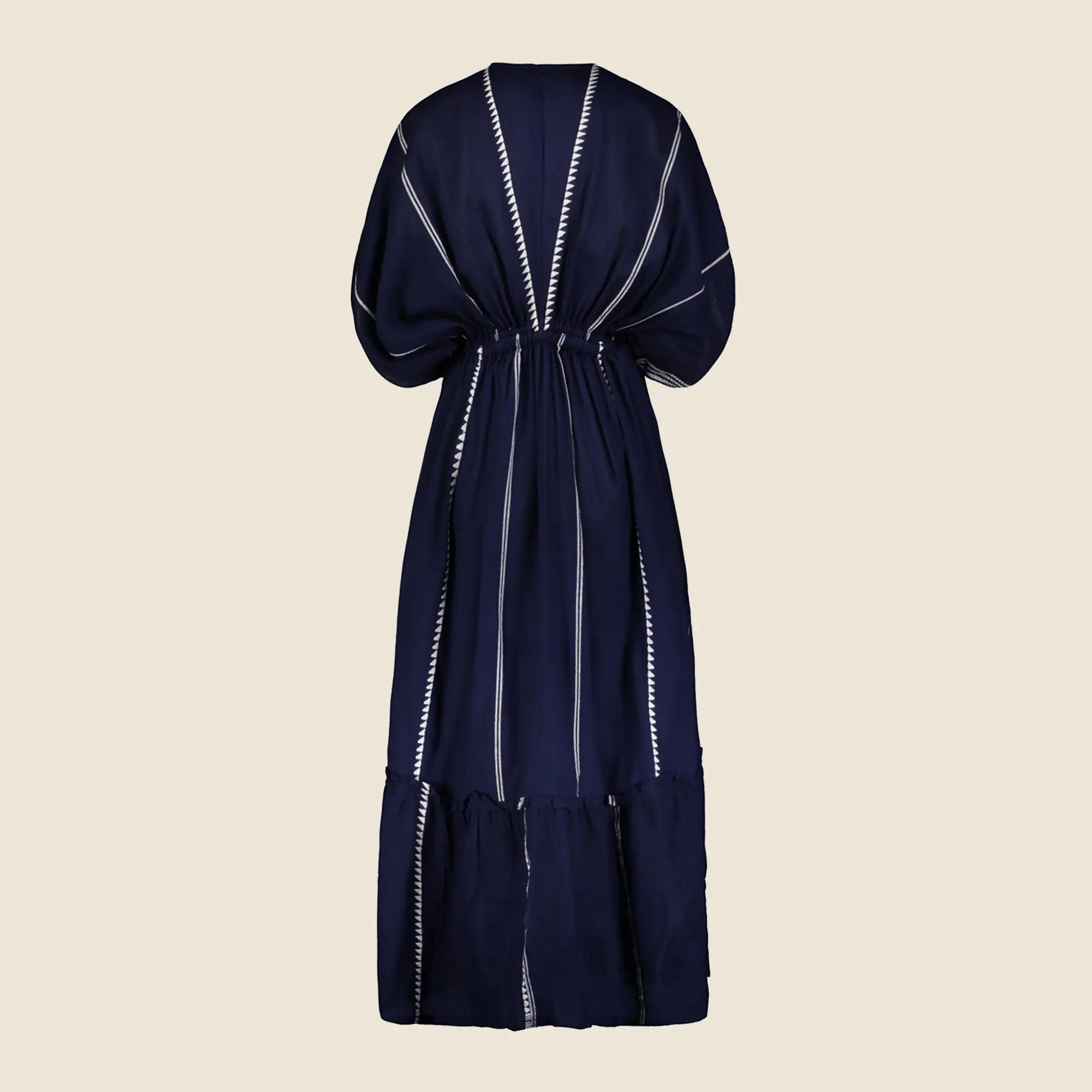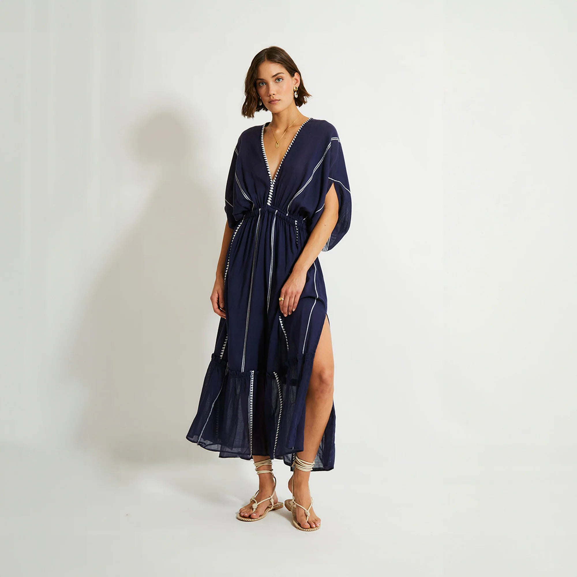 Supermodel and activist Liya Kebede started this handcrafted apparel and home collection—named for the Ethiopian word meaning "to bloom or flourish"—and employs local African artisans to create its unique statement pieces. This handwoven long dress features dolman sleeves, a deep plunge neckline and a comfortable elastic waist. The side slit and ruffle hem make this style a resortwear staple.