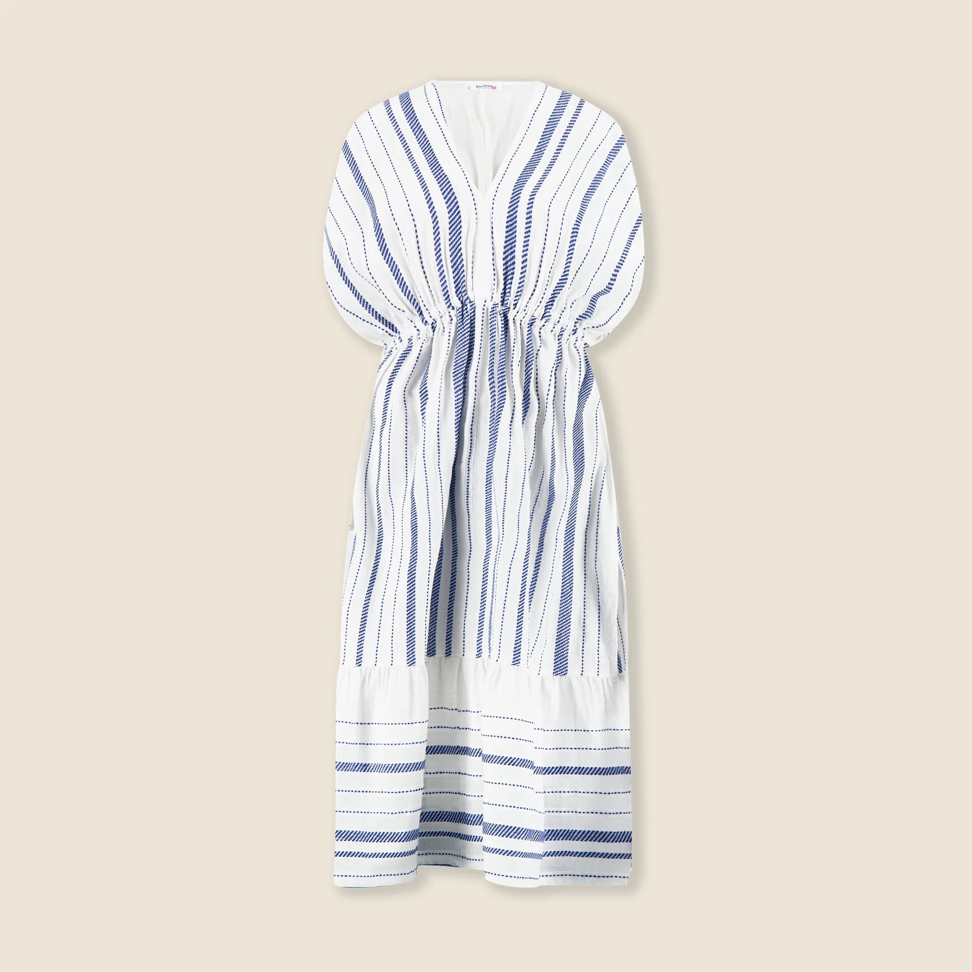 Supermodel and activist Liya Kebede started this handcrafted apparel and home collection—named for the Ethiopian word meaning "to bloom or flourish"—and employs local African artisans to create its unique statement pieces. The Tiki Azure Collection features crisp white fabric woven with diagonal dotted stripes in a bright hue with a subtle textured weave, creating a clean and effortless look. This versatile, long dress boasts dolman sleeves, a deep plunge neckline and a comfortable elastic waist, creating an hourglass silhouette. This style is a resortwear staple and a perfect day-to-evening dress. Handwoven in Ethiopia, this silhouette is made of a soft hand-spun cotton blend for a light and comfortable feel.