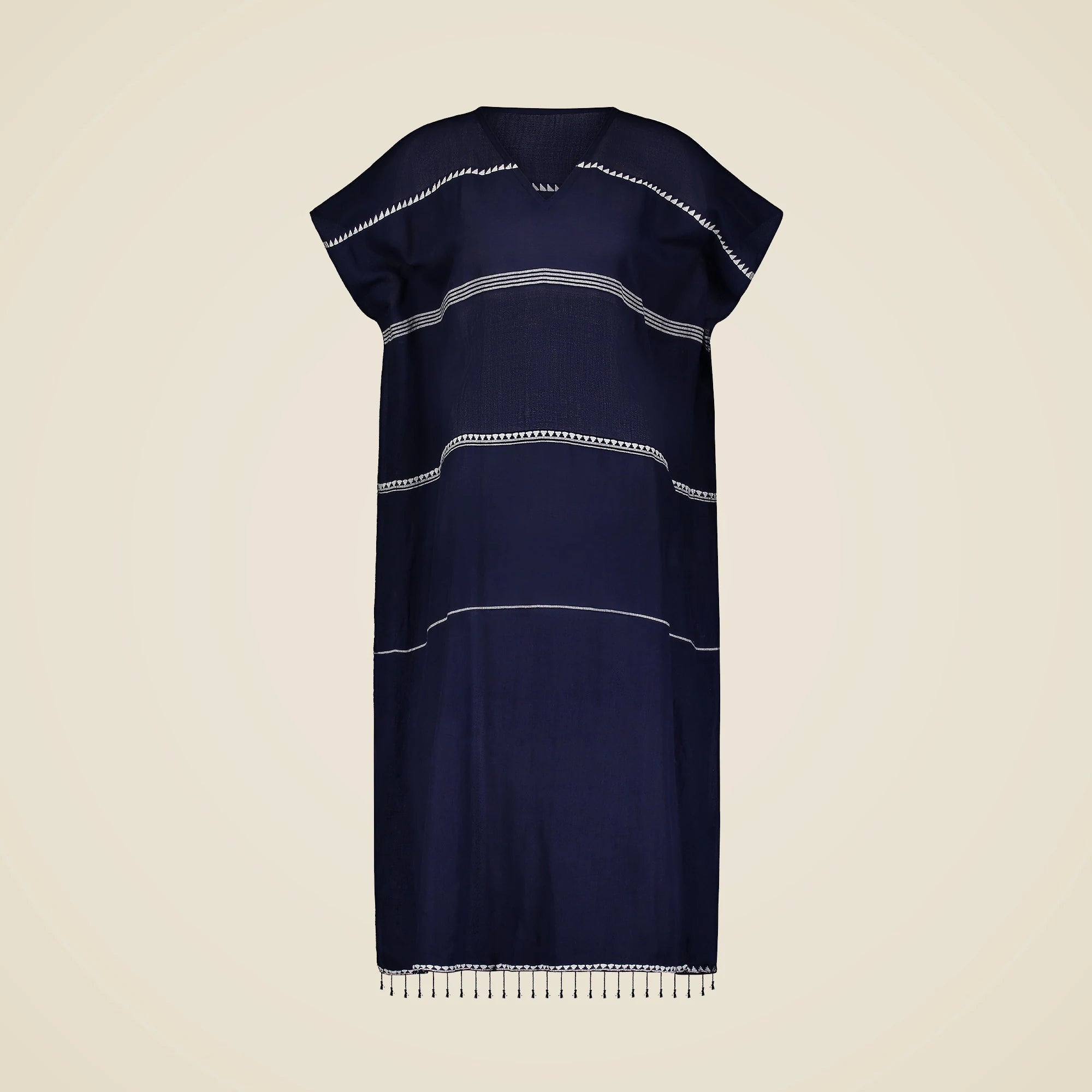 Supermodel and activist Liya Kebede started this handcrafted apparel and home collection - named for the Ethiopian word meaning "to bloom or flourish" - and employs local African artisans to create its unique statement pieces. Featuring delicate Tibeb bands on a rich silhouette, the Nunu line is a chic and modern collection. This classic caftan features a plunge neckline, short cap sleeves and a hand-twisted fringe hem, making it the perfect beach cover-up. Handwoven in Ethiopia, this silhouette is made of soft, hand-spun cotton for a light and comfortable feel.
